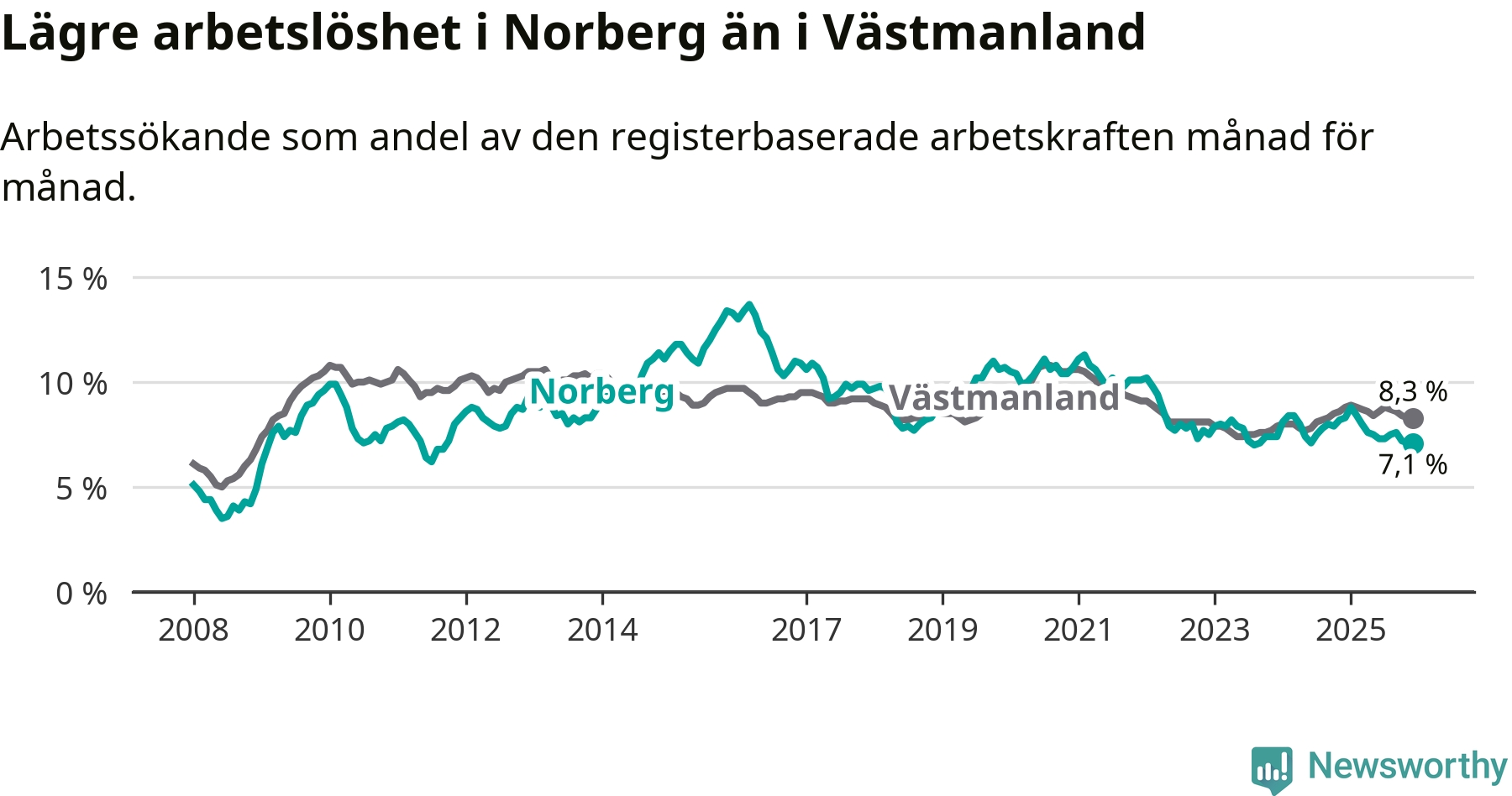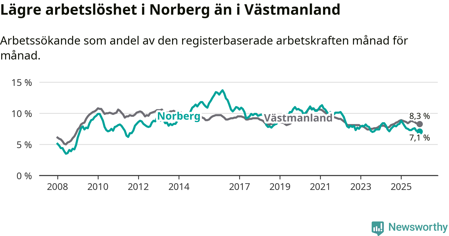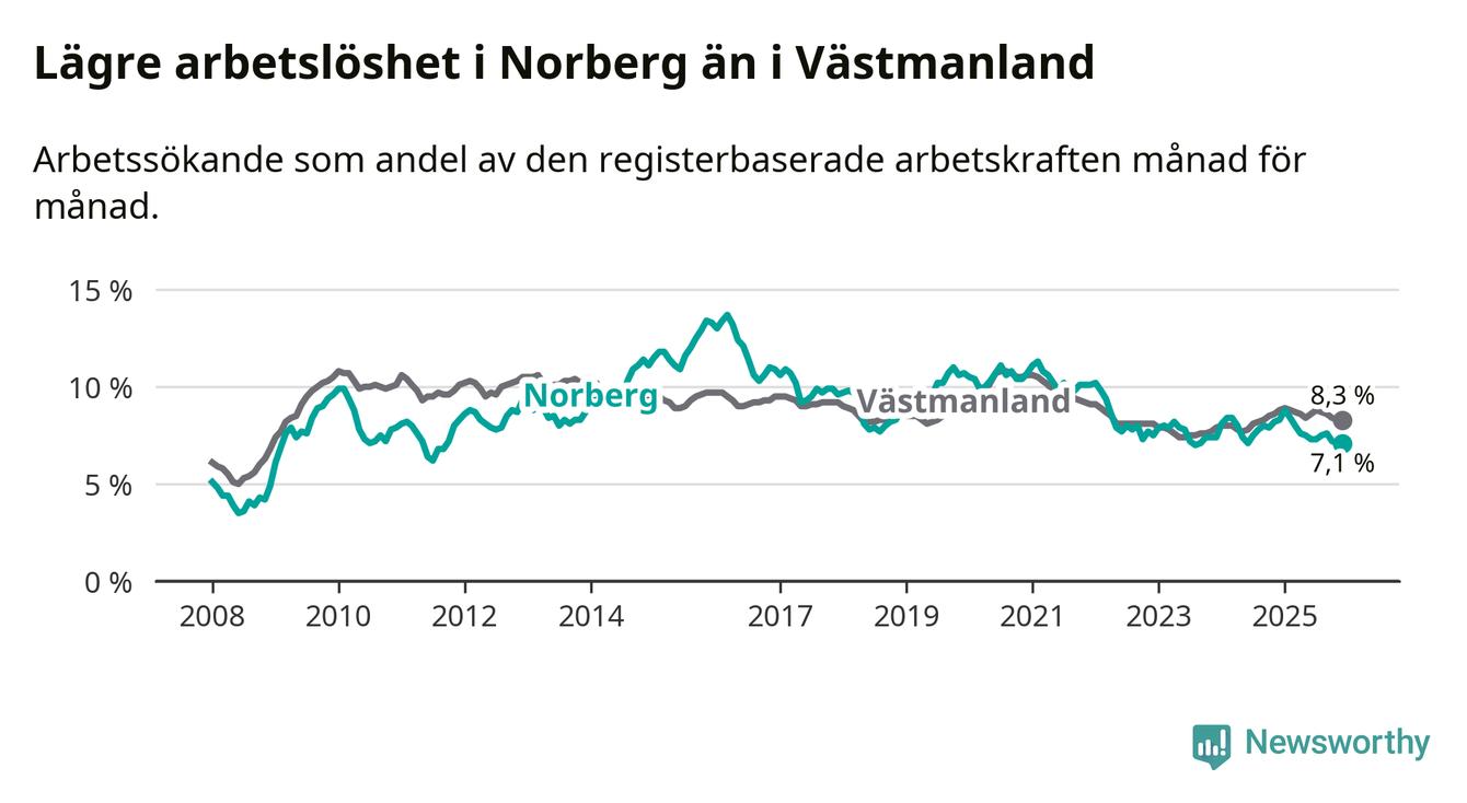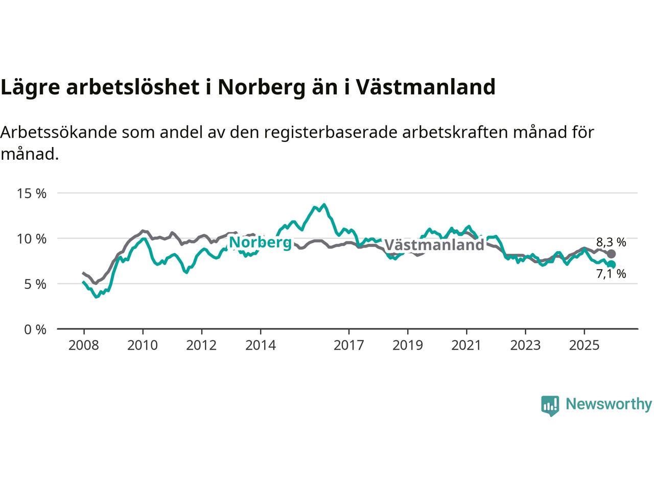 Norberg hade redan tidigare lägre arbetslöshet än snittet i hela Västmanlands län och nu växer klyftan (7,1 procent i kommunen, jämfört med 8,3 procent i hela länet). Surahammar har den lägsta arbetslösheten i länet (6,5 procent), medan Fagersta har den högsta (9,8 procent). För att Norberg skulle komma ner i samma arbetslöshetsnivå som Surahammar skulle 14 personer behöva sysselsättas.