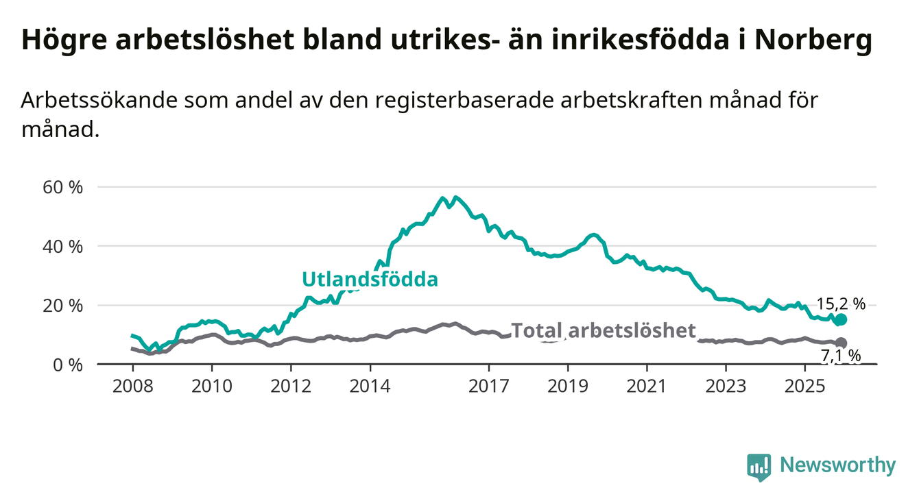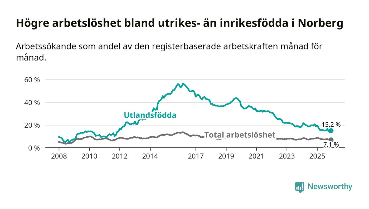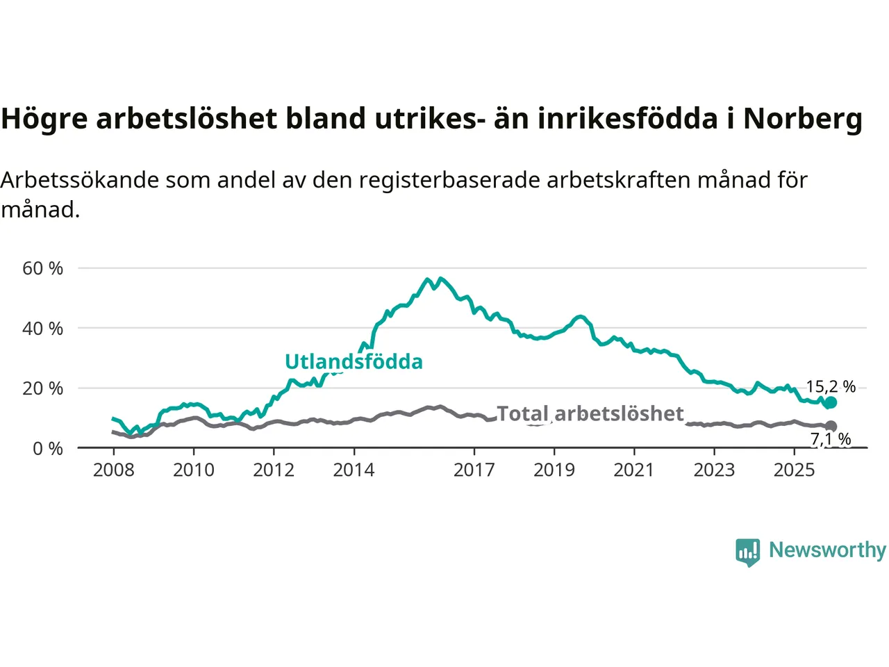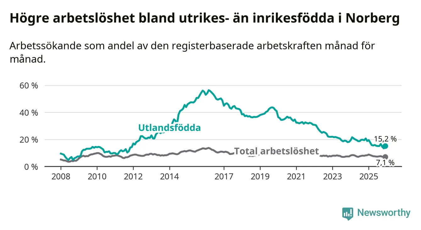 Arbetslösheten bland utlandsfödda var 15,2 procent i Norberg under december månad, motsvarande 50 av 329 personer. Det är 3,6 procentenheter färre än vid samma tidpunkt i fjol (−14 om man räknar personer). Därmed är de utlandsföddas arbetslöshet lägre än vid samma tidpunkt i fjol för elfte månaden i följd. Sedan januari 2025 har arbetslösheten bland utlandsfödda minskat från 19,5 till 15,2 procent.