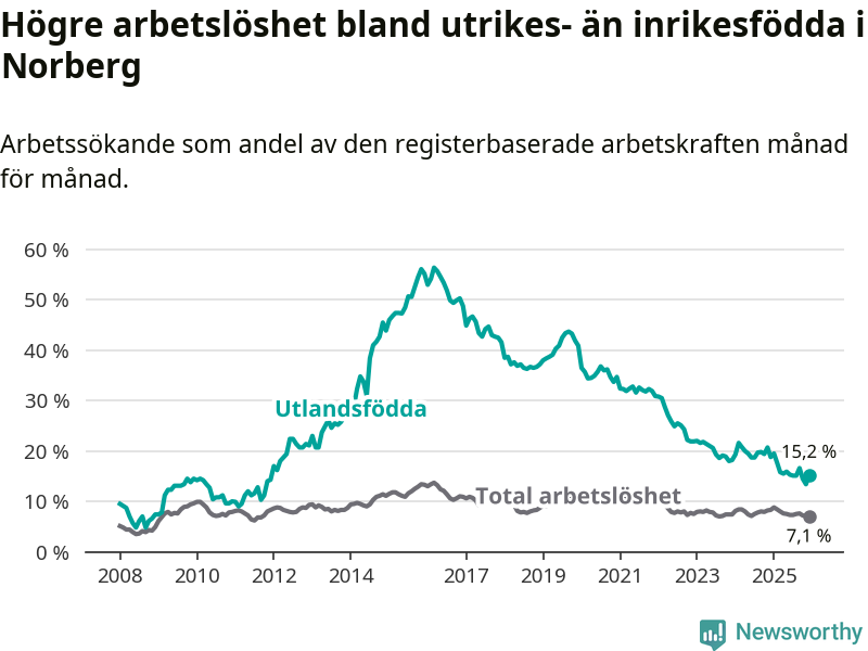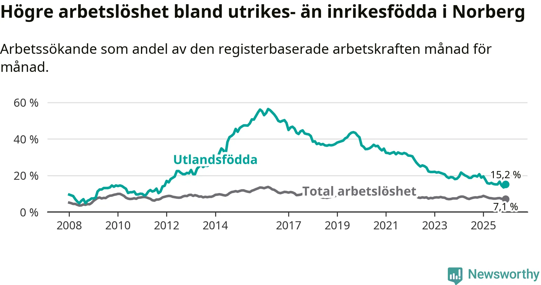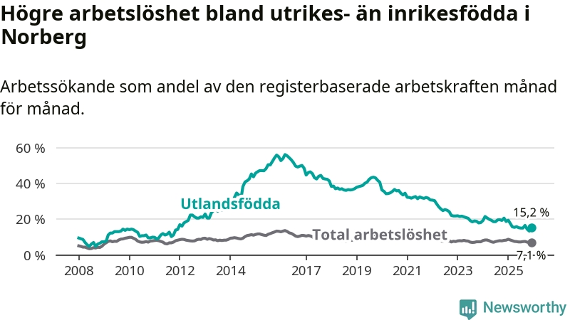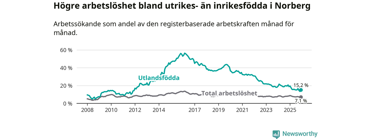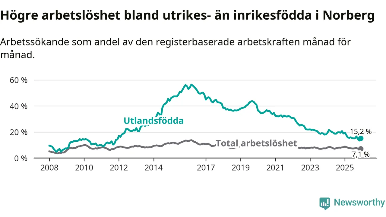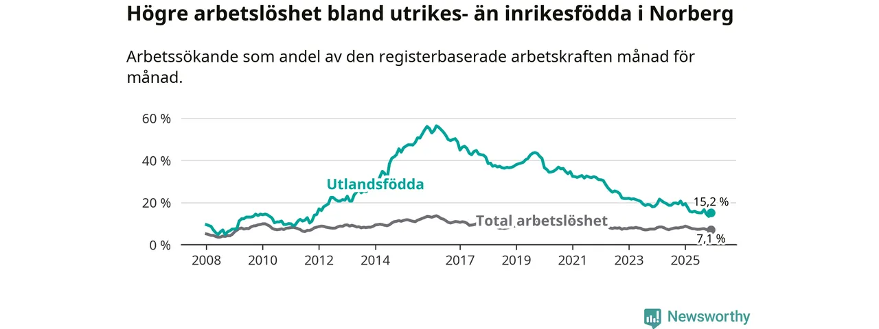 Arbetslösheten bland utlandsfödda var 15,2 procent i Norberg under december månad, motsvarande 50 av 329 personer. Det är 3,6 procentenheter färre än vid samma tidpunkt i fjol (−14 om man räknar personer). Därmed är de utlandsföddas arbetslöshet lägre än vid samma tidpunkt i fjol för elfte månaden i följd. Sedan januari 2025 har arbetslösheten bland utlandsfödda minskat från 19,5 till 15,2 procent.
