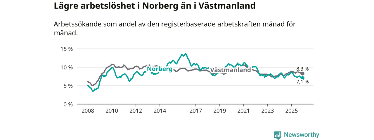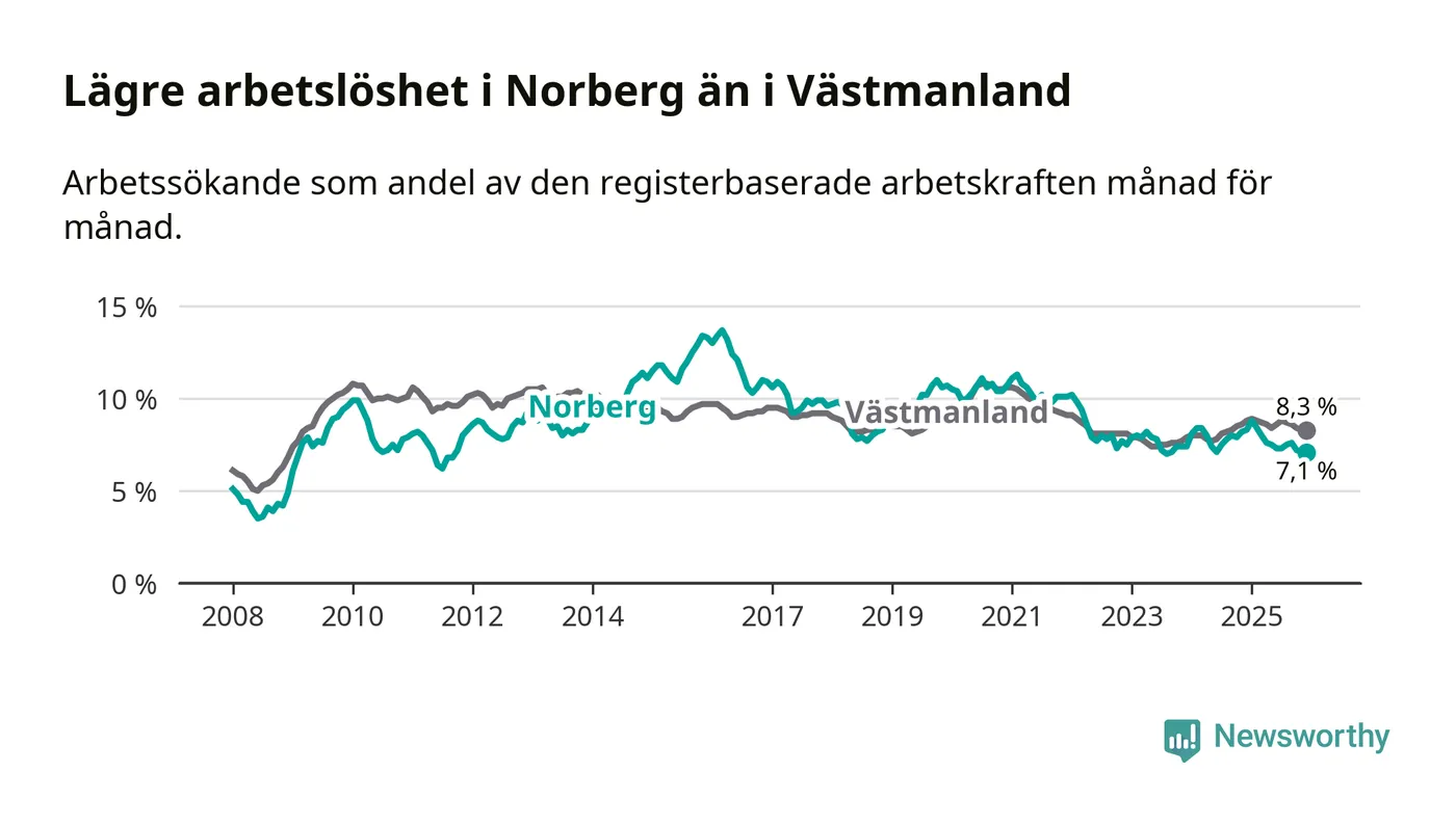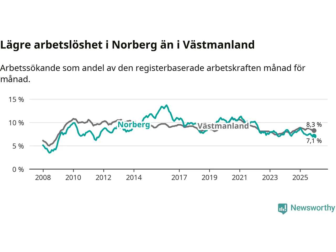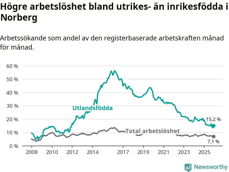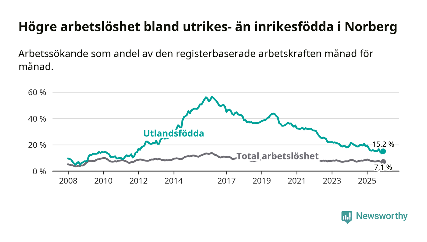 Arbetslösheten bland utlandsfödda var 15,2 procent i Norberg under december månad, motsvarande 50 av 329 personer. Det är 3,6 procentenheter färre än vid samma tidpunkt i fjol (−14 om man räknar personer). Därmed är de utlandsföddas arbetslöshet lägre än vid samma tidpunkt i fjol för elfte månaden i följd. Sedan januari 2025 har arbetslösheten bland utlandsfödda minskat från 19,5 till 15,2 procent.