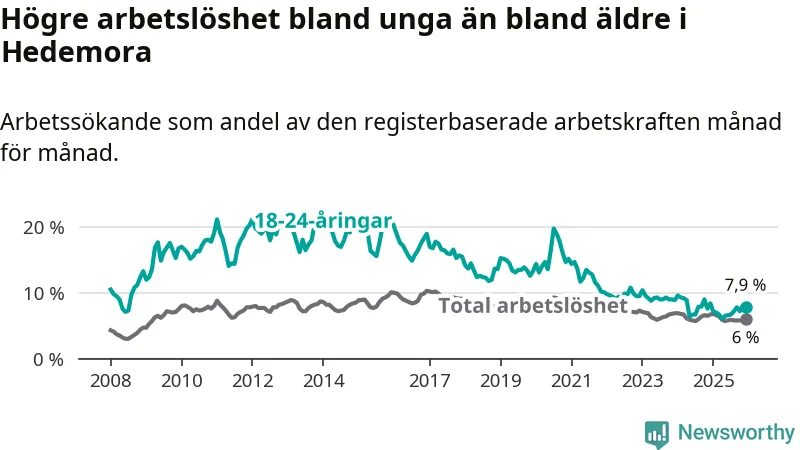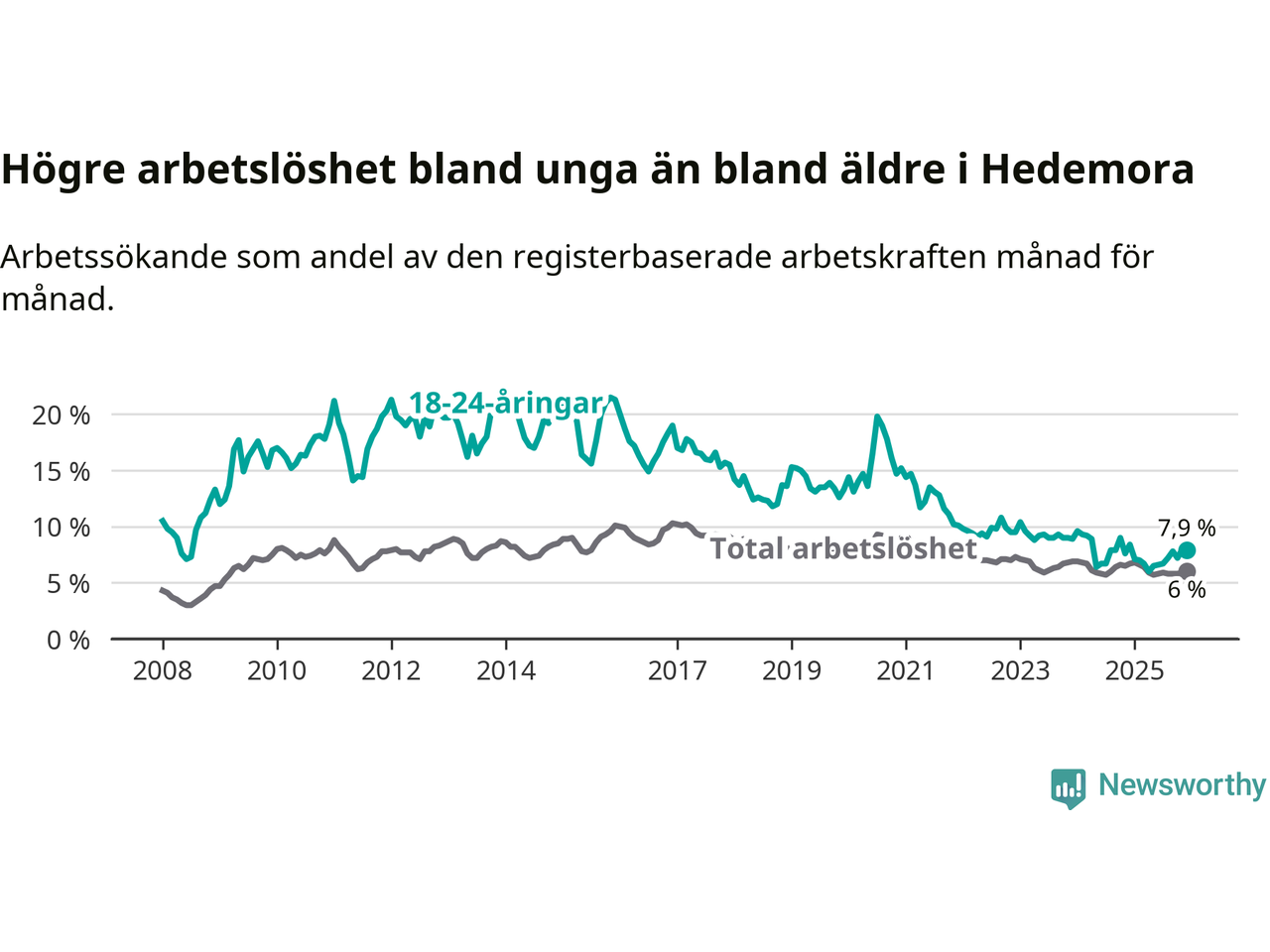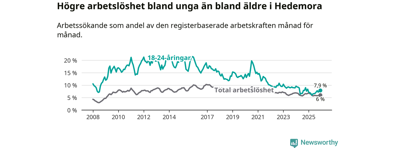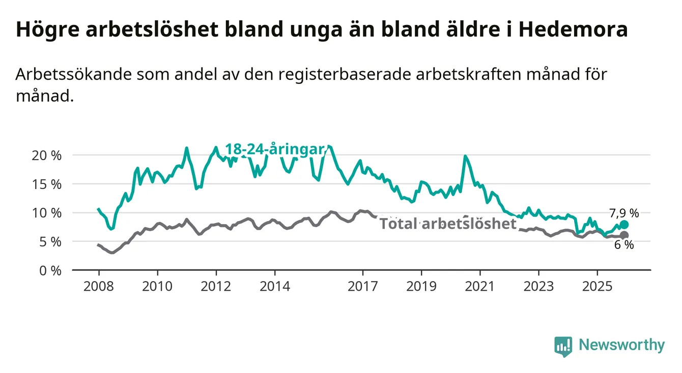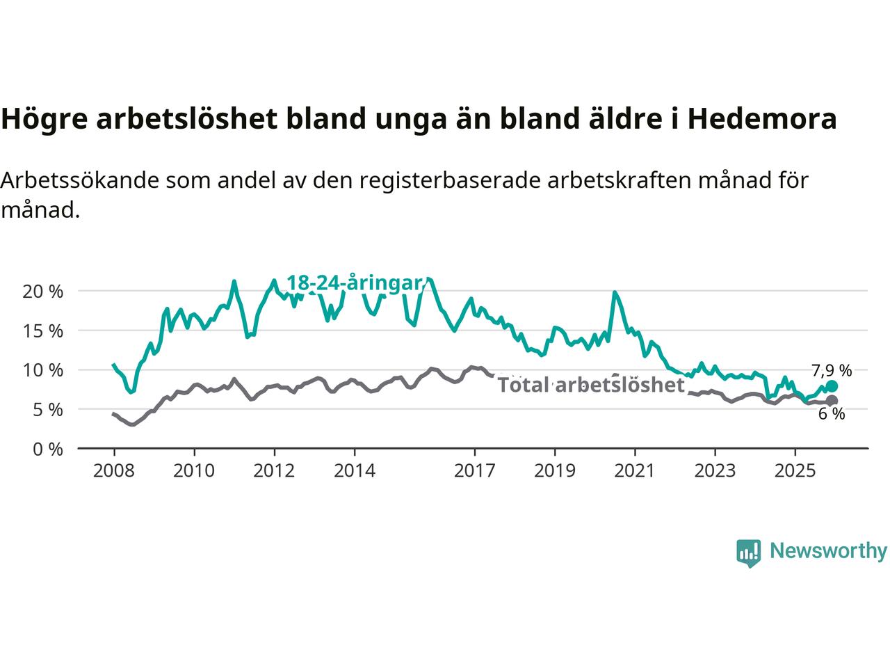 Precis som den totala arbetslösheten ligger ungdomsarbetslösheten i Hedemora högre än i Dalarna som helhet. Skillnaden mellan kommunen och länet är 2,0 procentenheter.