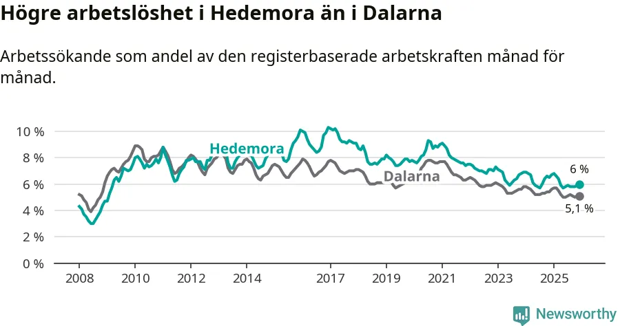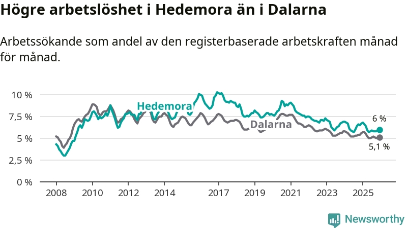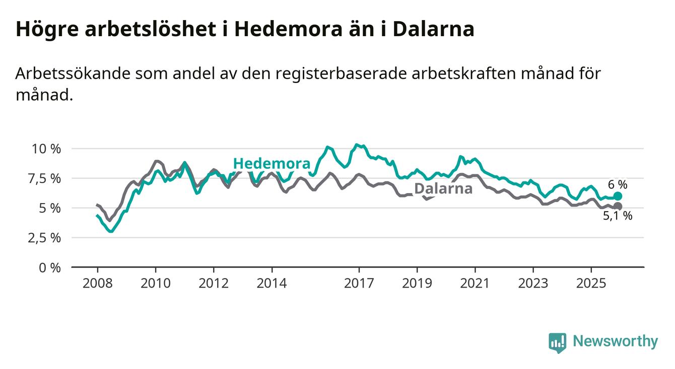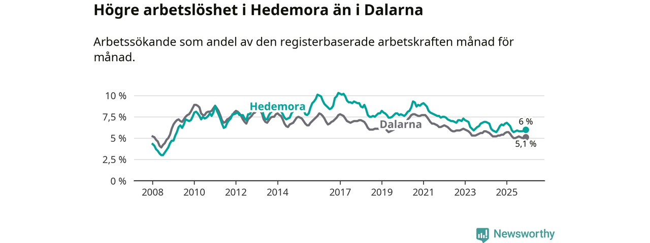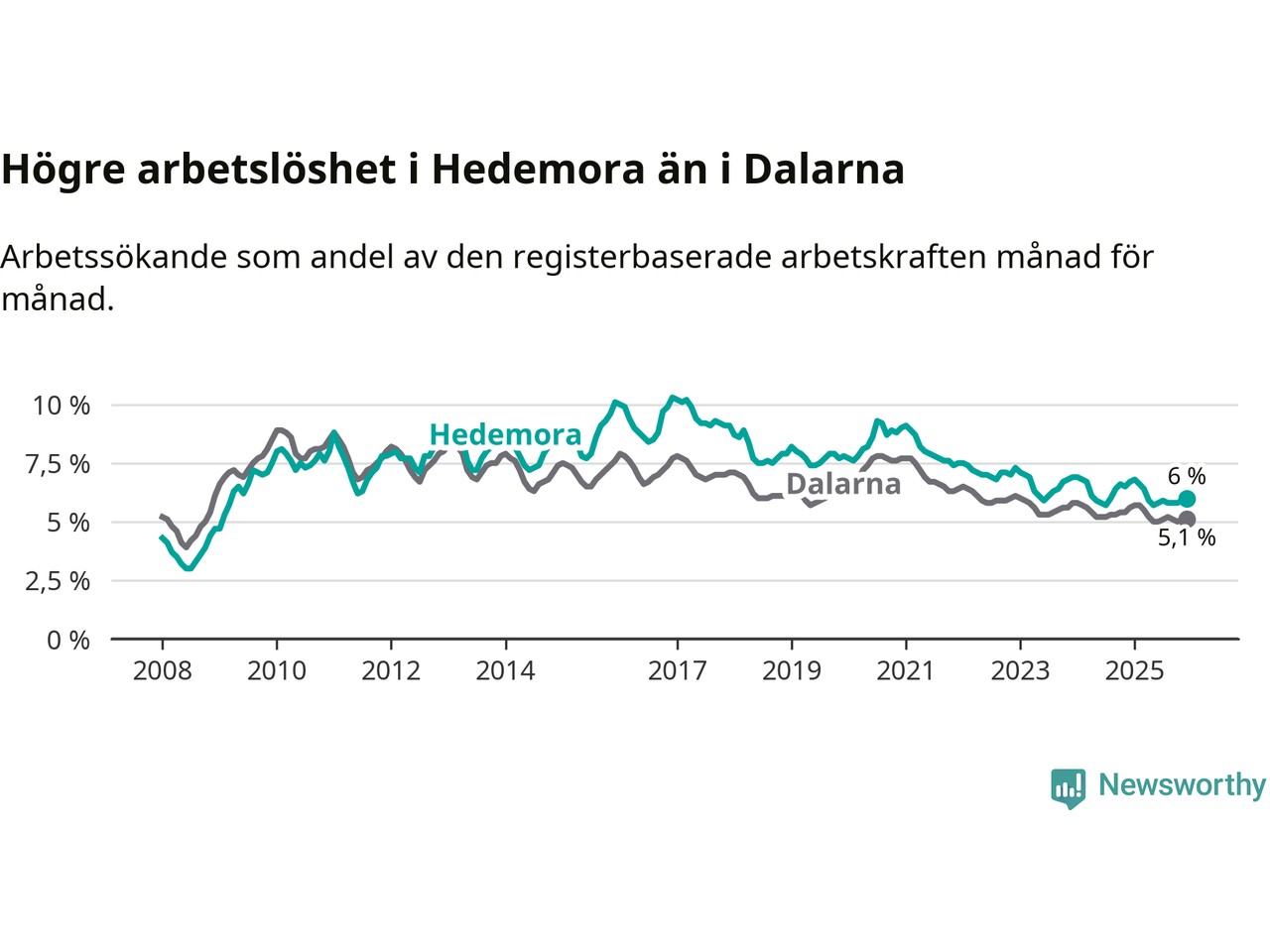 Under december månad rapporterade Hedemora kommun en total arbetslöshet på 6,0 procent. Det är en minskning jämfört med samma tidpunkt i fjol (−0,7 procentenheter). Även i Dalarnas län sjunker arbetslösheten .