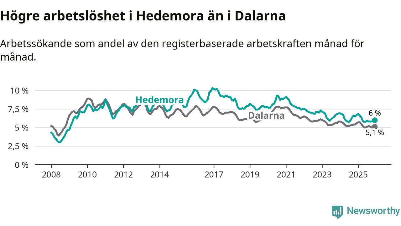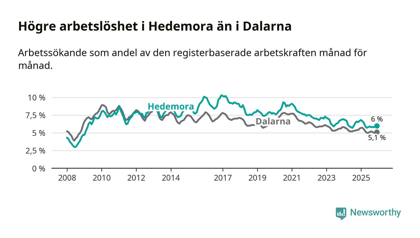 Även om arbetslösheten i Hedemora alltså minskar, så ligger den fortfarande över snittet i hela Dalarnas län (6,0 procent i kommunen, jämfört med 5,1 procent i hela länet). Mora har den lägsta arbetslösheten i länet (3,3 procent), medan Avesta har den högsta (7,5 procent). För att Hedemora skulle komma ner i samma arbetslöshetsnivå som Mora skulle 187 personer behöva sysselsättas.