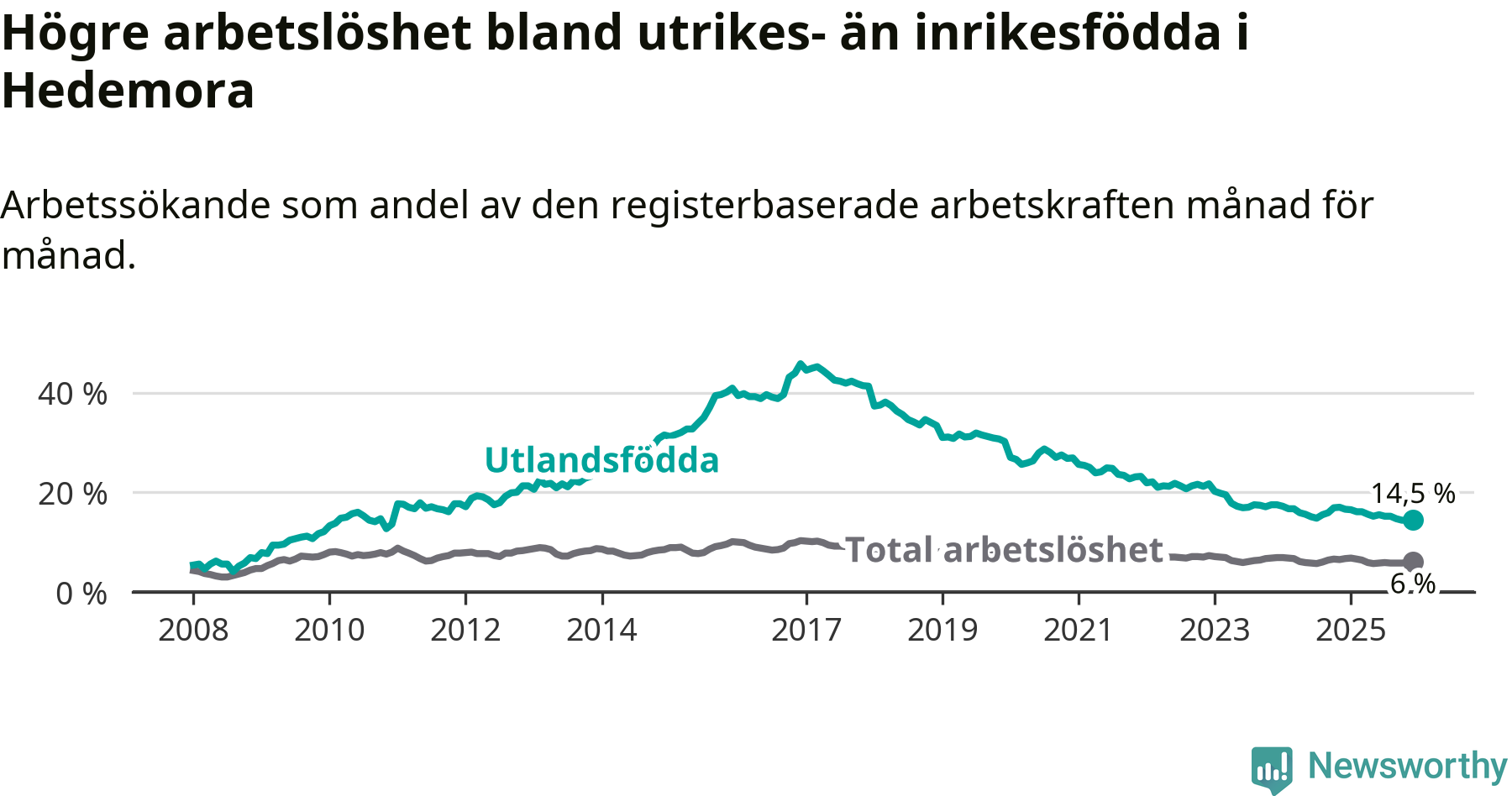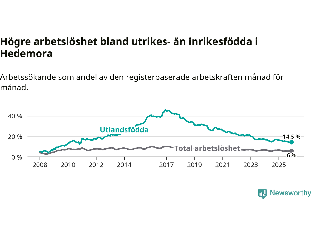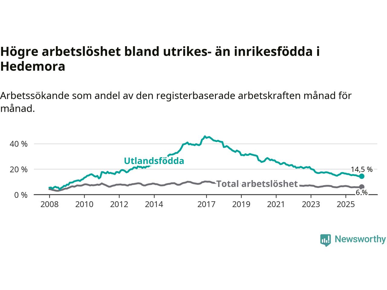 Skillnaden i arbetslöshet mellan utrikesfödda och hela befolkningen är 8,5 procentenheter i Hedemora. Det är en mindre skillnad än för ett år sedan (−1,4 procentenheter).