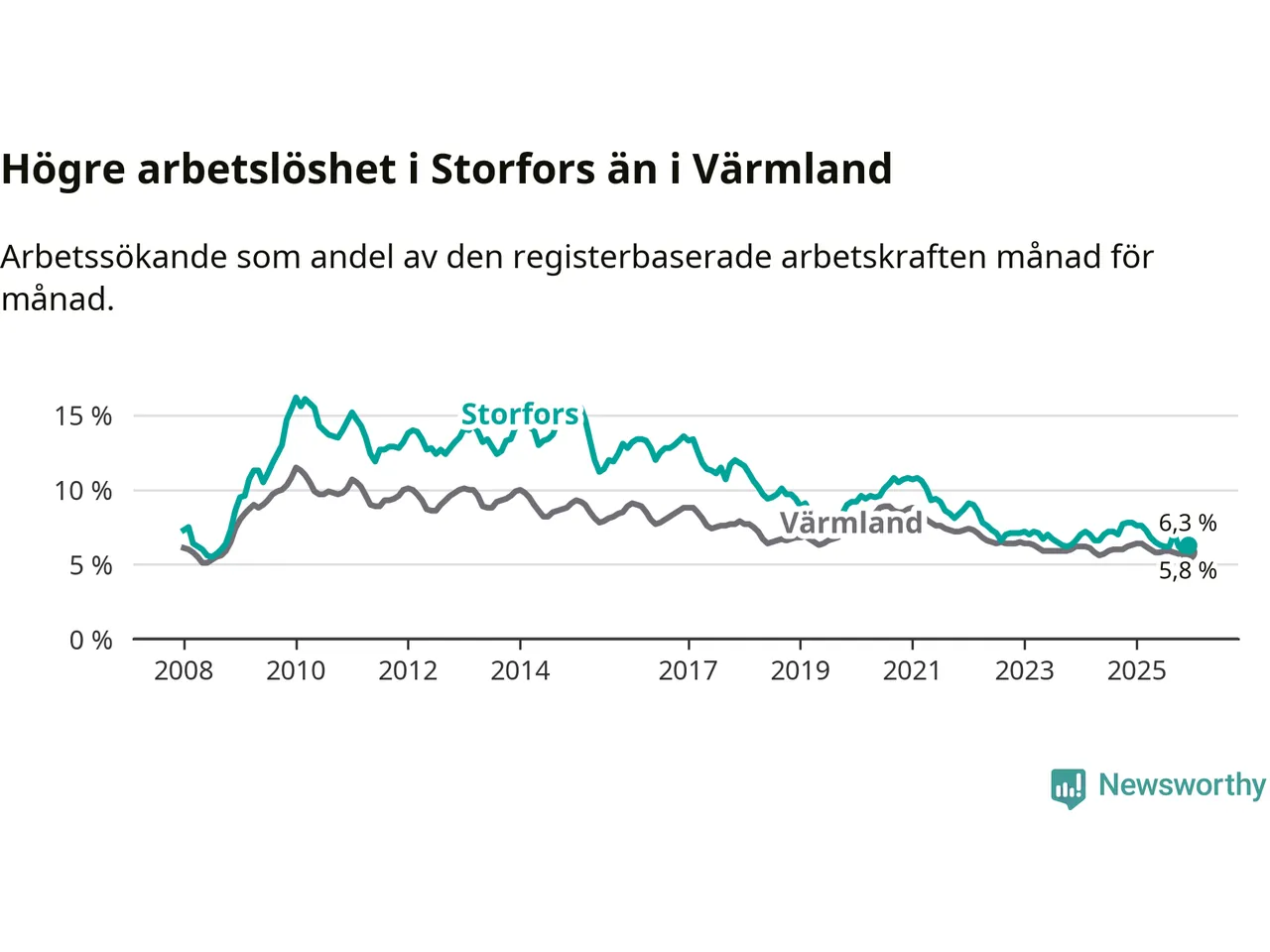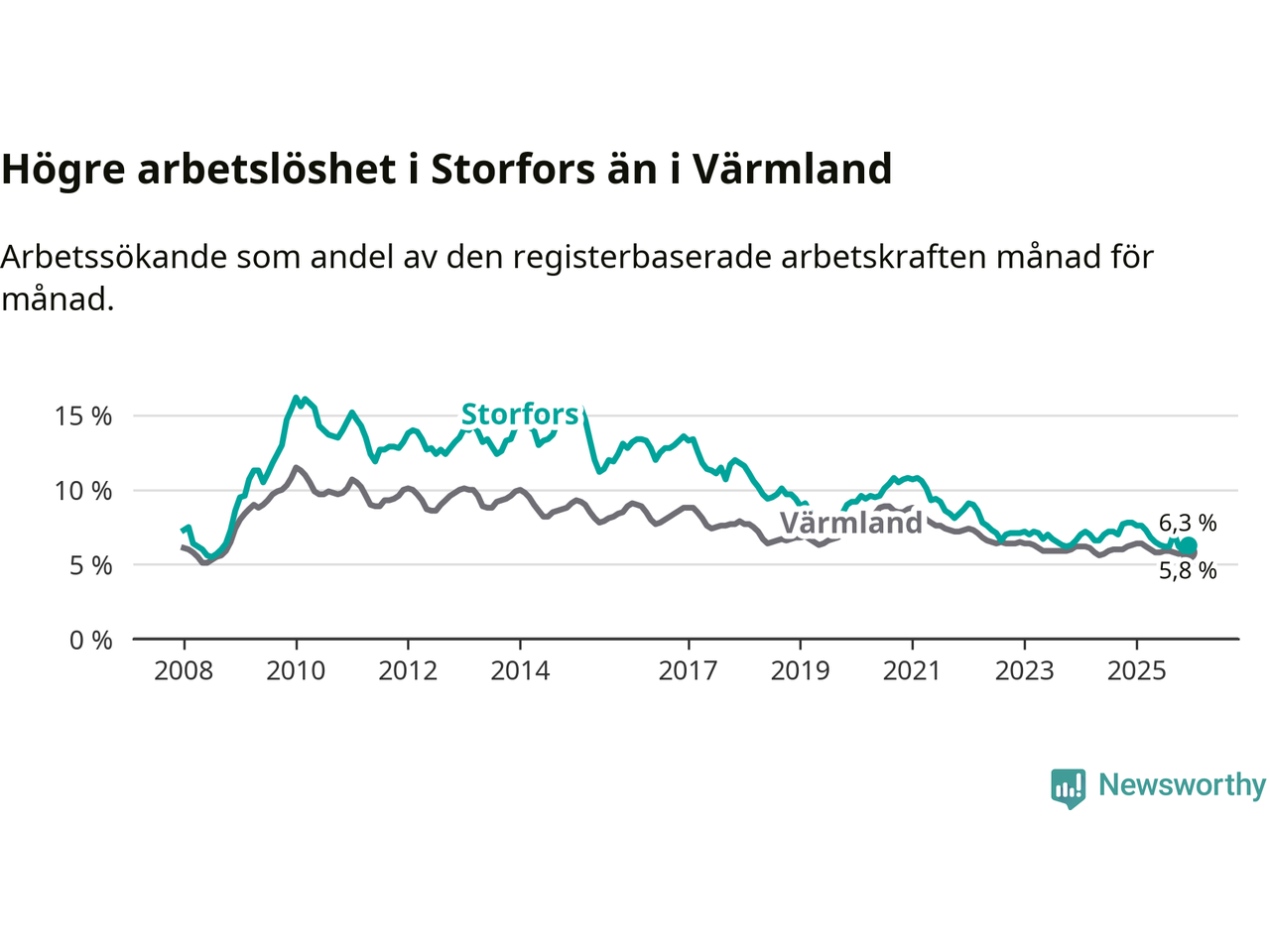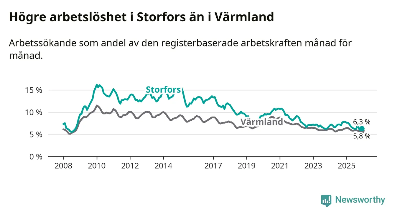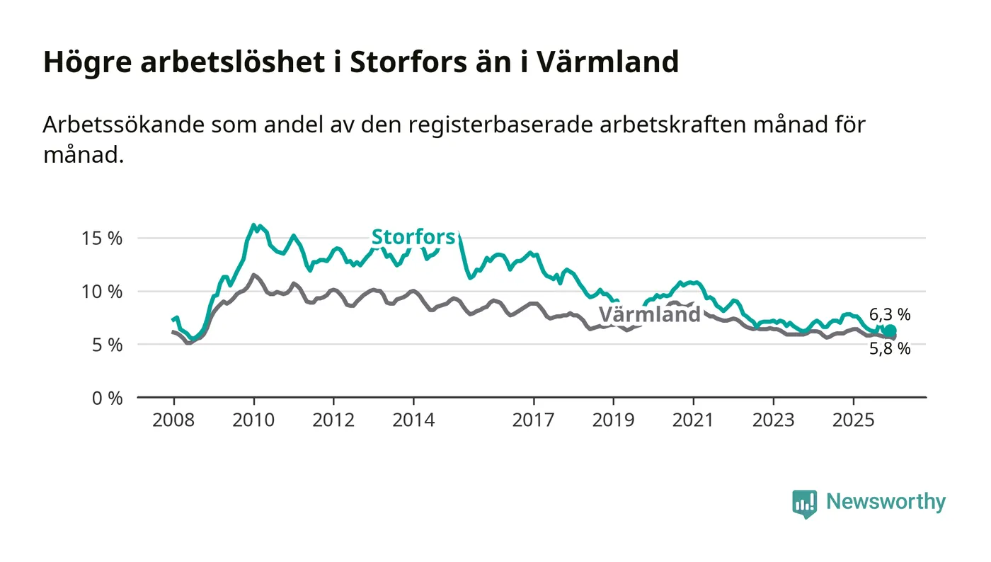 Anmärkningsvärt är att arbetslösheten nu, för första gången sedan september 2024, är lägre i Storfors än snittet i Värmland.