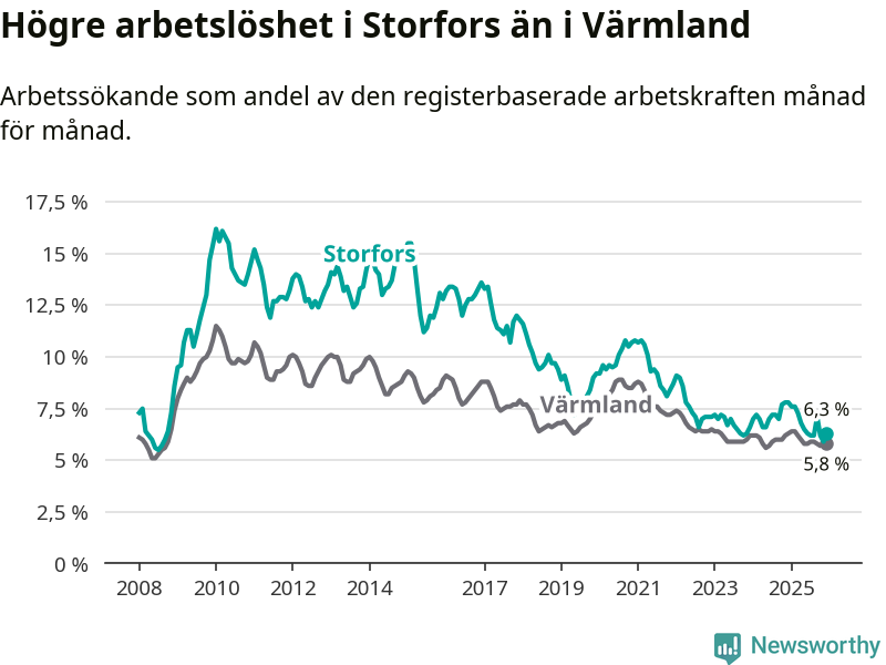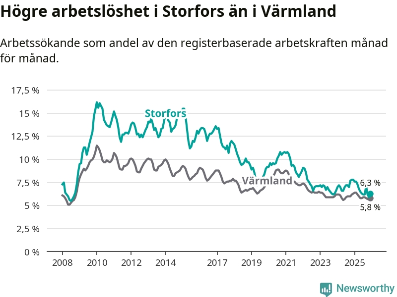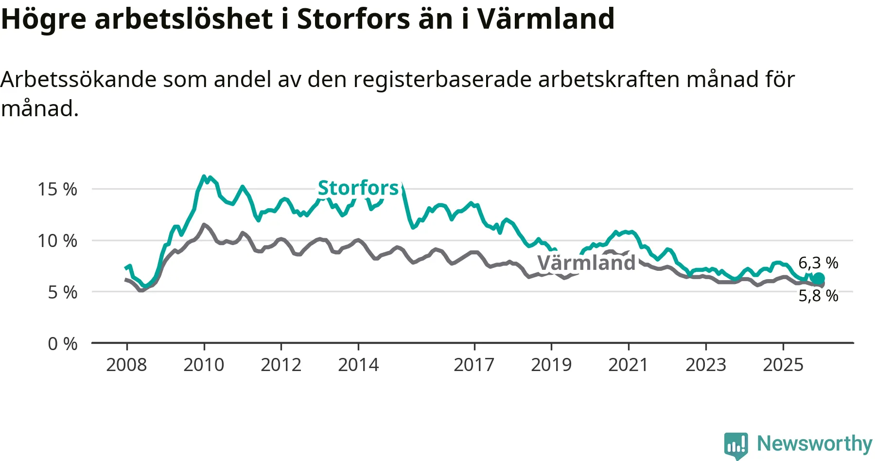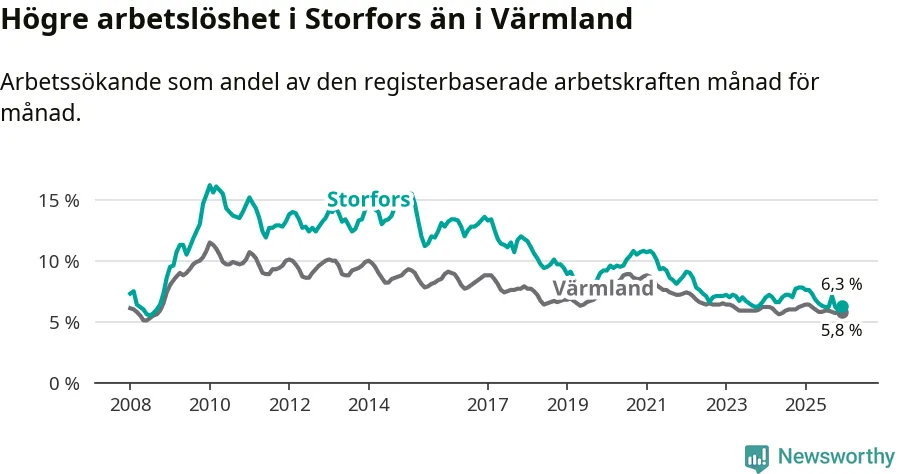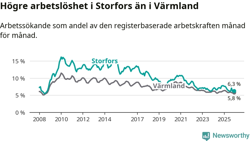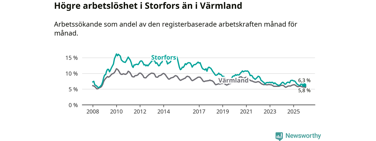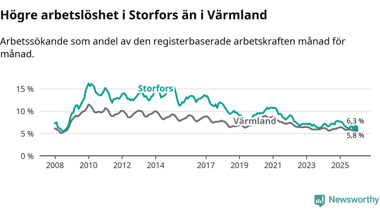 Anmärkningsvärt är att arbetslösheten nu, för första gången sedan september 2024, är lägre i Storfors än snittet i Värmland.