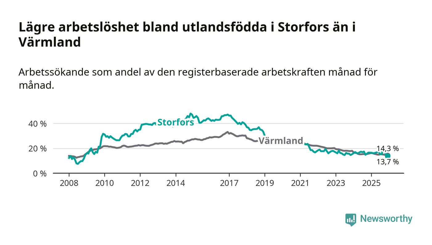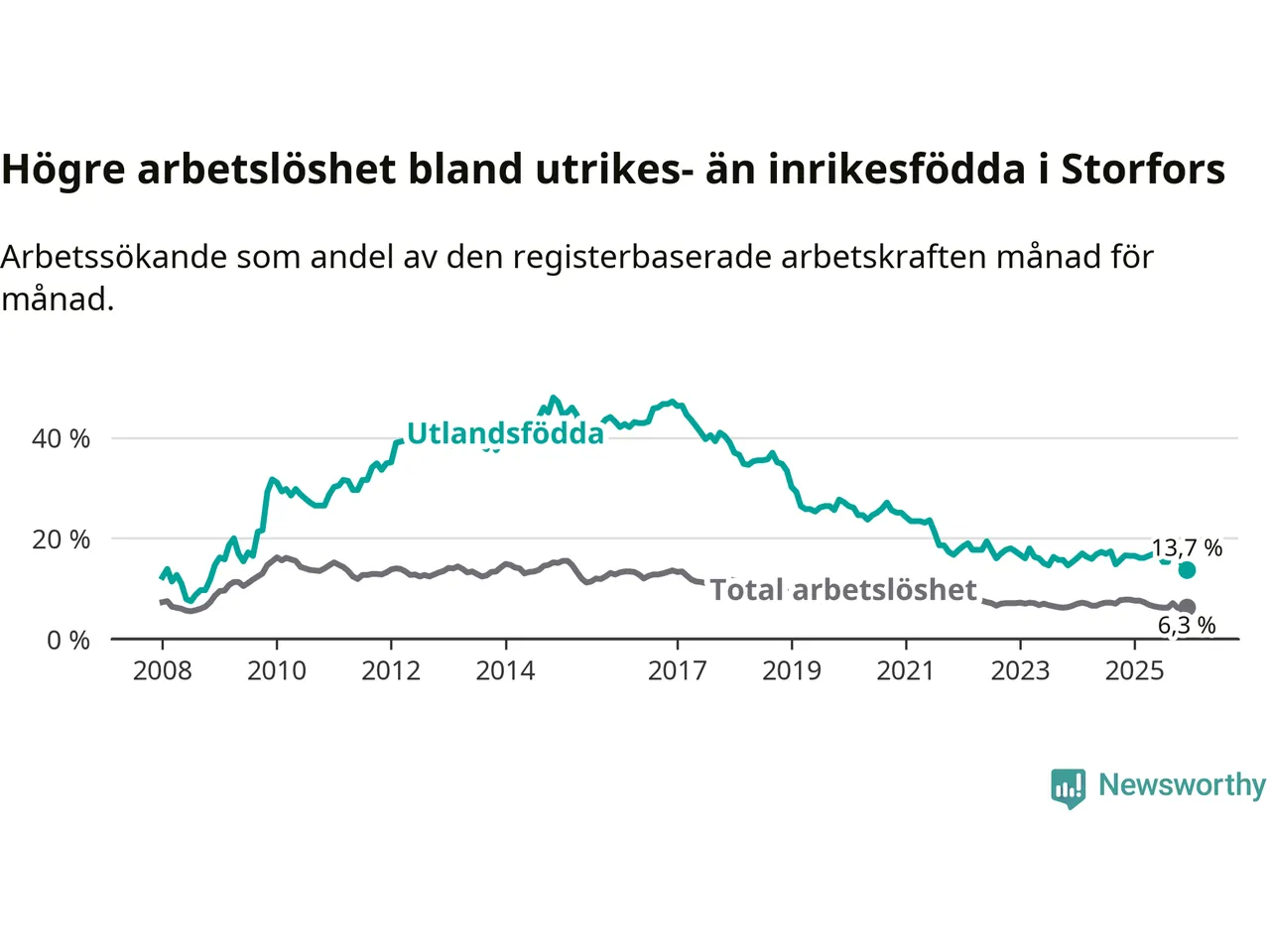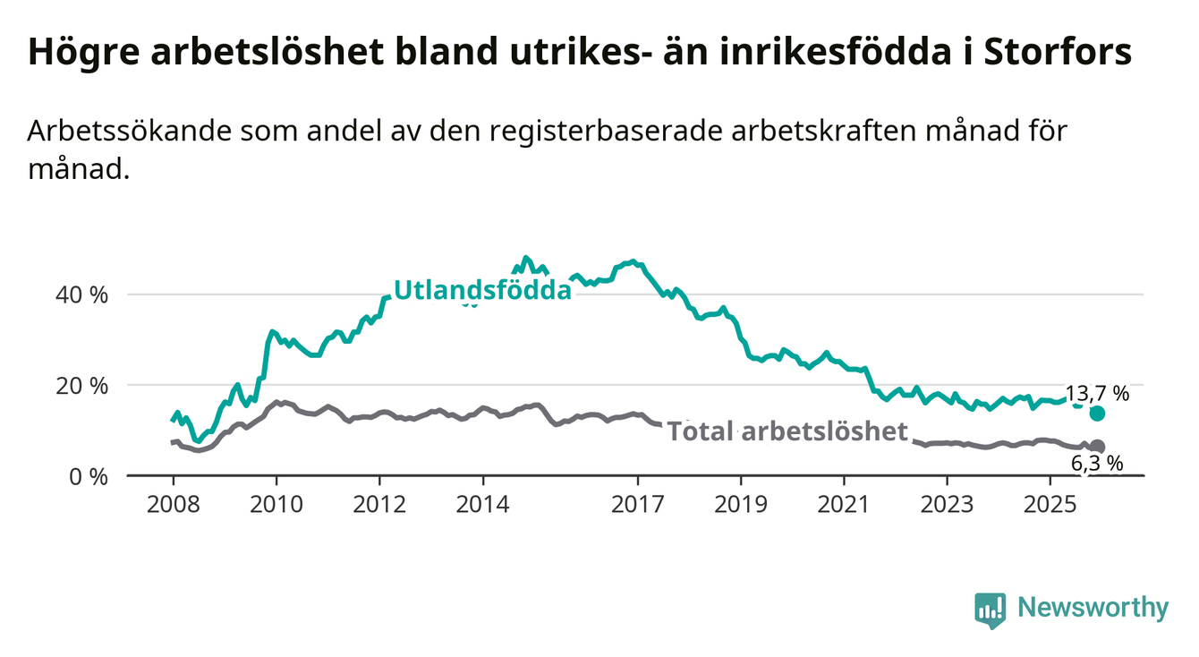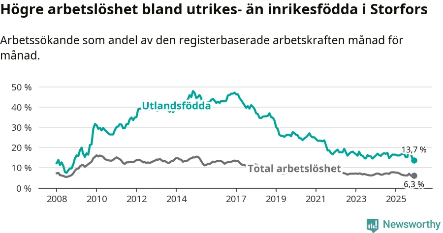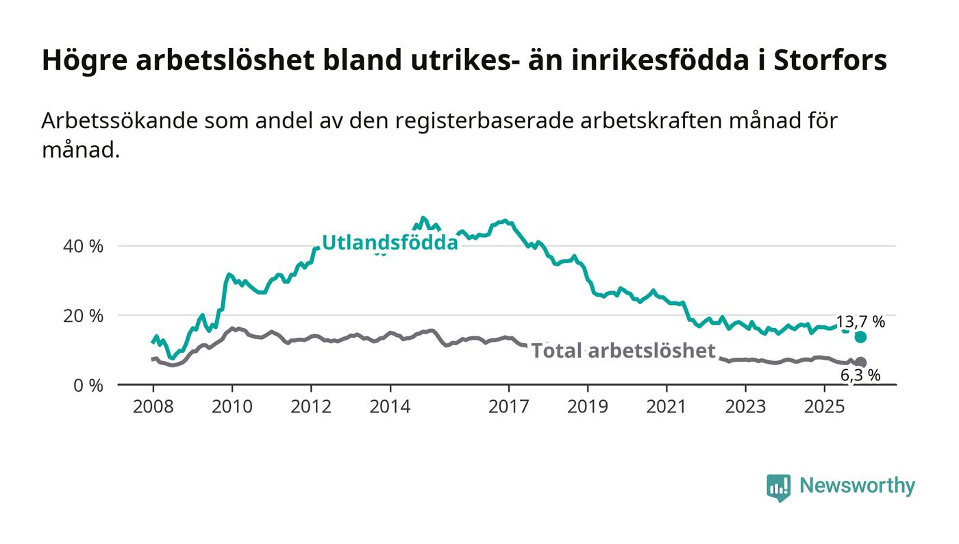 Skillnaden i arbetslöshet mellan utrikesfödda och hela befolkningen är 7,4 procentenheter i Storfors. Det är en mindre skillnad än för ett år sedan (−1,3 procentenheter).