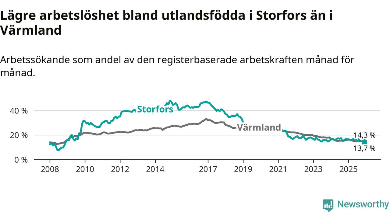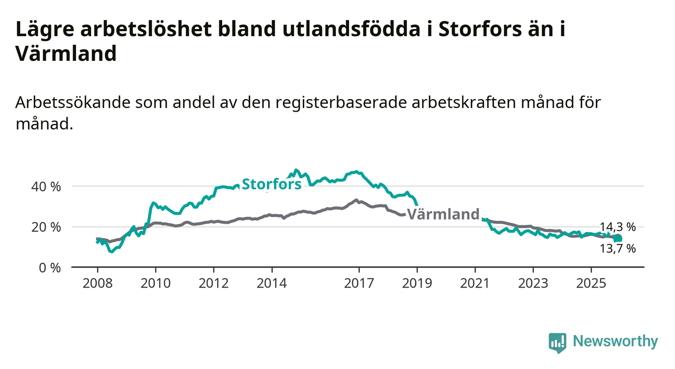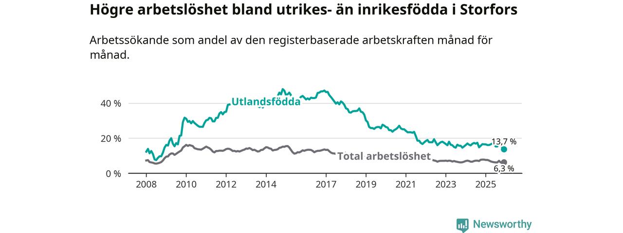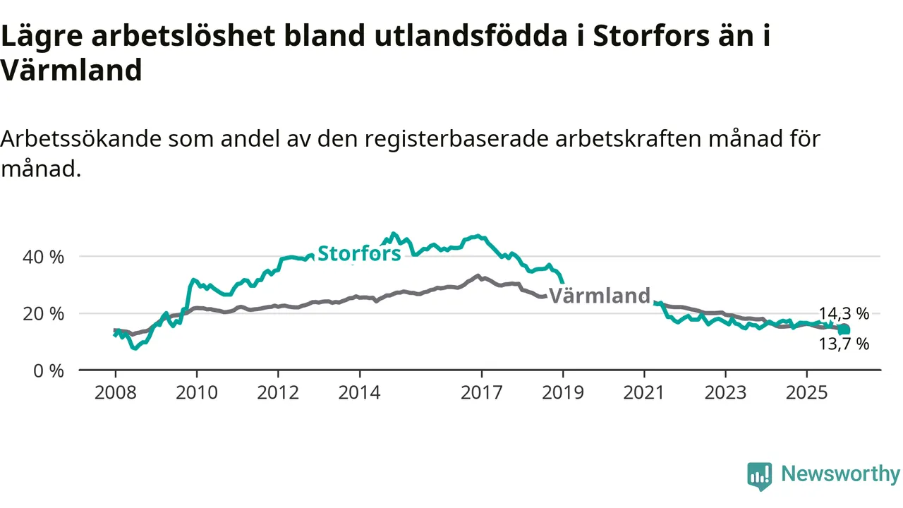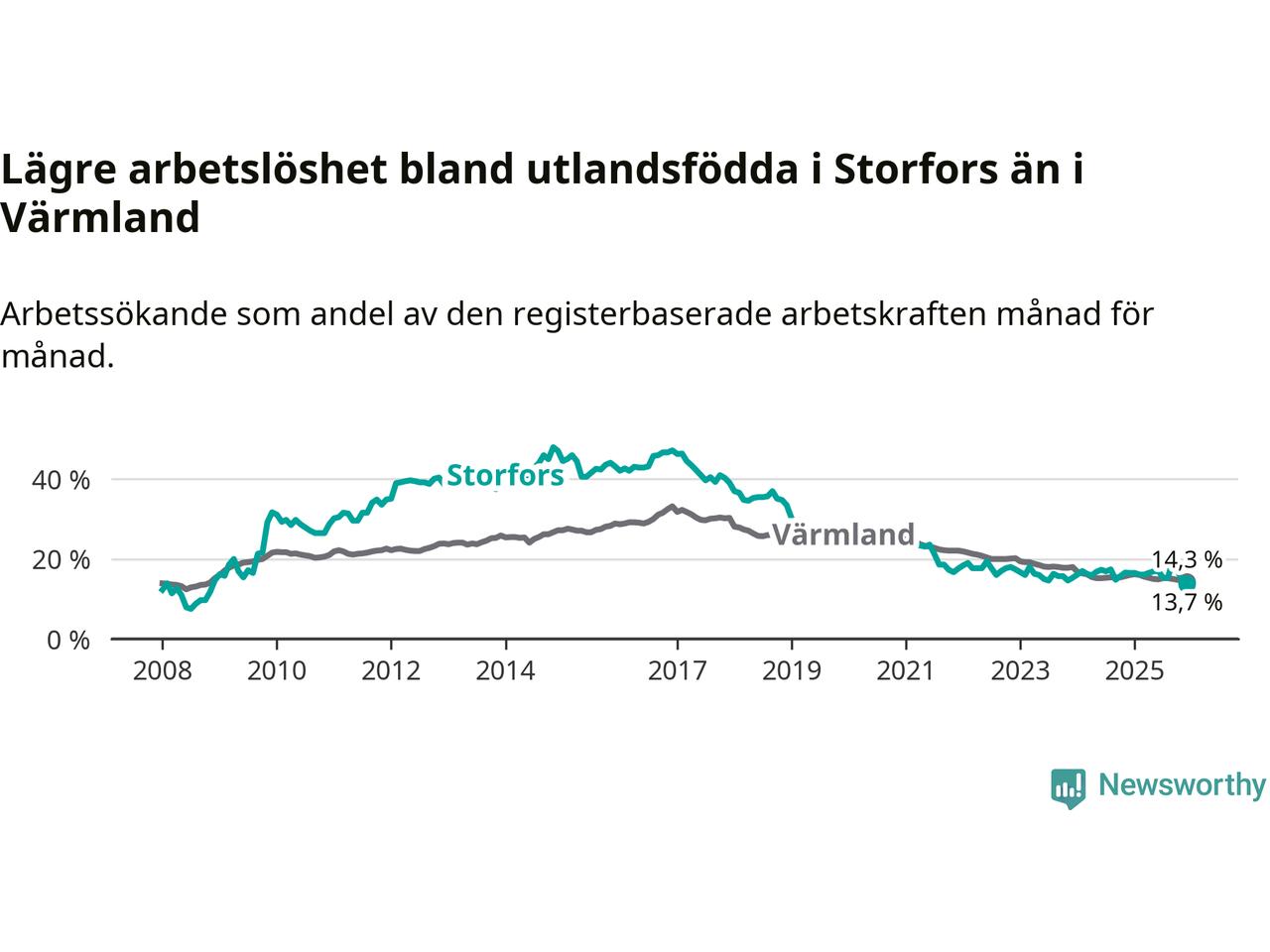 Skillnaden i arbetslöshet mellan utrikesfödda och hela befolkningen är 7,4 procentenheter i Storfors. Det är en mindre skillnad än för ett år sedan (−1,3 procentenheter).