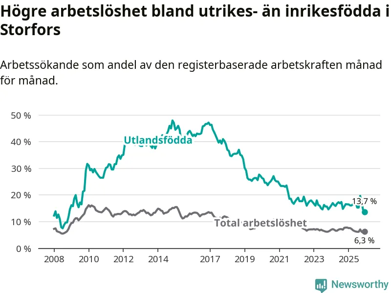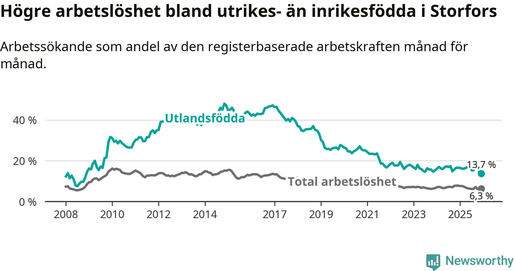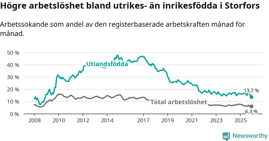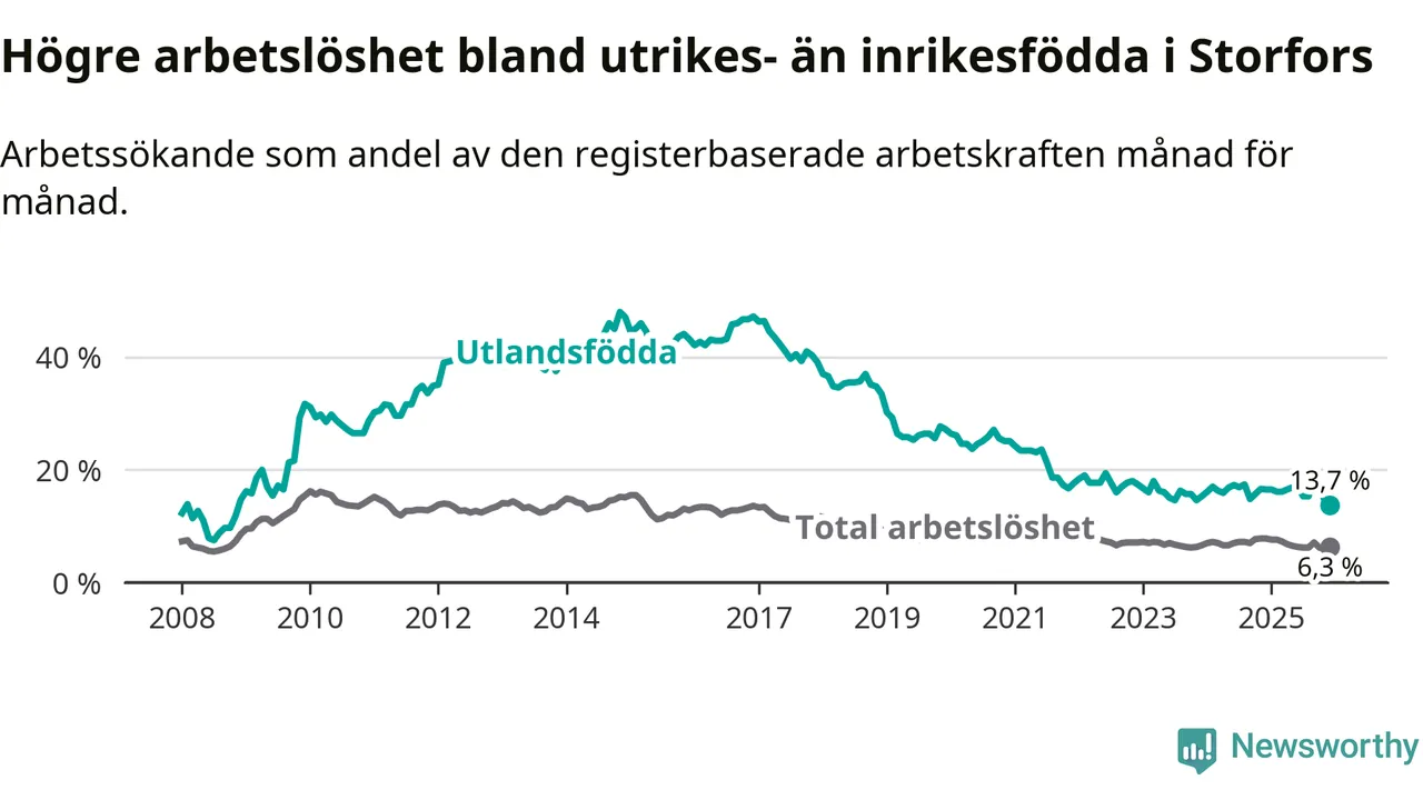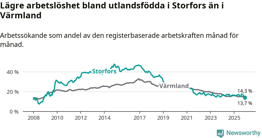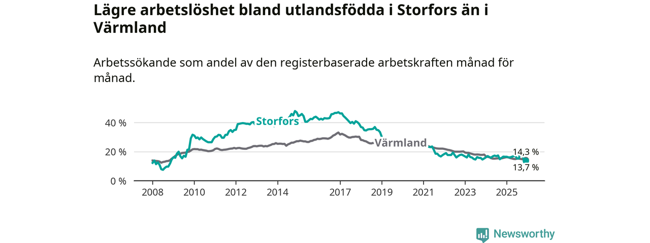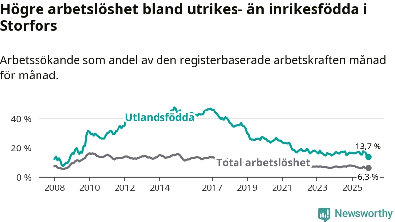 Skillnaden i arbetslöshet mellan utrikesfödda och hela befolkningen är 7,4 procentenheter i Storfors. Det är en mindre skillnad än för ett år sedan (−1,3 procentenheter).