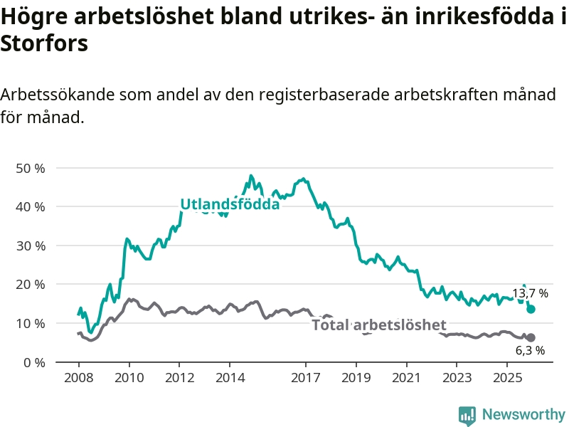 | Bland utlandsfödda | 13,7 % | −2,8 % ▼ | 14,3 % | −1,7 % ▼ | 14,3 % | −1,4 % ▼ |
