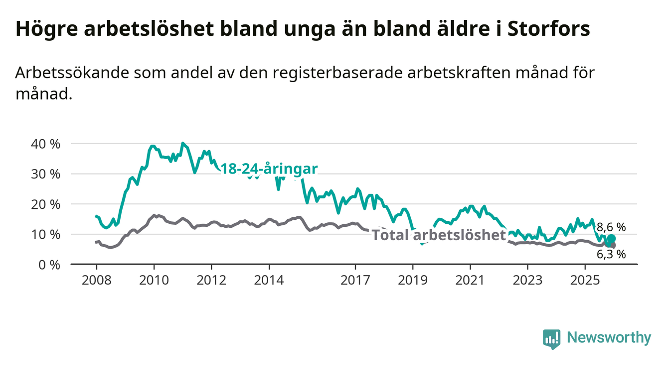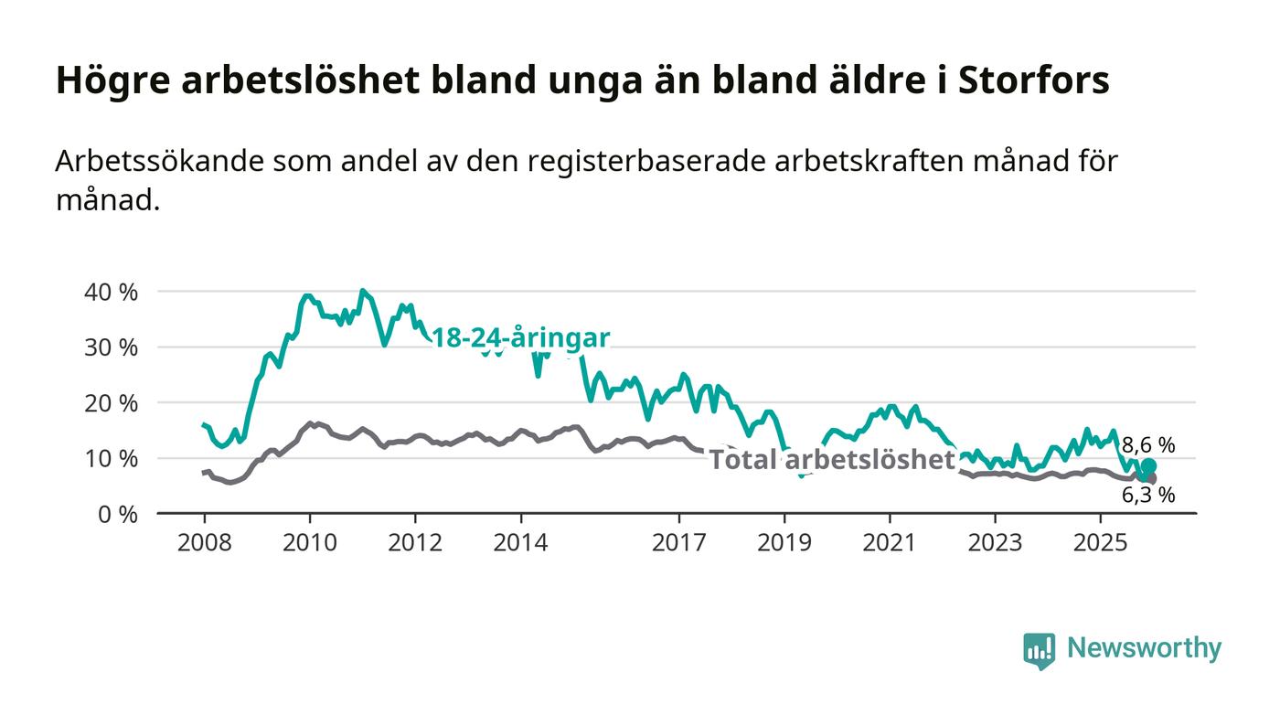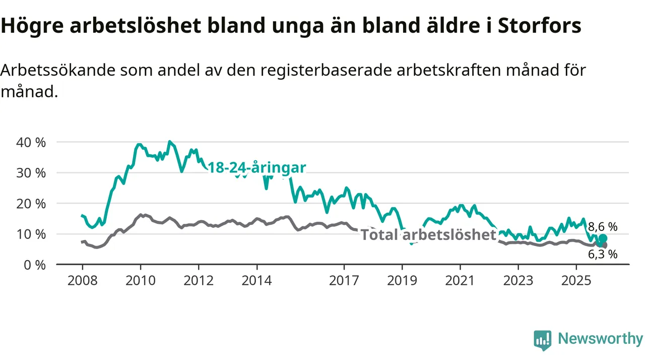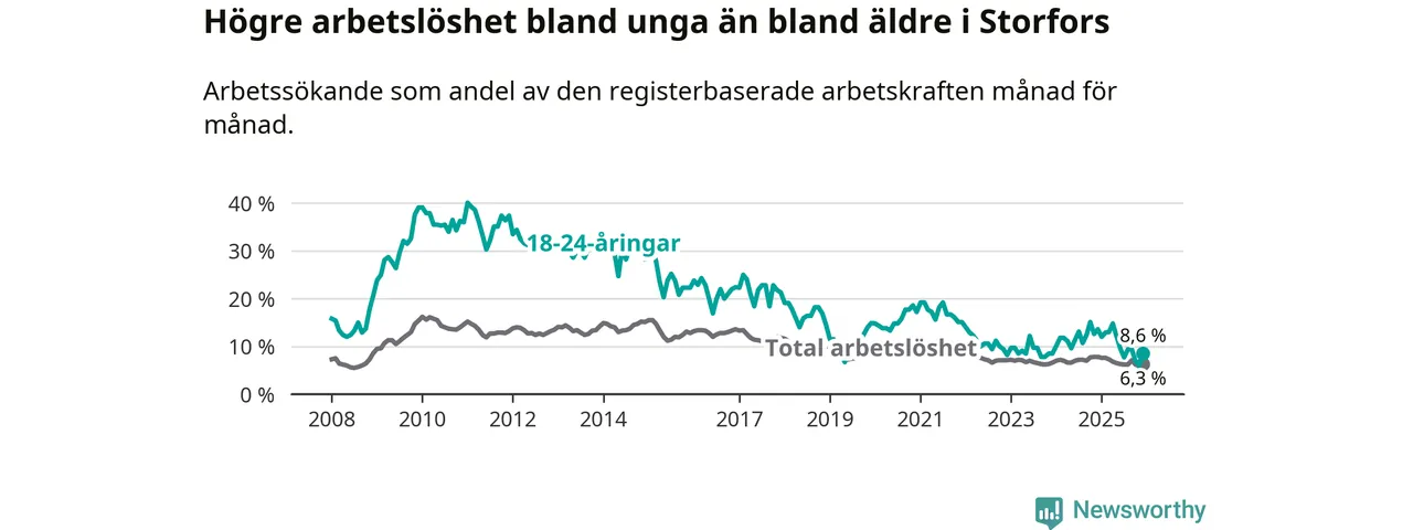 I och med den senaste månadens nedgång har de ungas arbetslöshet i Storfors sjunkit sju månader i följd (ner från 12,1 procent i maj 2025 till 8,6 procent nu).
