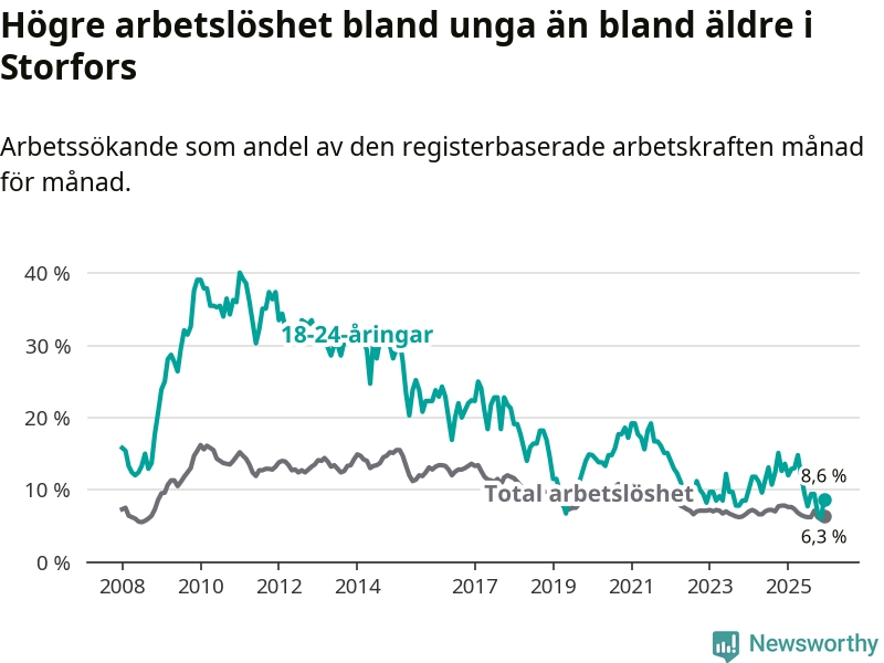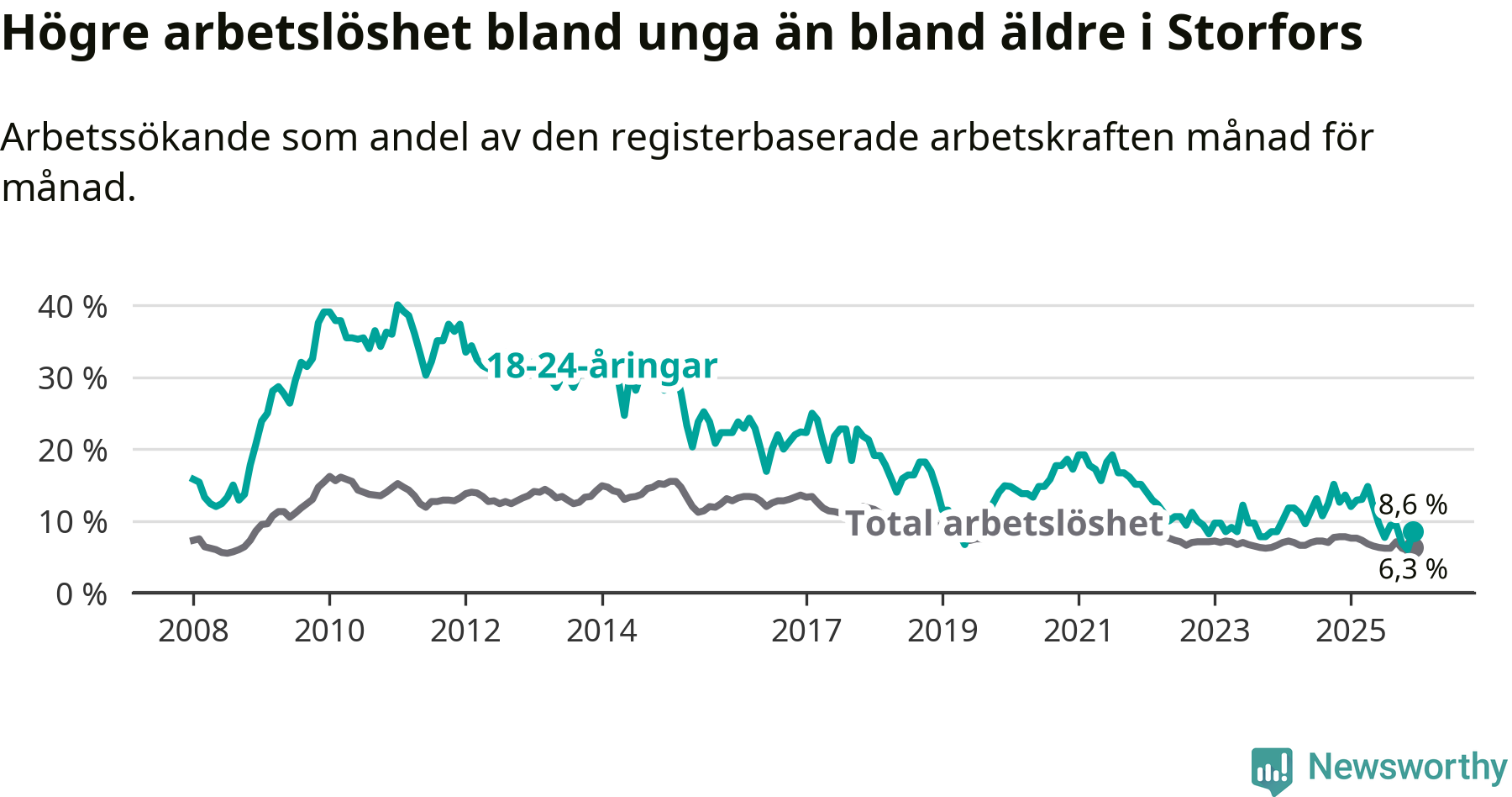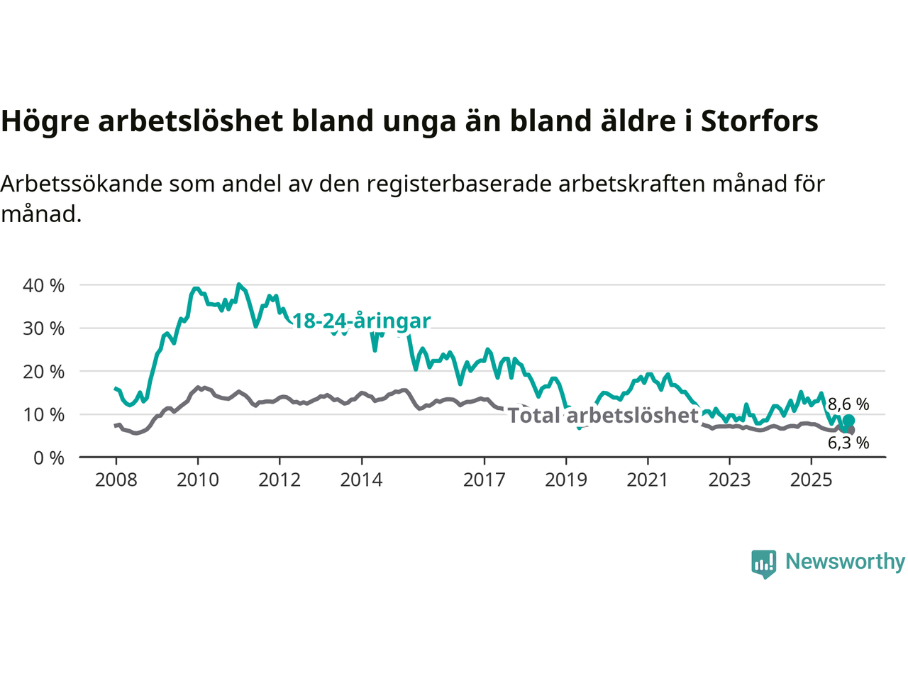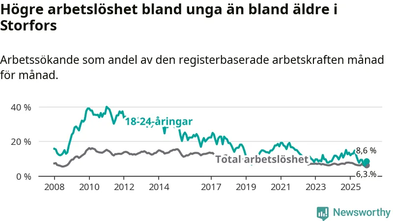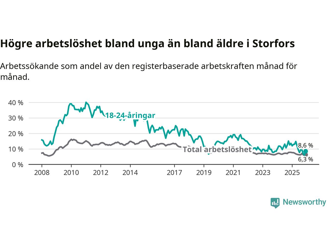 I och med den senaste månadens nedgång har de ungas arbetslöshet i Storfors sjunkit sju månader i följd (ner från 12,1 procent i maj 2025 till 8,6 procent nu).