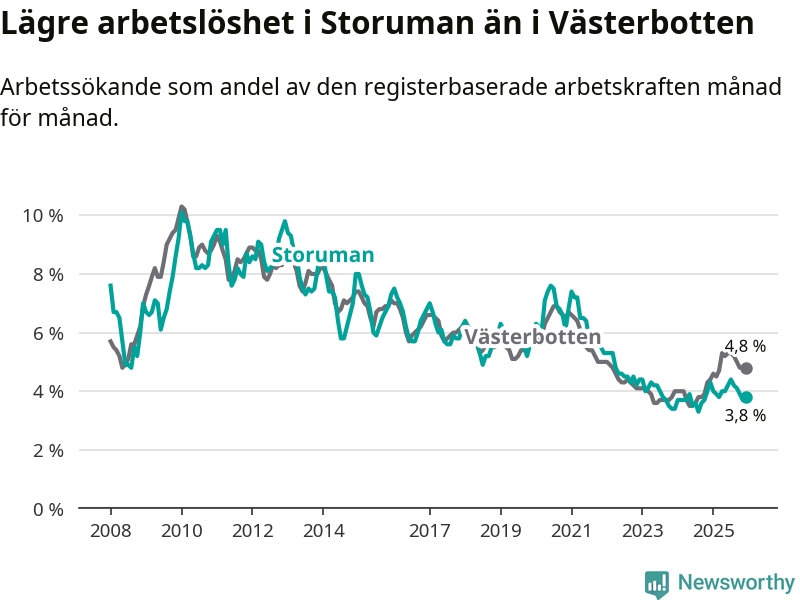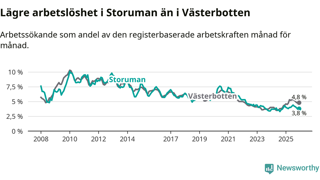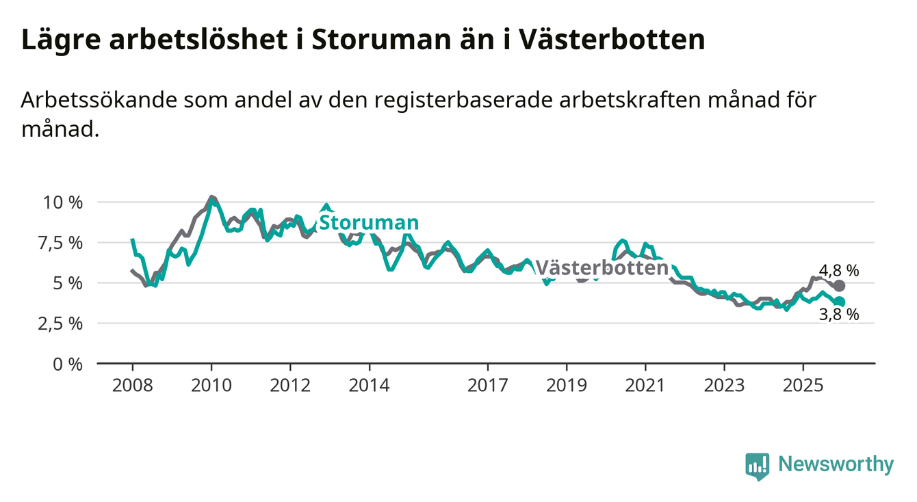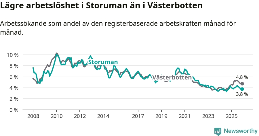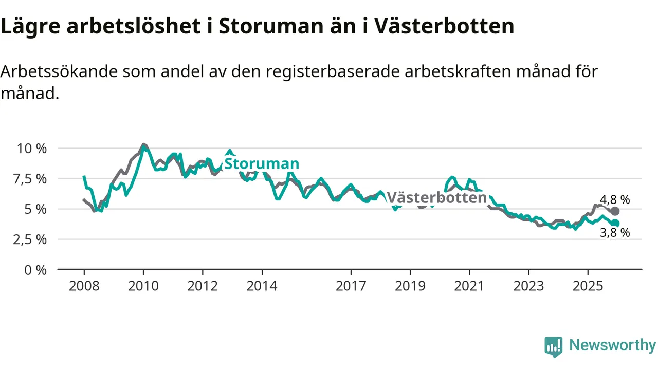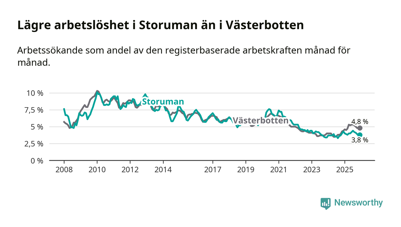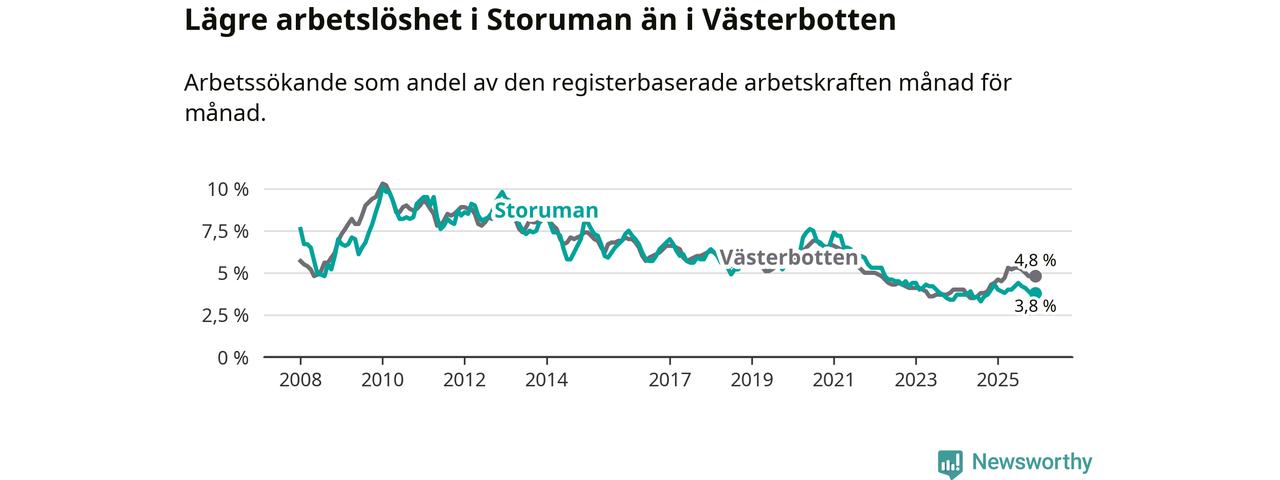 Ny statistik från Arbetsförmedlingen visar på en nedgång i arbetslöshet i Storumans kommun. I Västerbotten däremot ökar arbetslösheten.