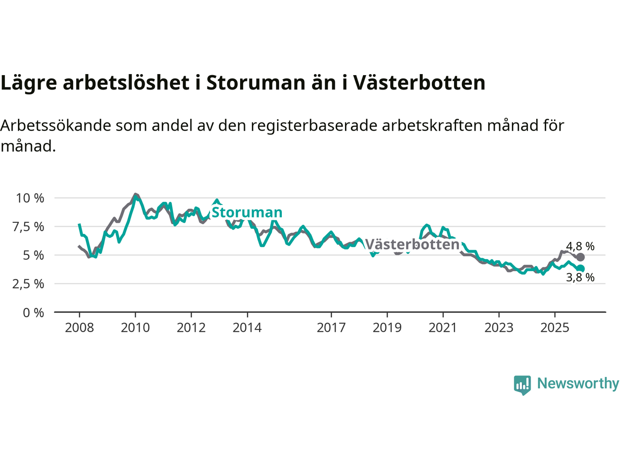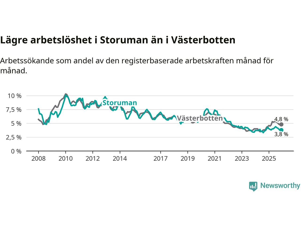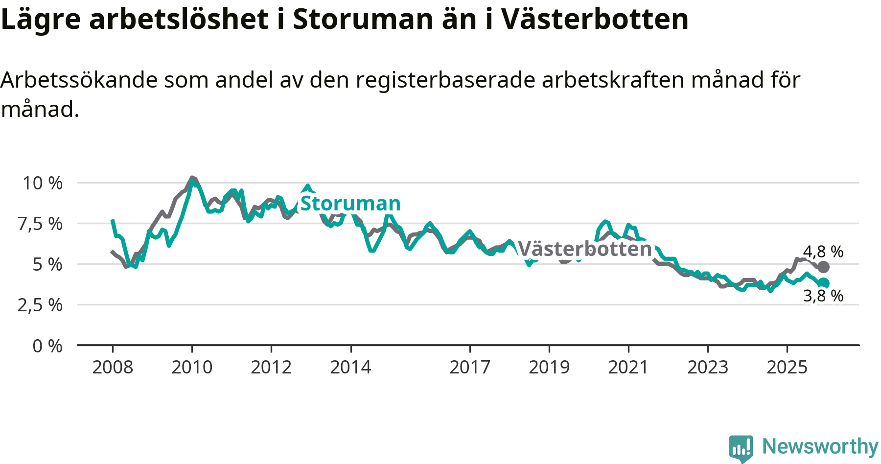 Graf: Arbetslöshet i Storumans kommun och Västerbottens län