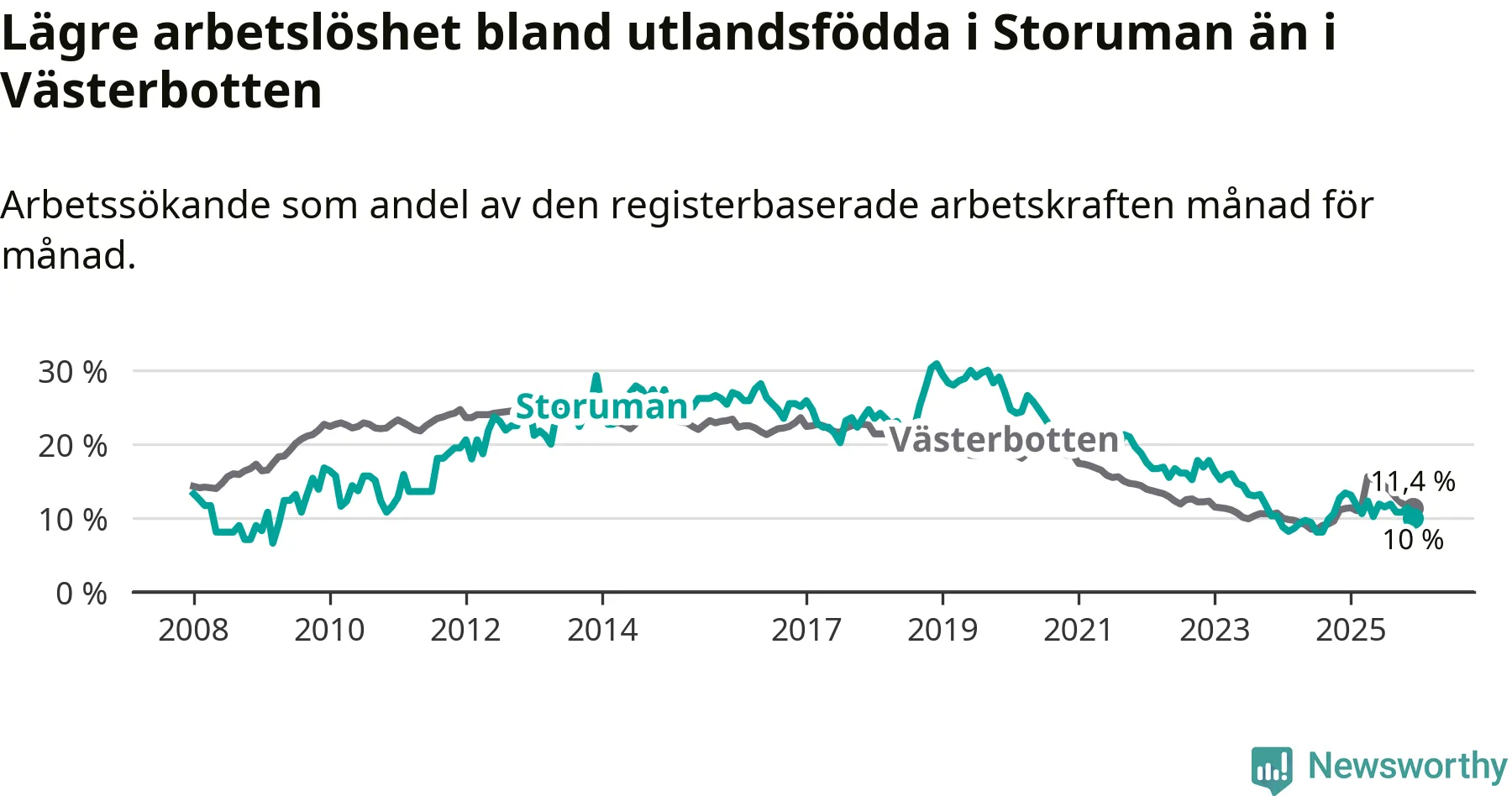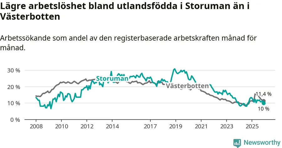 Medan arbetslösheten bland utlandsfödda alltså minskar i Storuman så ökar den i Västerbotten. Jämfört med december förra året har andelen arbetslösa utlandsfödda i länet ökat med 0,1 procentenheter (till 11,4 procent).