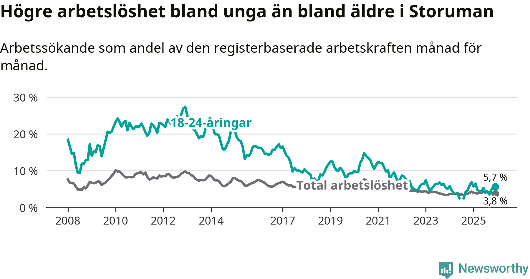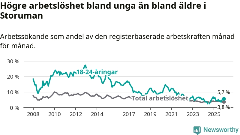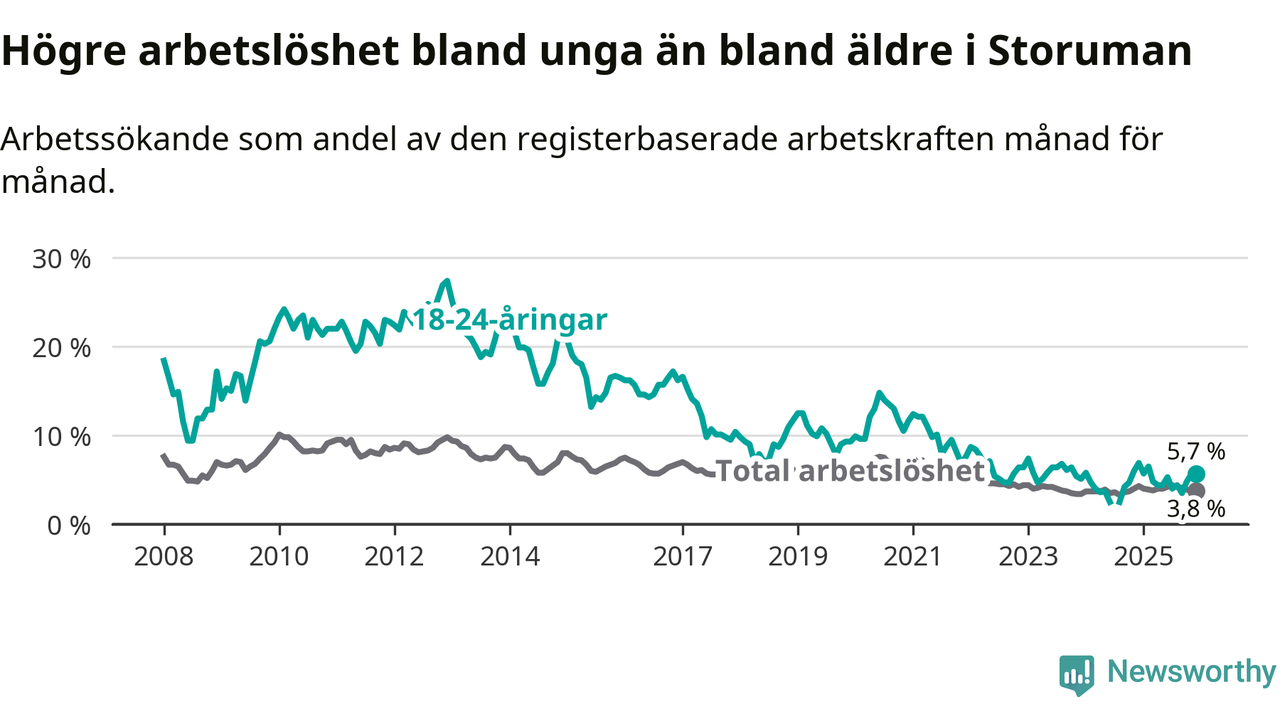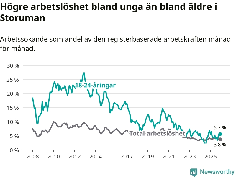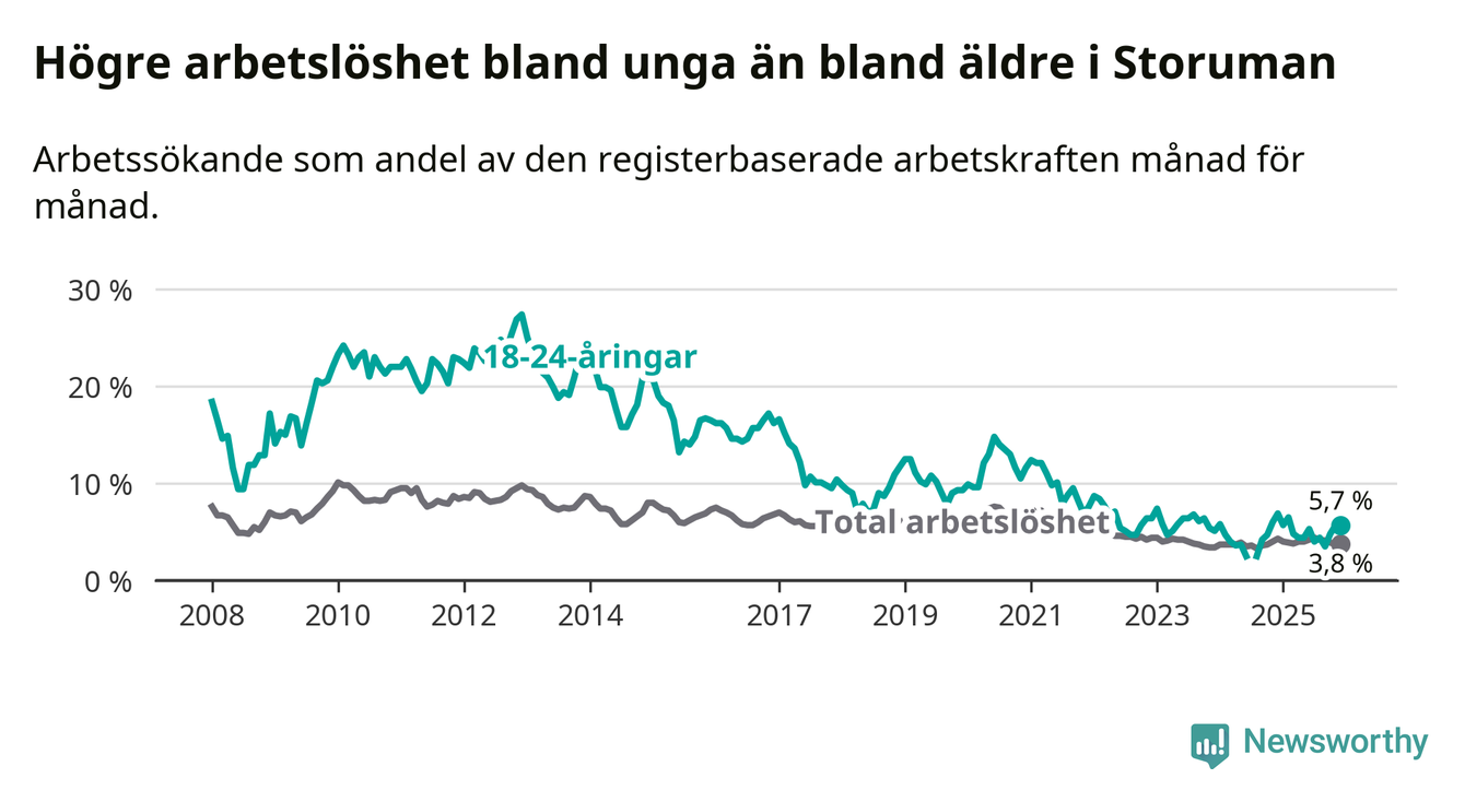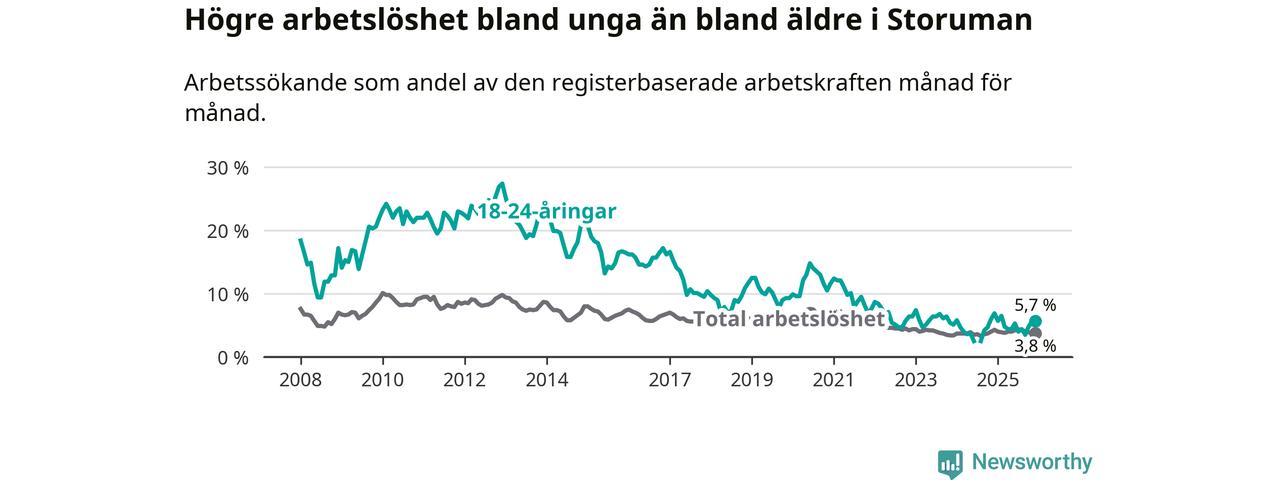 Graf: Arbetslöshet bland unga i Storumans kommun och Västerbottens län