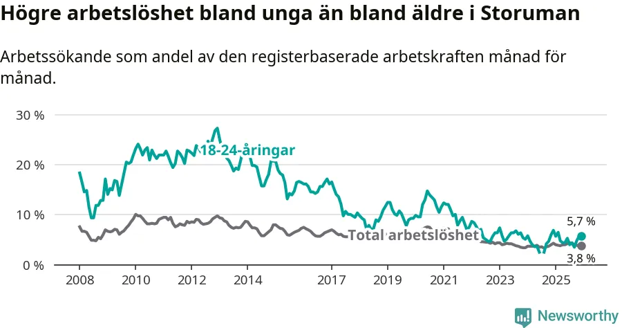 Precis som den totala arbetslösheten ligger ungdomsarbetslösheten i Storuman lägre än i Västerbotten som helhet. Skillnaden mellan kommunen och länet är 1,0 procentenheter.
