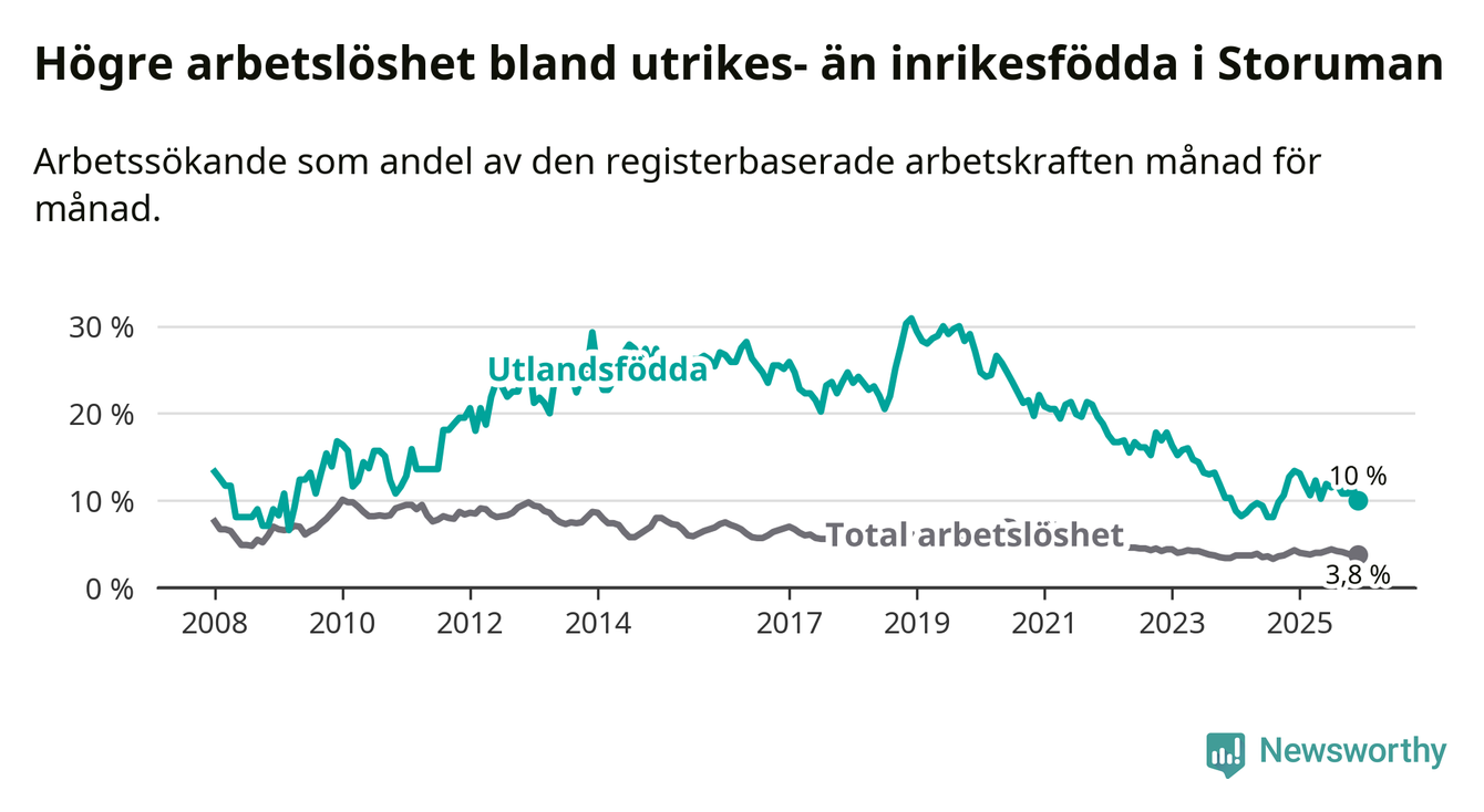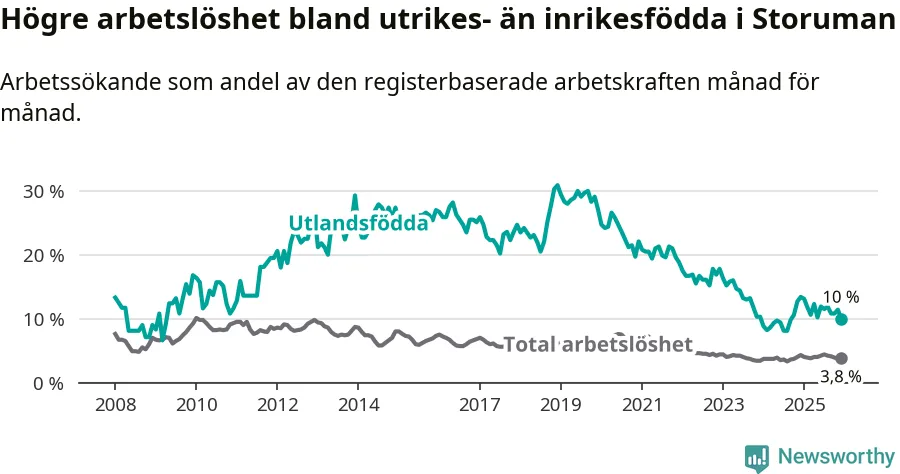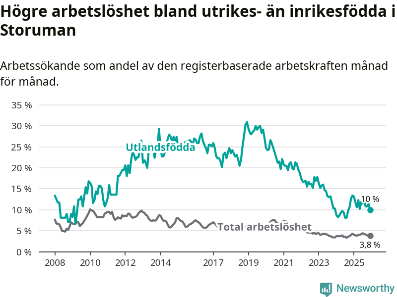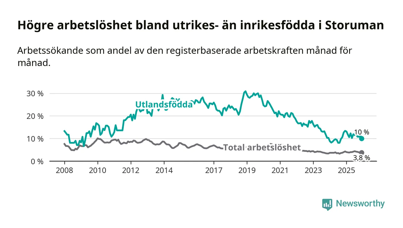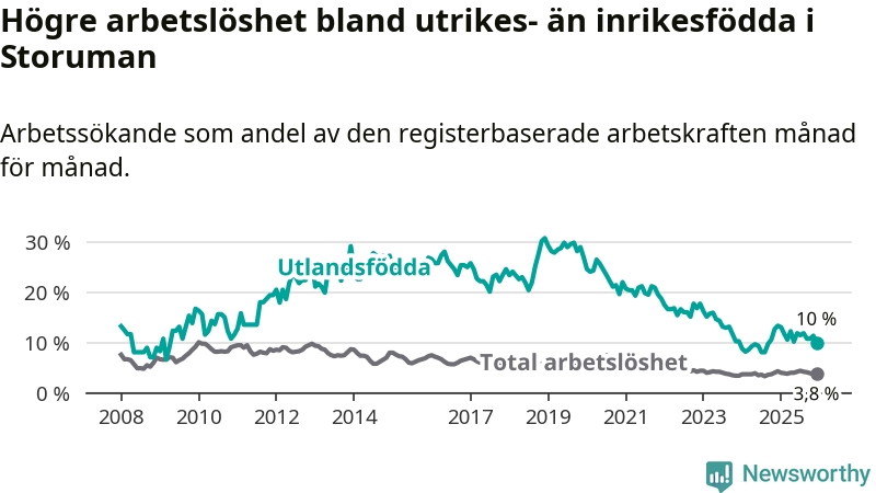 Arbetslösheten bland utlandsfödda var 10,0 procent i Storuman under december månad, motsvarande 30 av 300 personer. Det är 3,4 procentenheter färre än vid samma tidpunkt i fjol (−9 om man räknar personer).