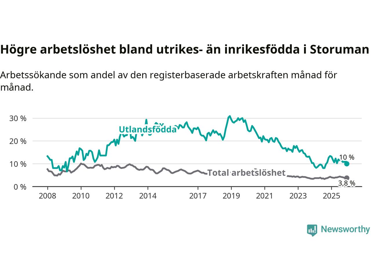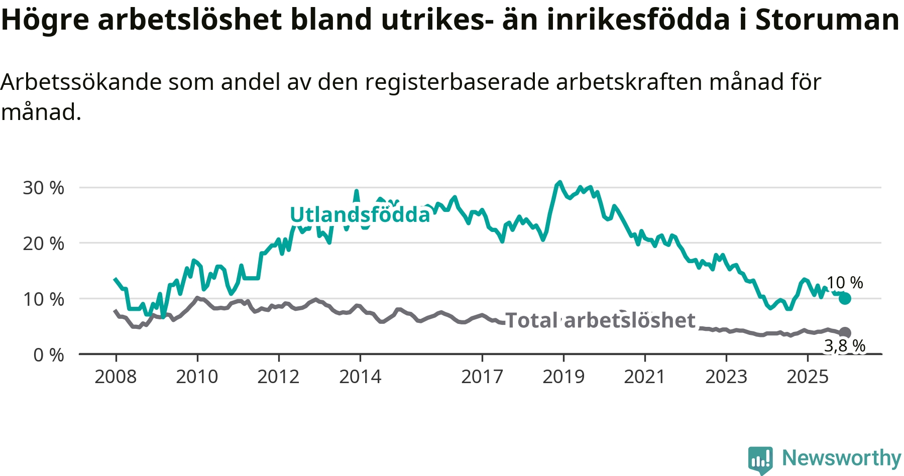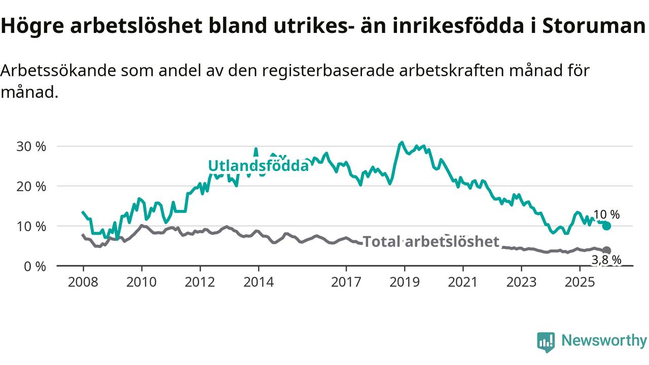 Graf: Arbetslöshet bland utrikesfödda i Storumans kommun och Västerbottens län