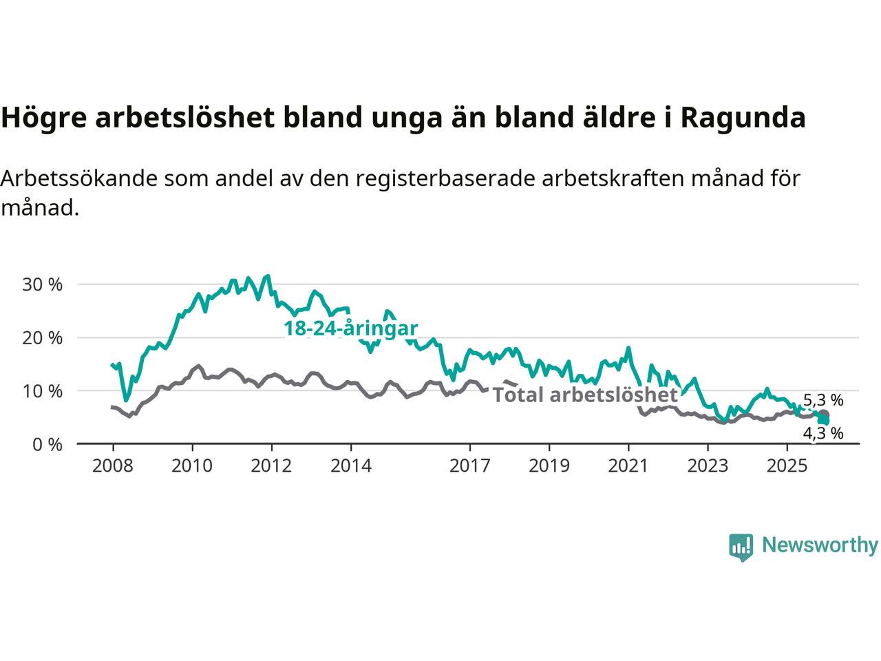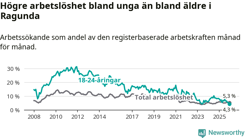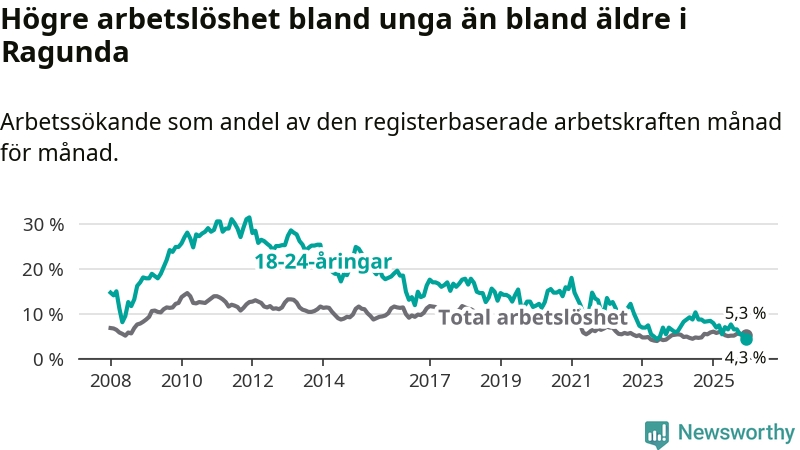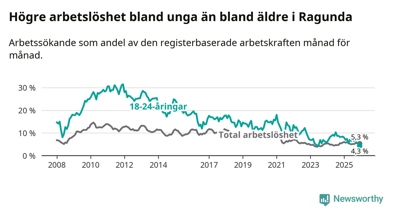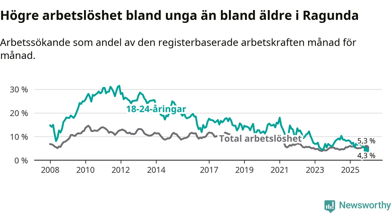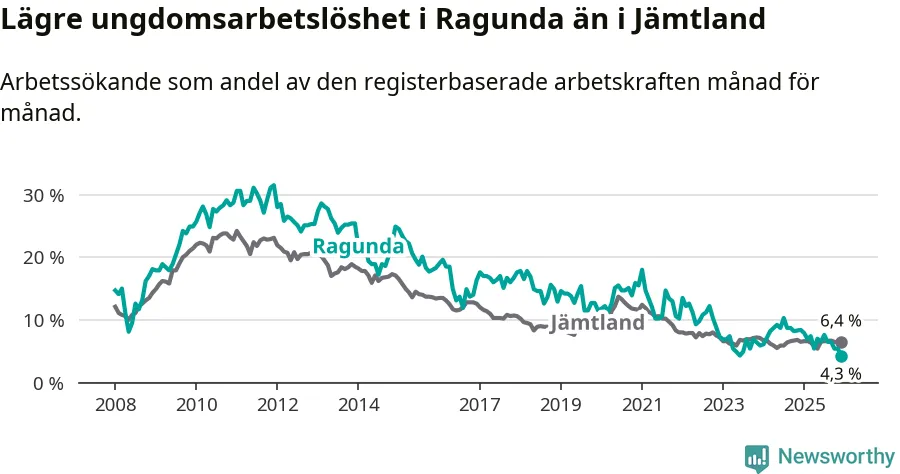 I och med den senaste månadens nedgång har de ungas arbetslöshet i Ragunda sjunkit elva månader i följd (ner från 7,9 procent i januari 2025 till 4,3 procent nu). Den nuvarande arbetslöshetsnivån är den lägsta sedan juni 2023.