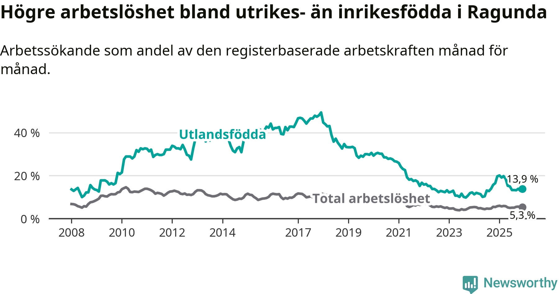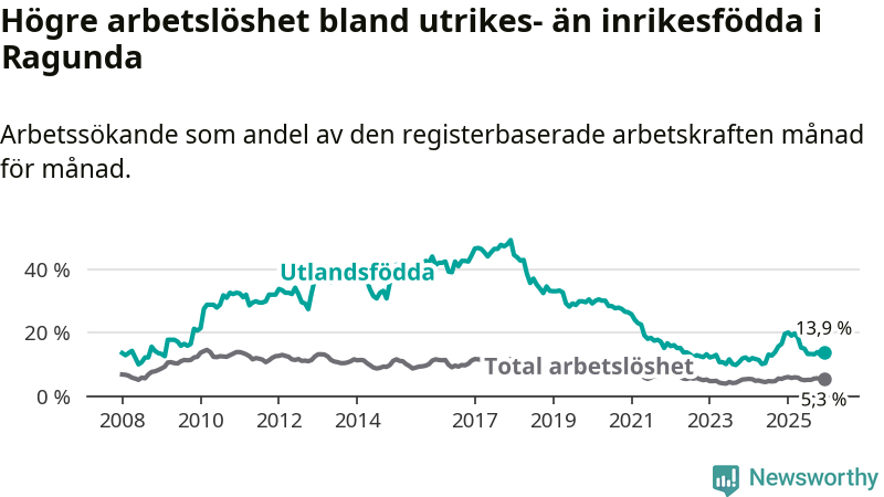 Arbetslösheten bland utlandsfödda var 13,9 procent i Ragunda under december månad, motsvarande 40 av 288 personer. Det är 5,8 procentenheter färre än vid samma tidpunkt i fjol (−17 om man räknar personer).