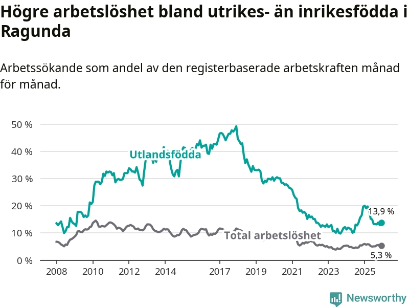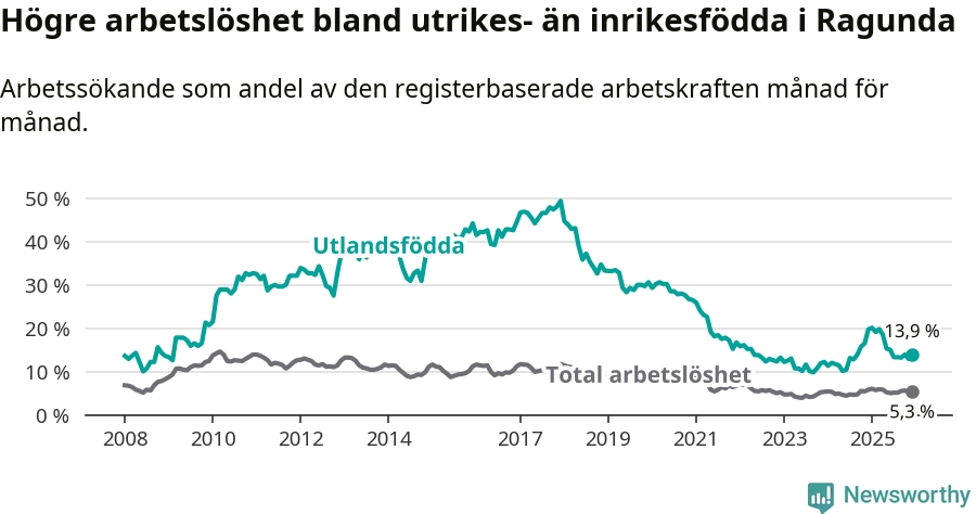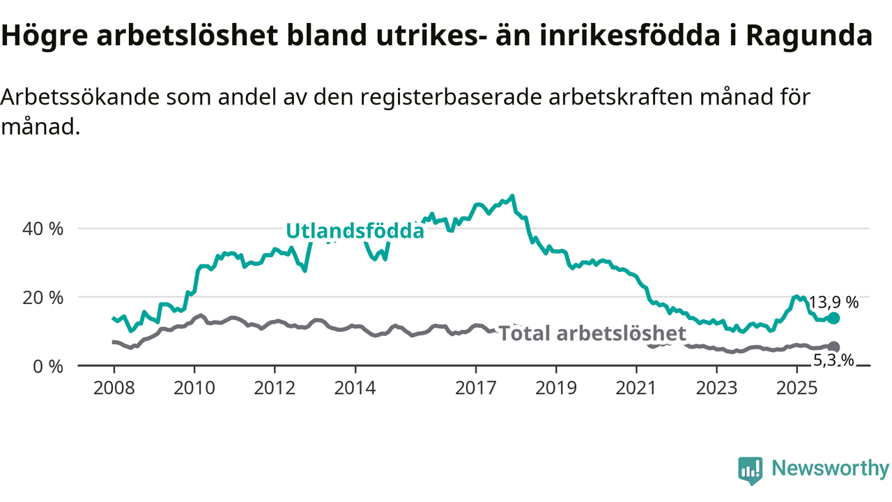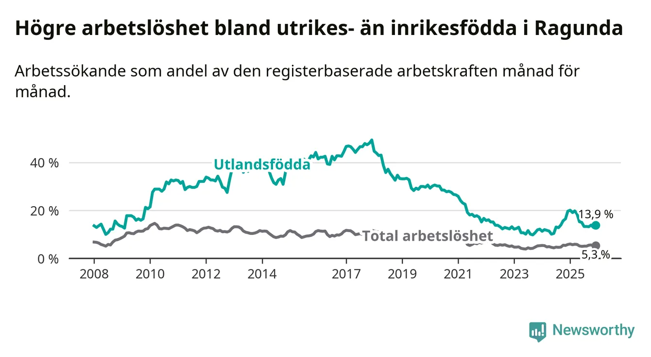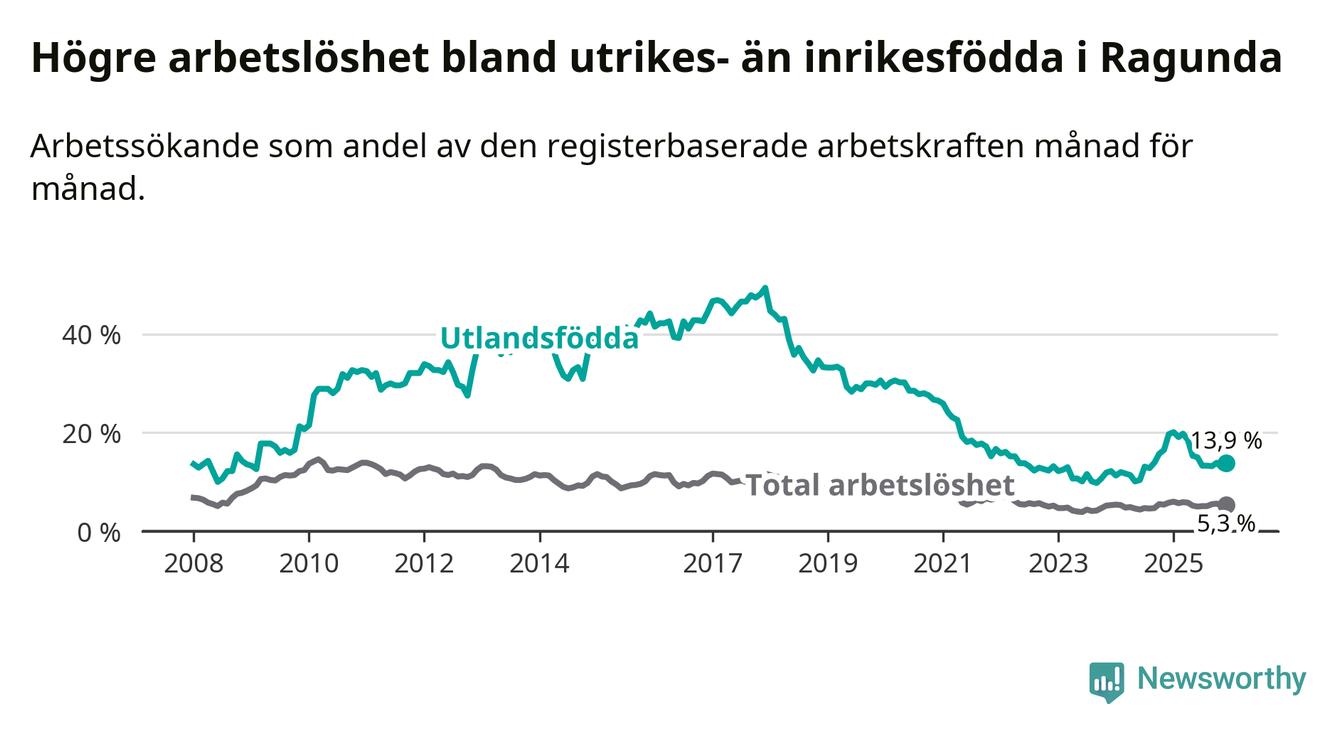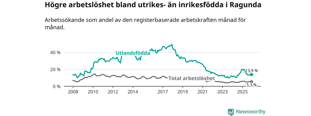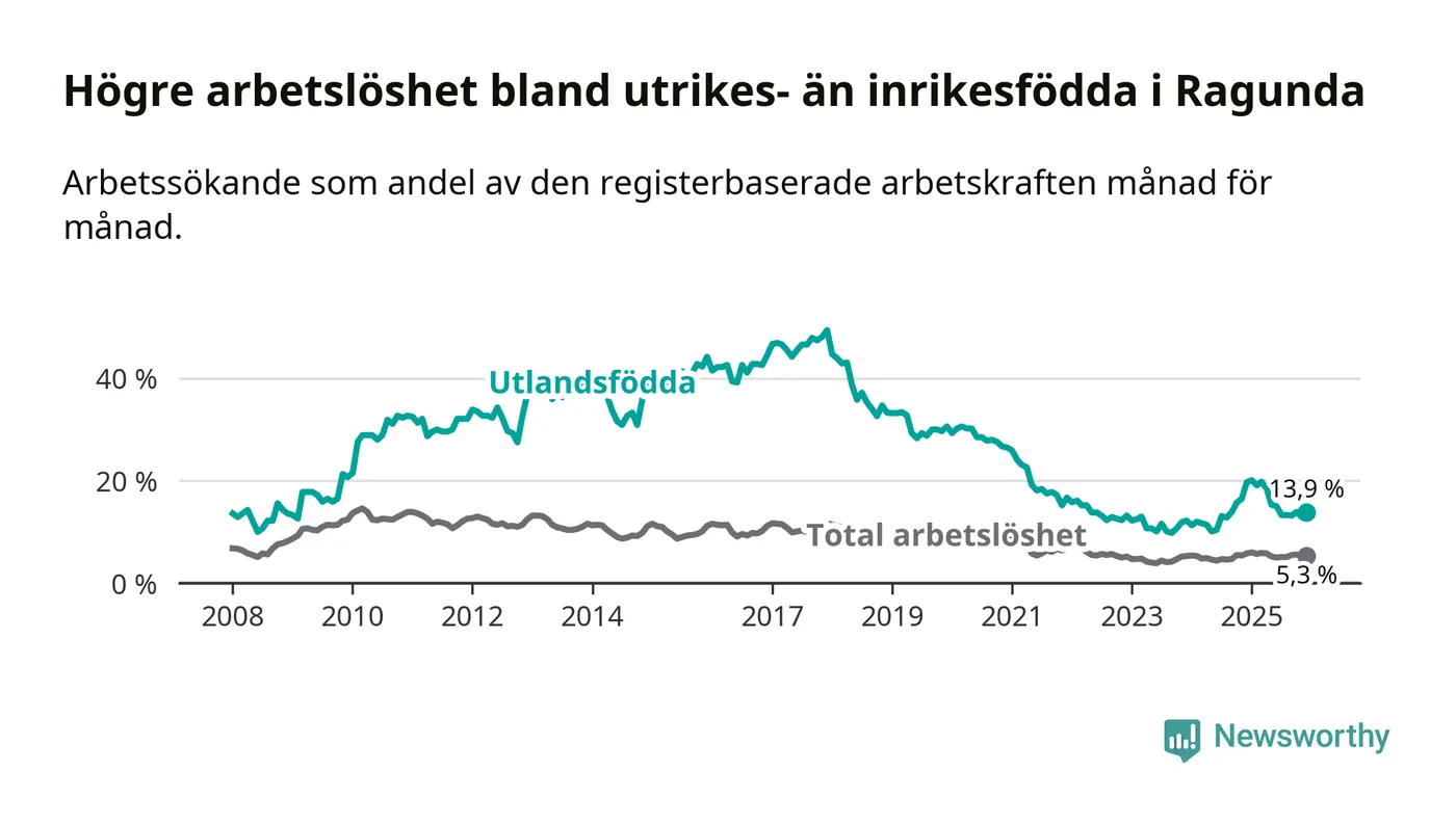 Skillnaden i arbetslöshet mellan utrikesfödda och hela befolkningen är 8,6 procentenheter i Ragunda. Det är en betydligt mindre skillnad än för ett år sedan (−5,3 procentenheter).