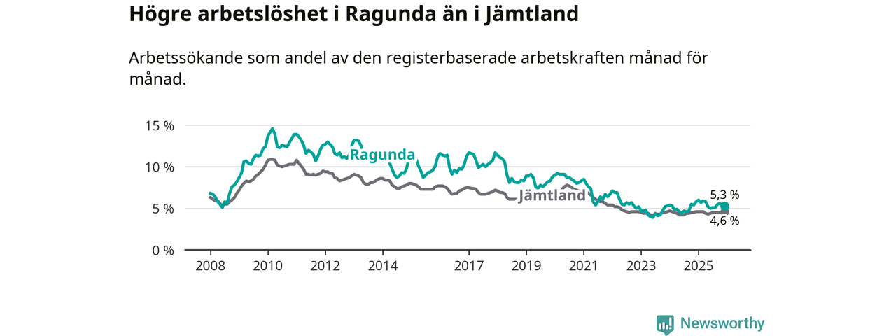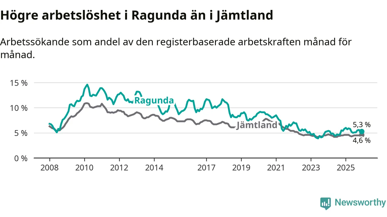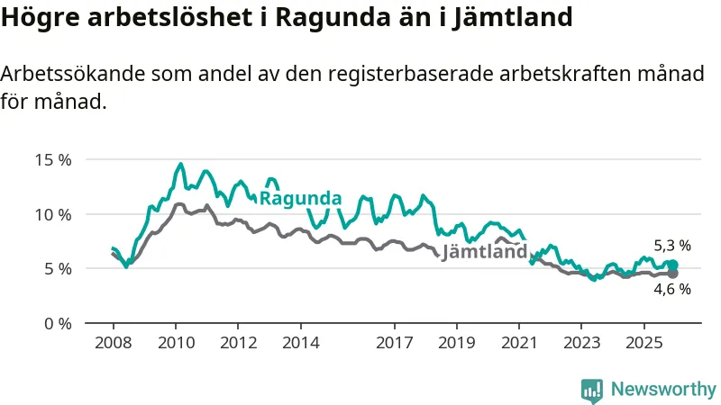Under december månad rapporterade Ragunda kommun en total arbetslöshet på 5,3 procent. Det är en minskning jämfört med samma tidpunkt i fjol (−0,5 procentenheter). I Jämtlands län däremot står arbetslösheten stilla.