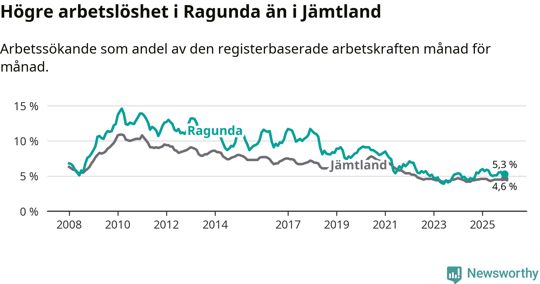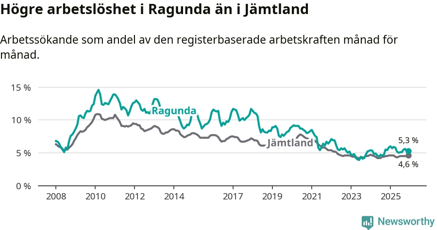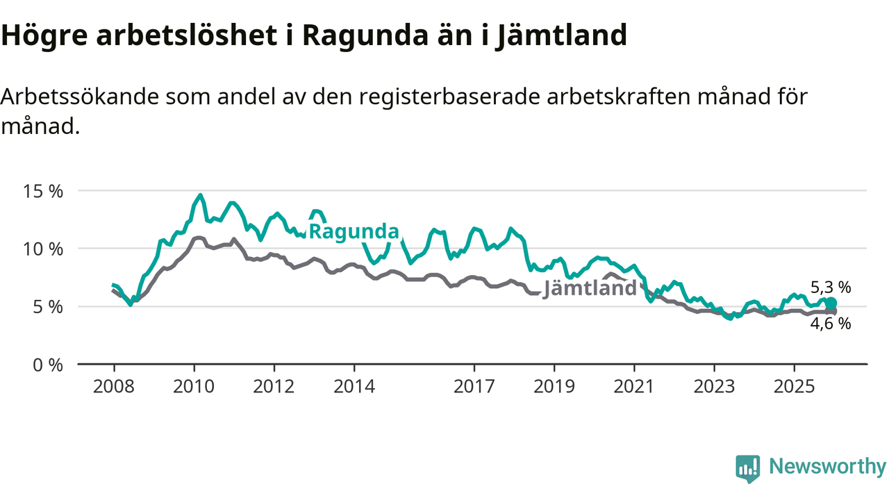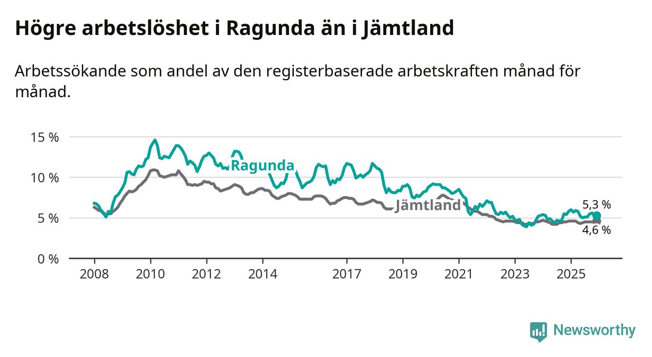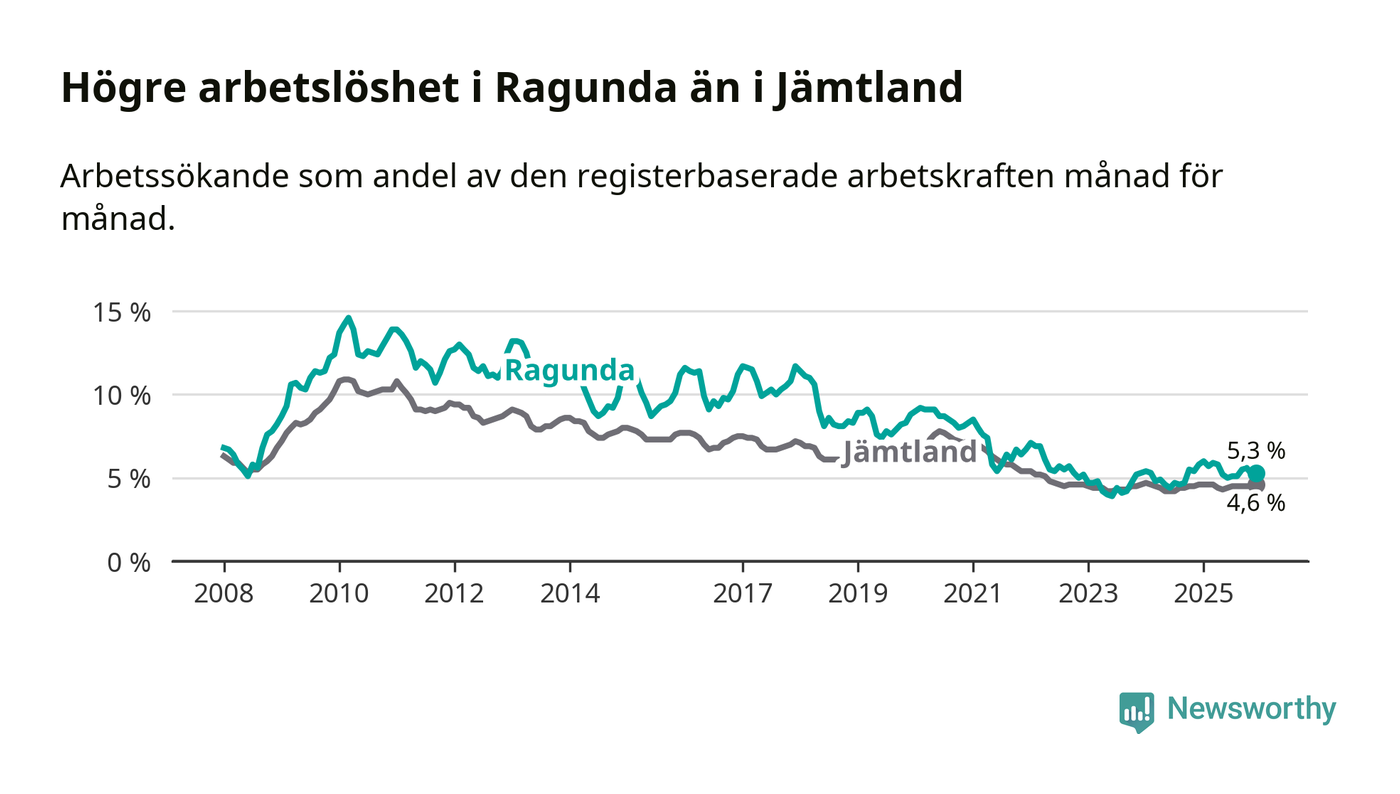 i hela Jämtlands län (5,3 procent i kommunen, jämfört med 4,6 procent i hela länet). Åre har den lägsta arbetslösheten i länet (3,3 procent), medan Strömsund har den högsta (6,4 procent). För att Ragunda skulle komma ner i samma arbetslöshetsnivå som Åre skulle 45 personer behöva sysselsättas.