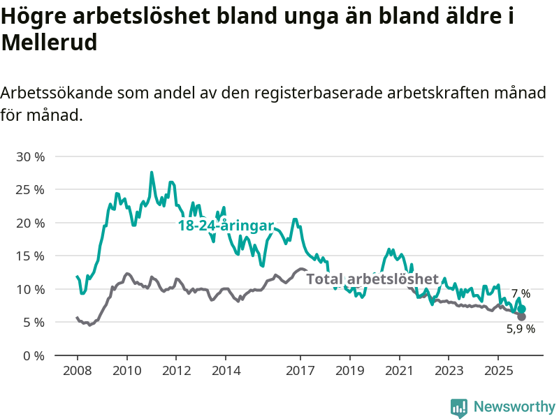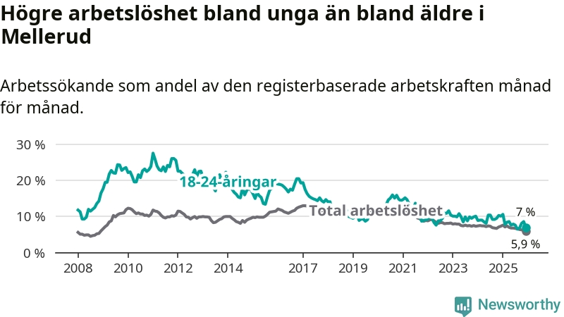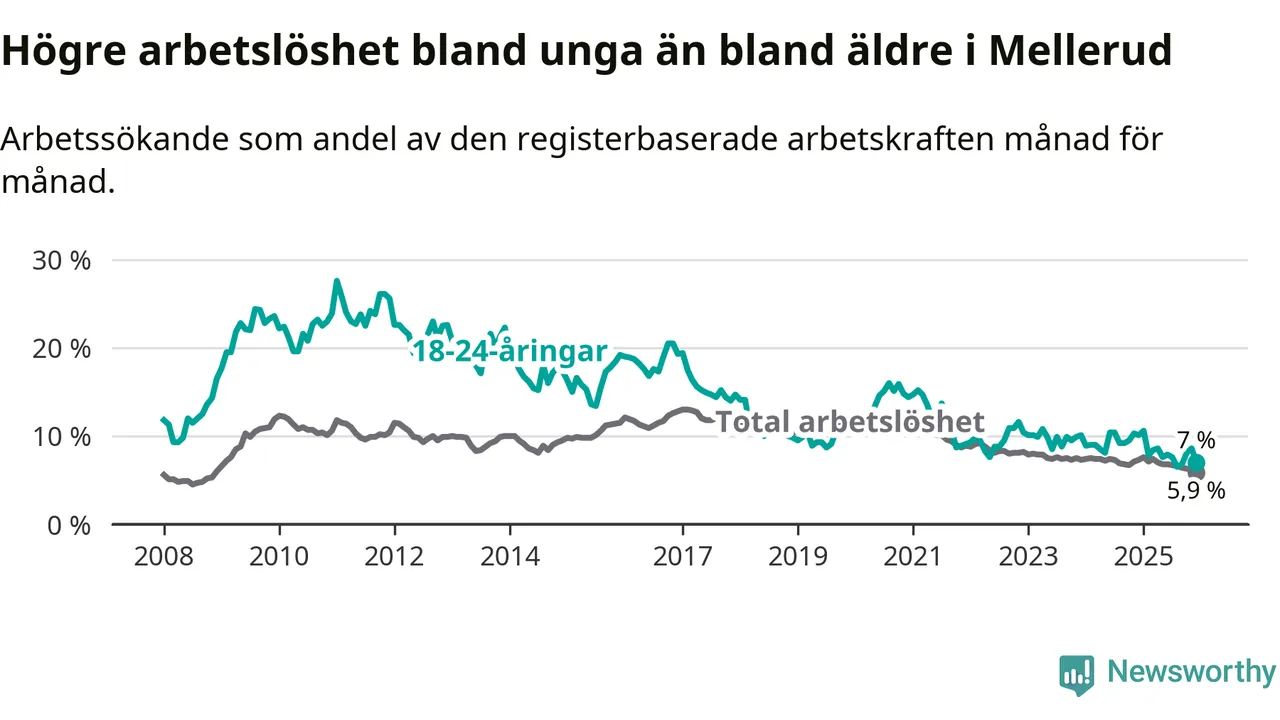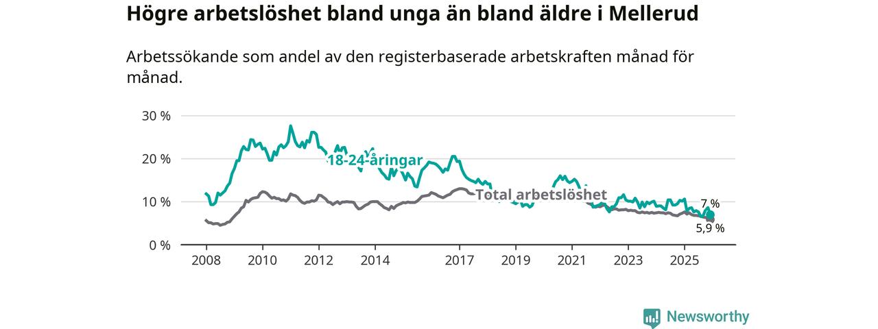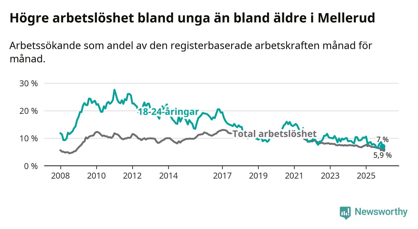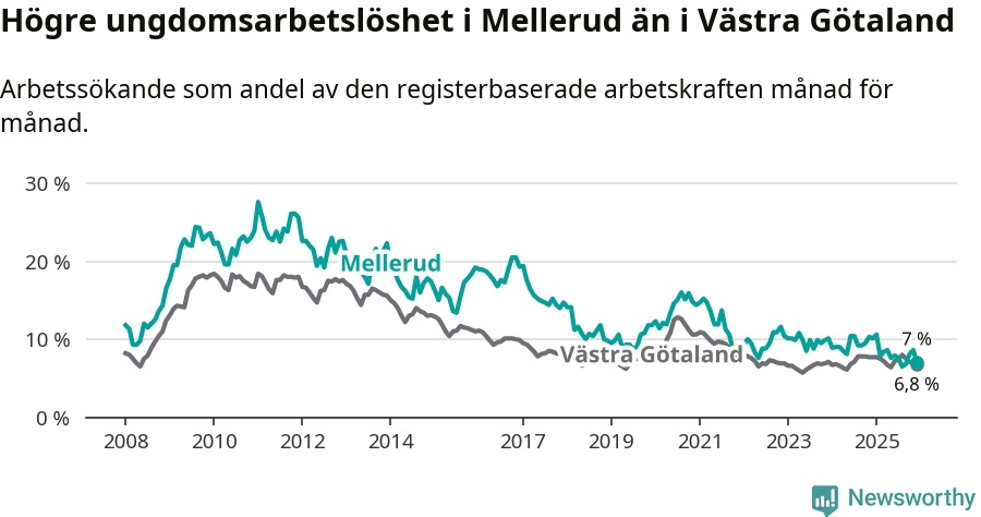 Medan Mellerud har lägre total arbetslöshet än Västra Götaland, ligger ungdomsarbetslösheten 0,2 procentenheter högre i Mellerud.