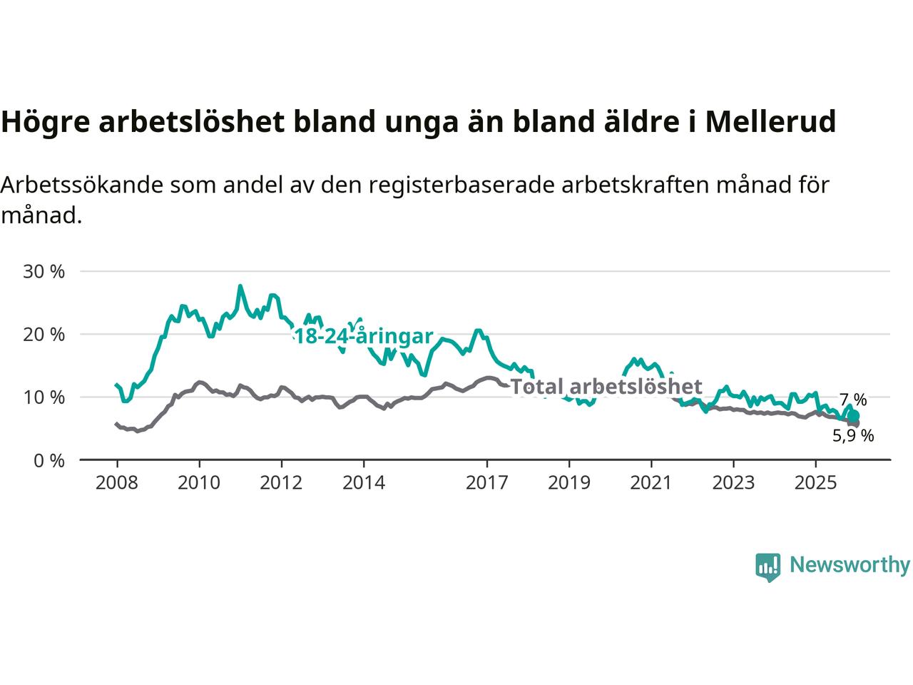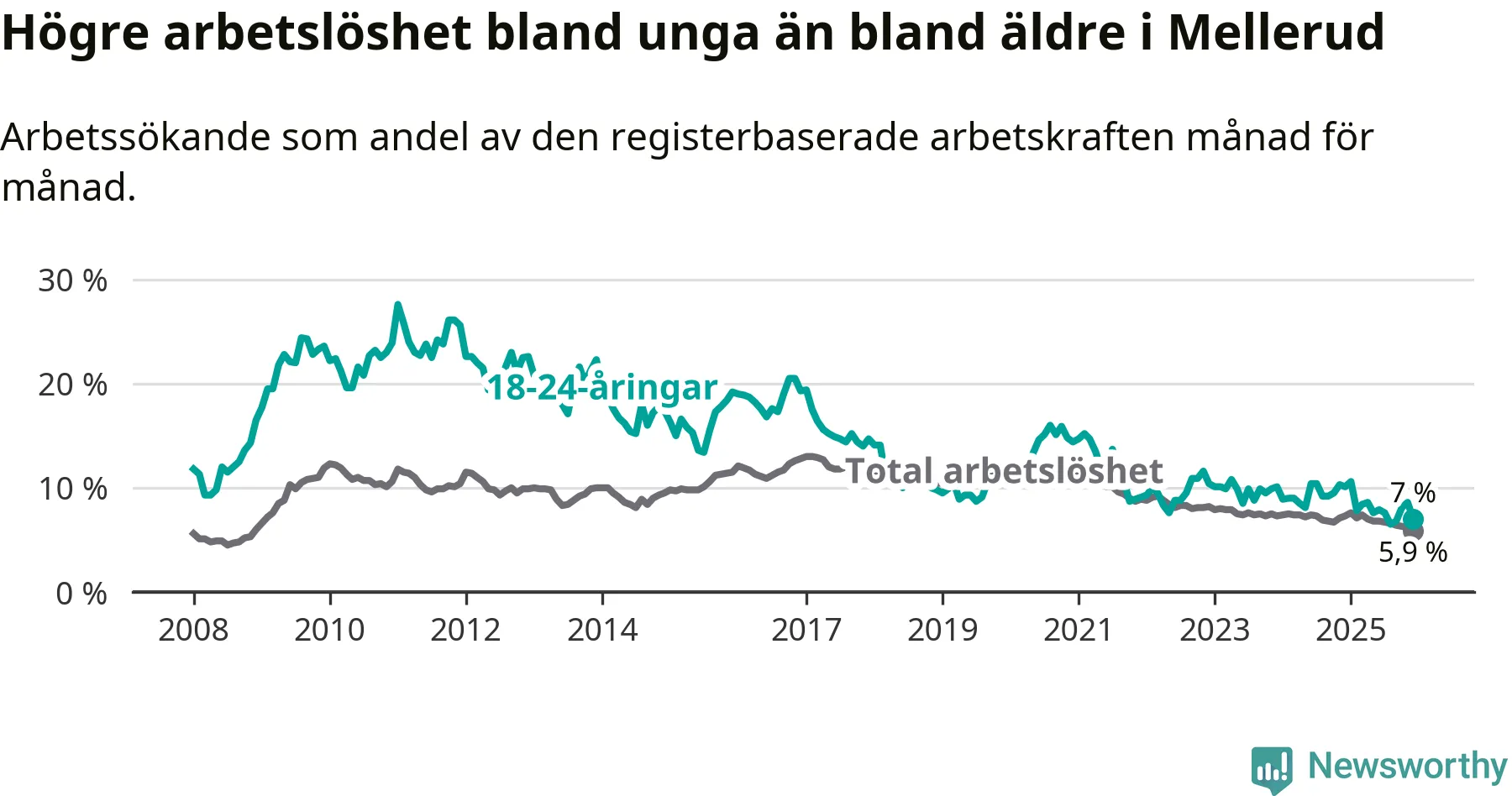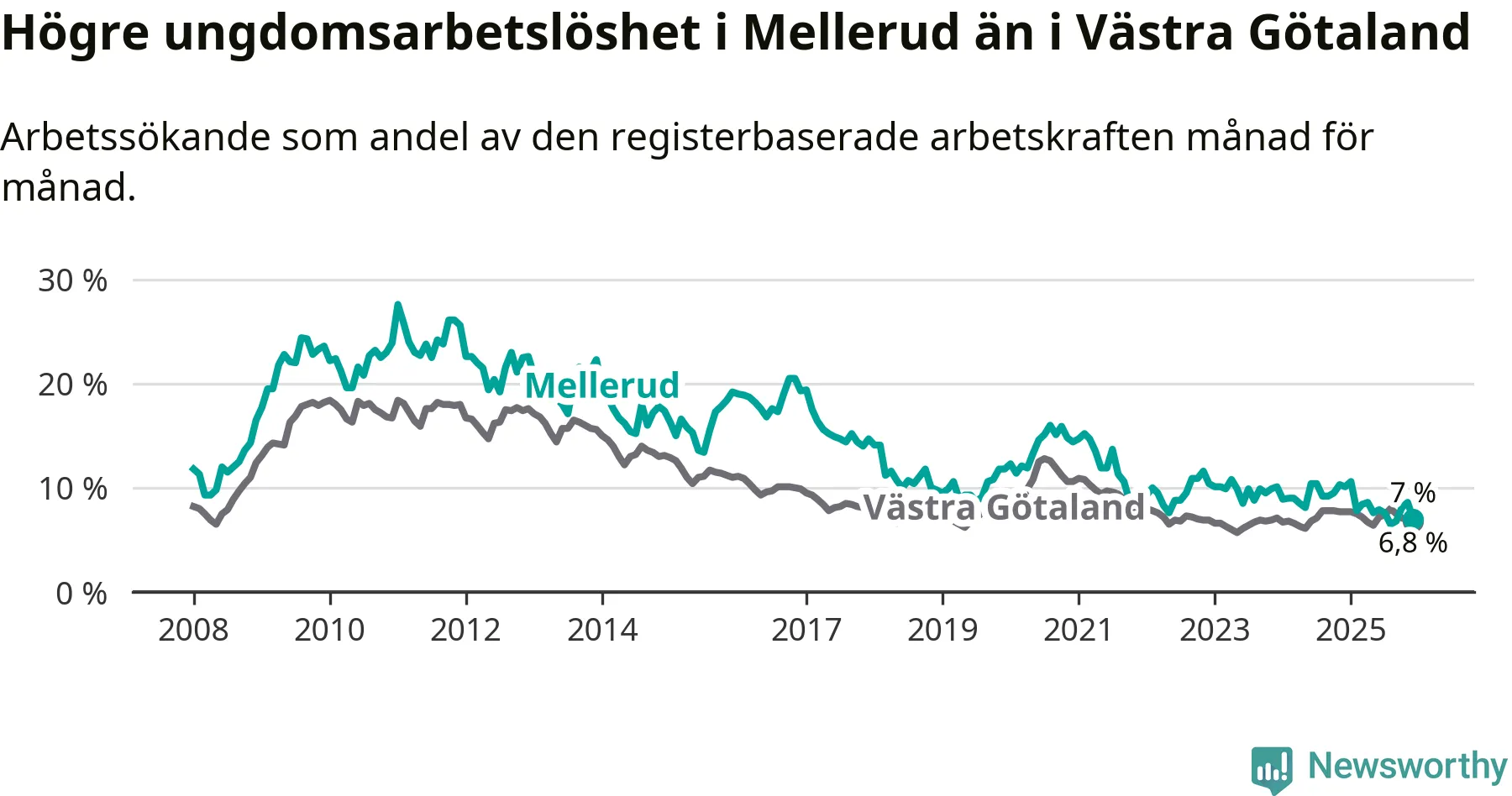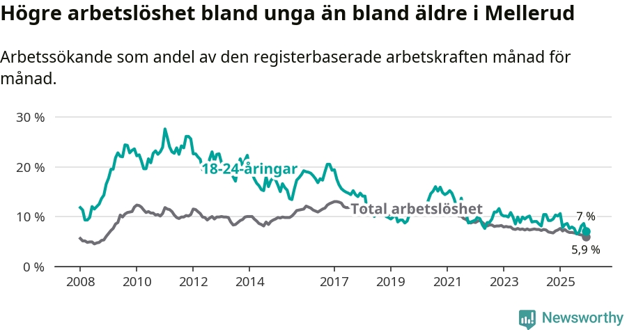 Medan Mellerud har lägre total arbetslöshet än Västra Götaland, ligger ungdomsarbetslösheten 0,2 procentenheter högre i Mellerud.