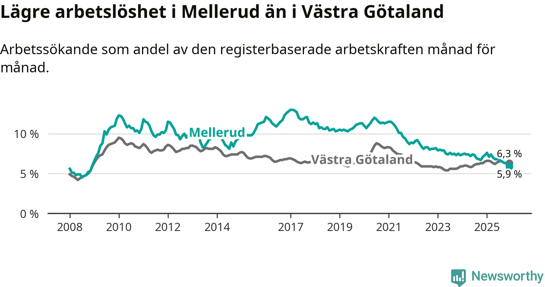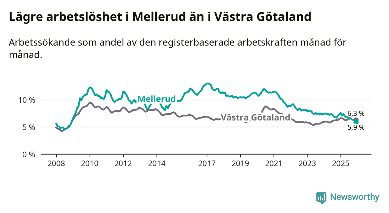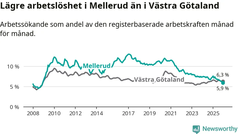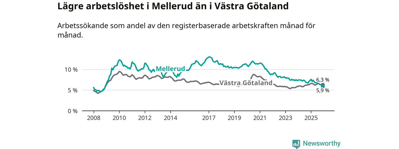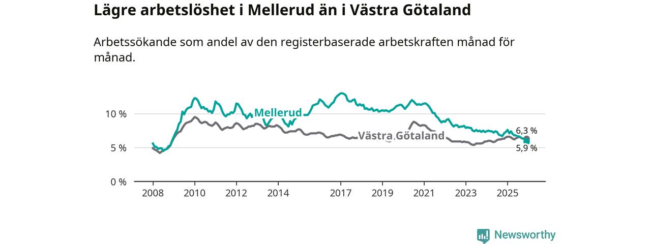 Det är nionde månaden i följd som arbetslösheten i Mellerud är lägre än den var under samma tidpunkt året innan. Sedan mars 2025 har arbetslösheten gått ner från 7,4 till 5,9 procent. Den nuvarande arbetslöshetsnivån är därmed den lägsta sedan november 2008.