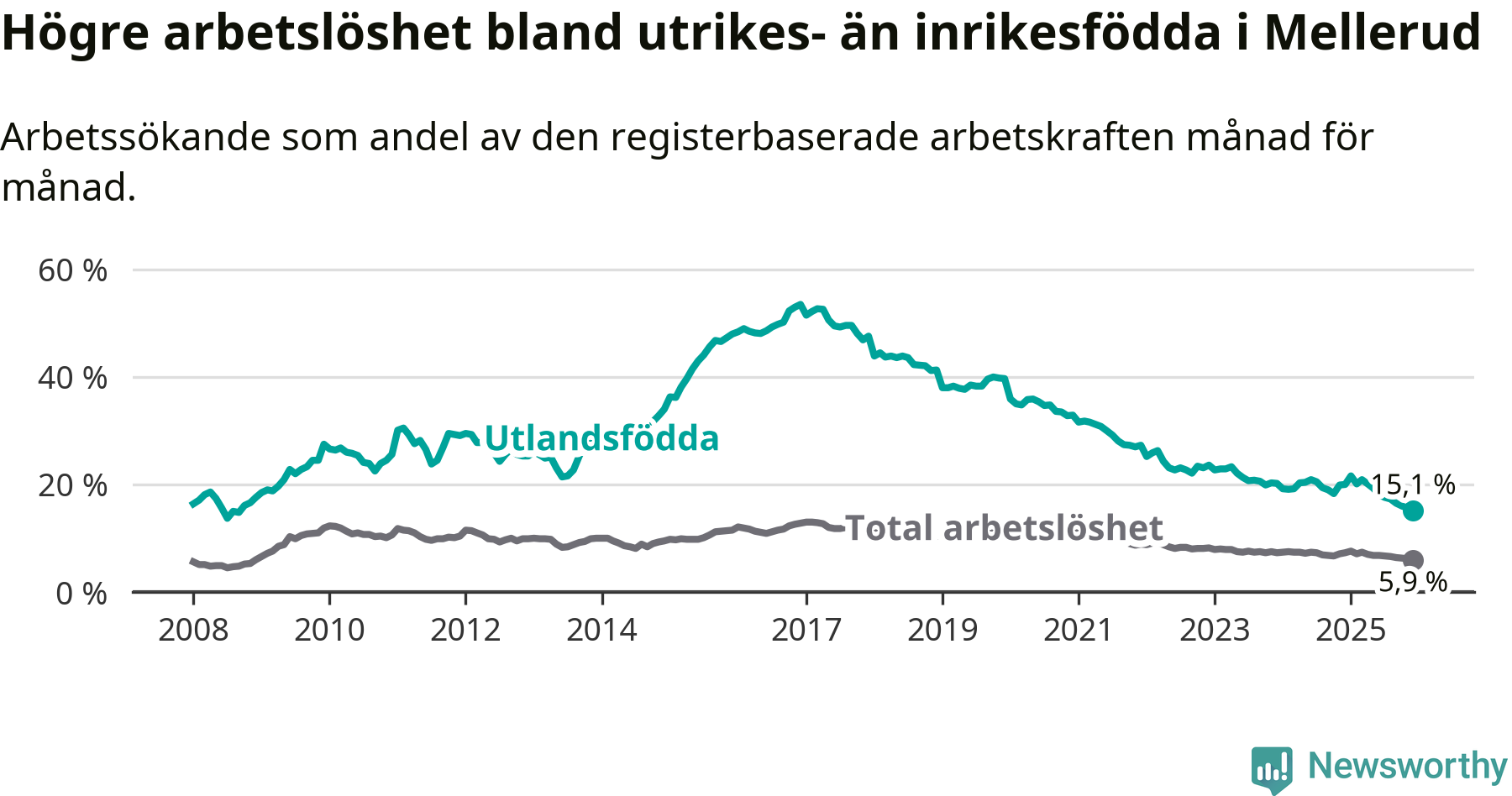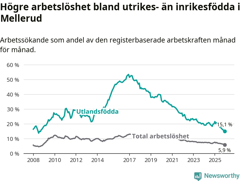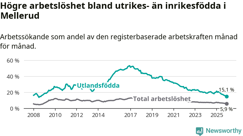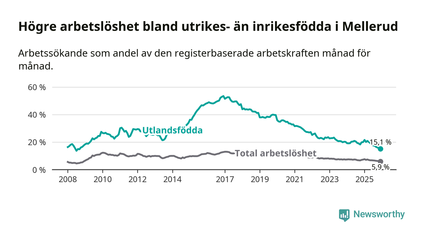 Arbetslösheten bland utlandsfödda var 15,1 procent i Mellerud under december månad, motsvarande 116 av 768 personer. Det är 4,9 procentenheter färre än vid samma tidpunkt i fjol (−38 om man räknar personer). Därmed är de utlandsföddas arbetslöshet lägre än vid samma tidpunkt i fjol för nionde månaden i följd. Sedan mars 2025 har arbetslösheten bland utlandsfödda minskat från 20,9 till 15,1 procent. Den nuvarande arbetslöshetsnivån är den lägsta sedan september 2008.