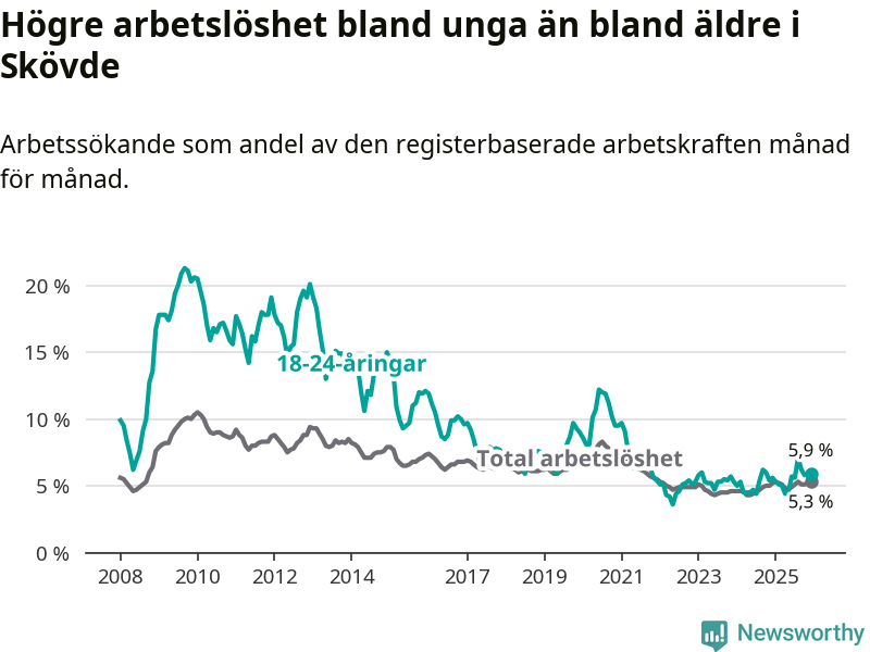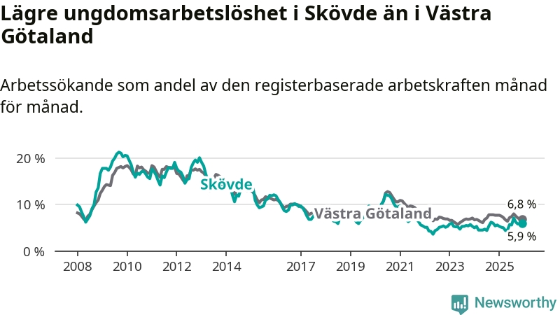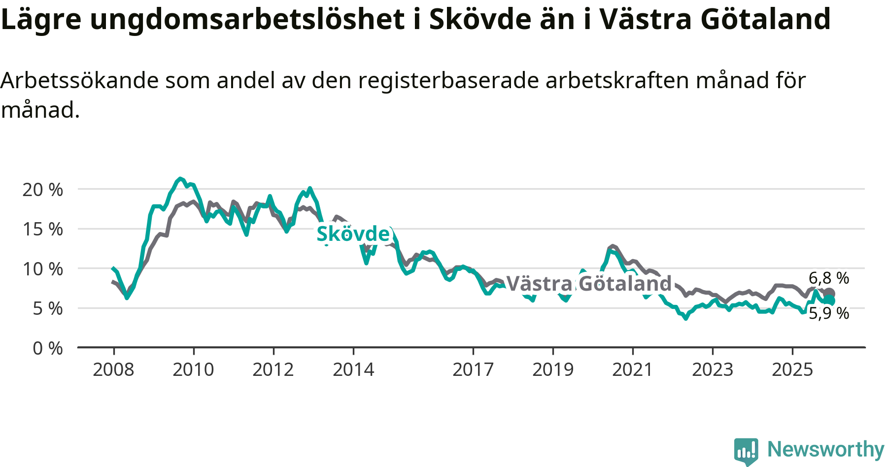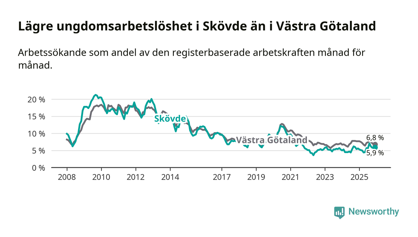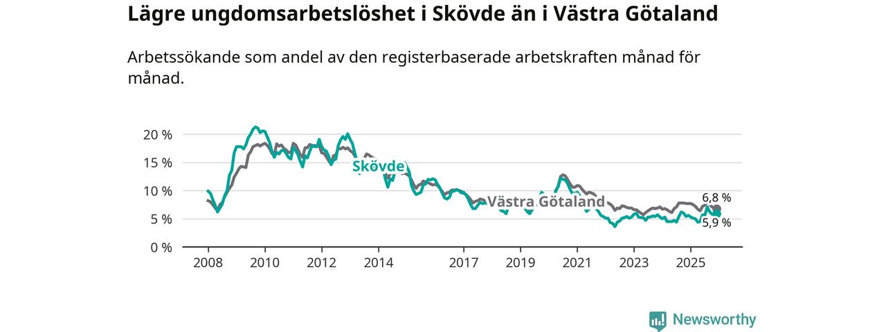 Graf: Arbetslöshet bland unga i Skövde kommun och Västra Götalands län