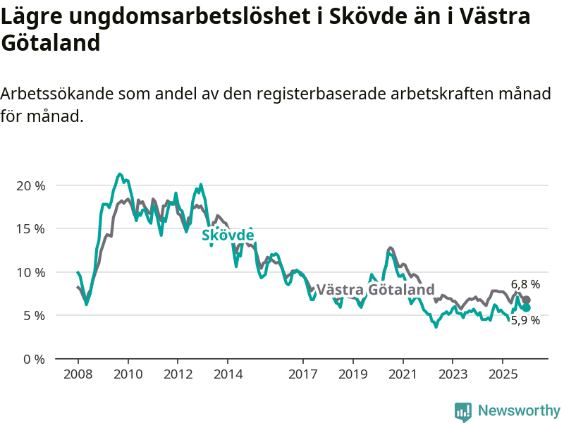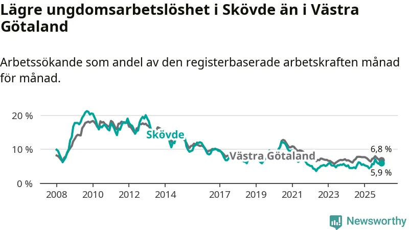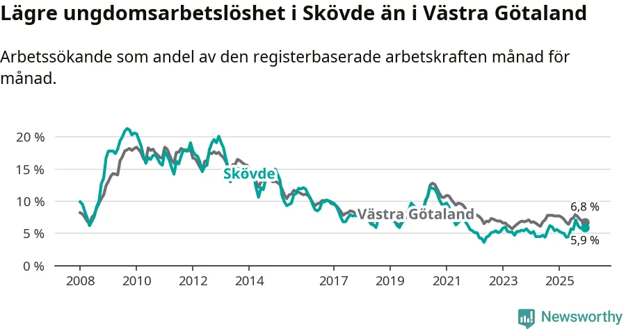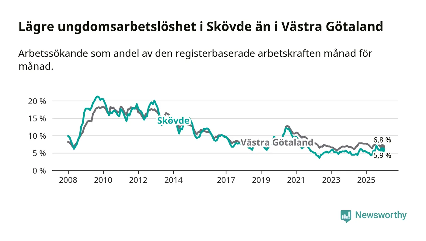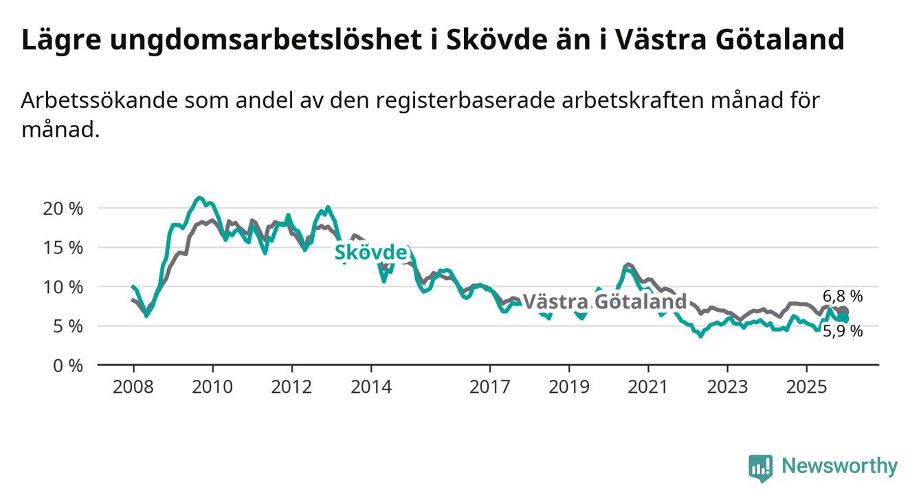 Precis som den totala arbetslösheten ligger ungdomsarbetslösheten i Skövde lägre än i Västra Götaland som helhet. Skillnaden mellan kommunen och länet är 0,9 procentenheter.