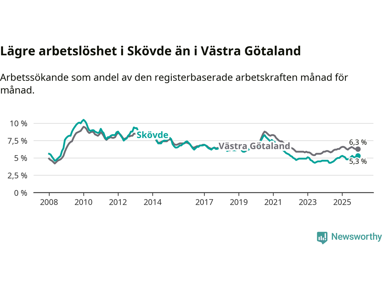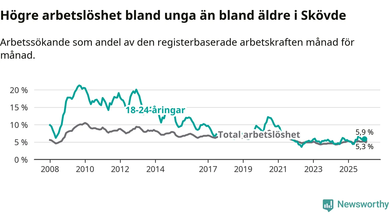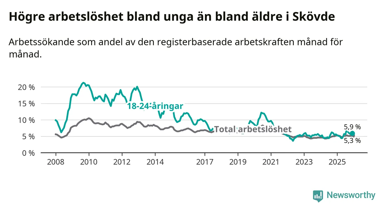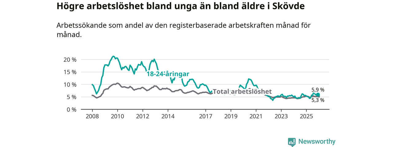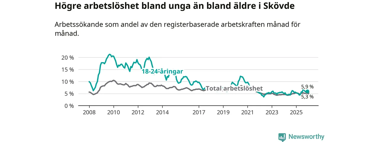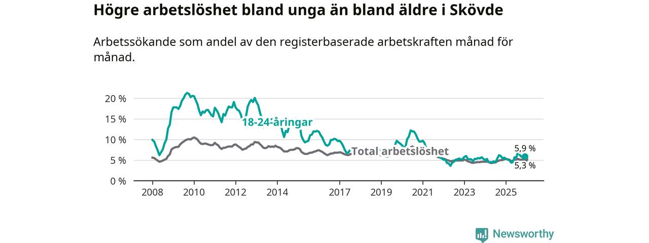 Det är 19:e månaden i följd som arbetslösheten i Skövde är högre än den var under samma tidpunkt året innan. Sedan maj 2024 har arbetslösheten gått upp från 4,3 till 5,3 procent.