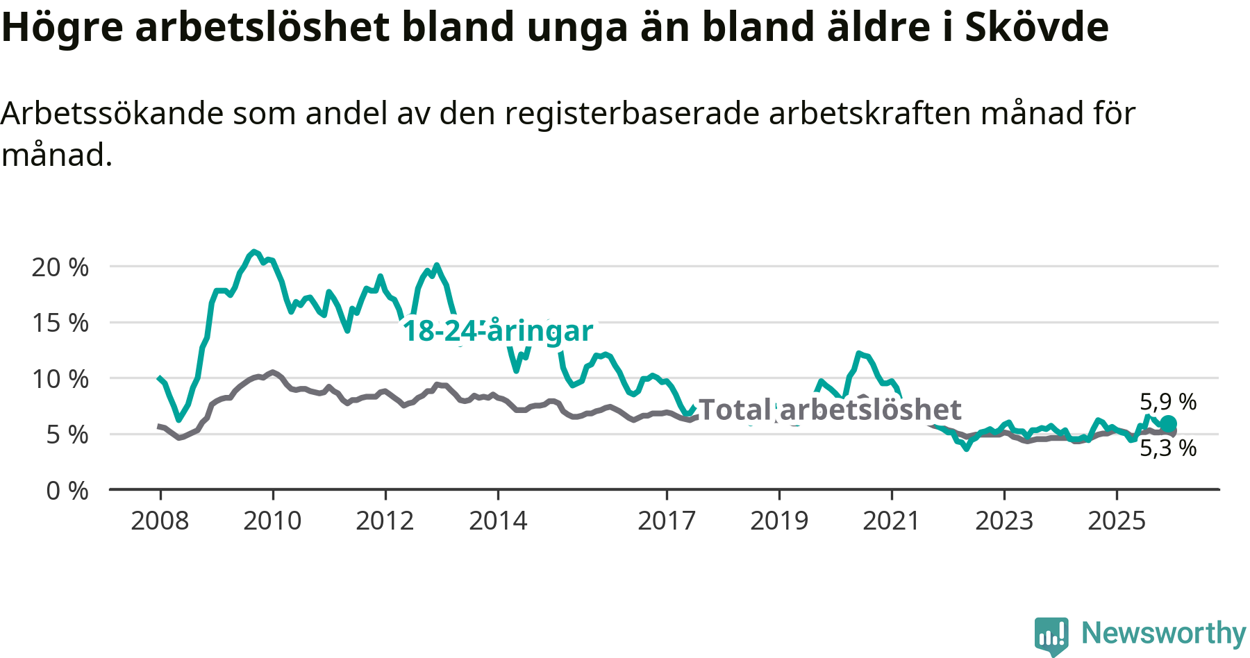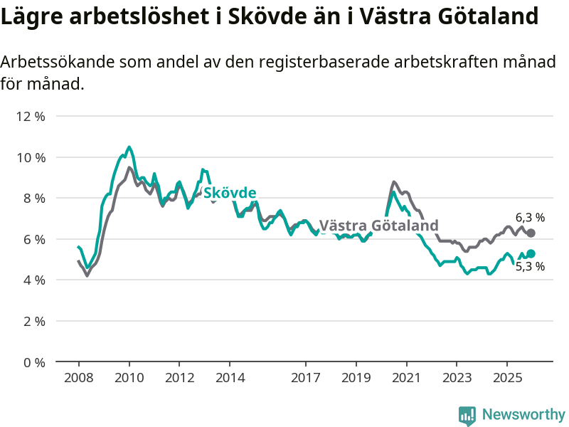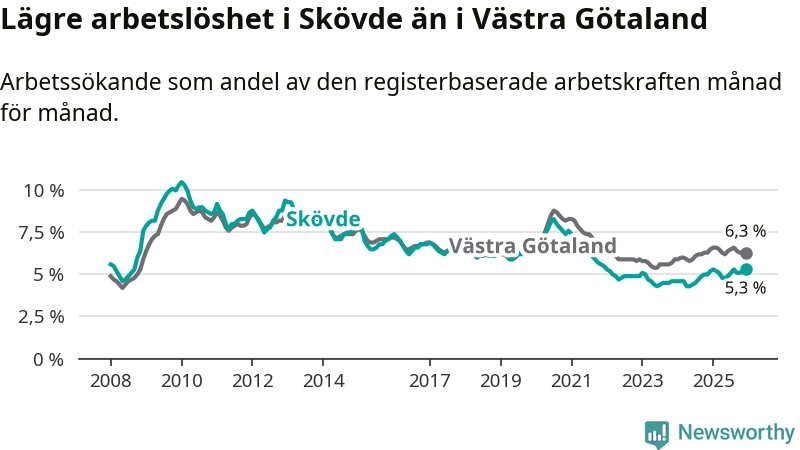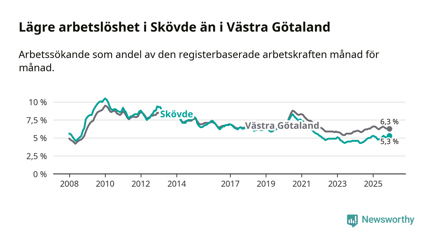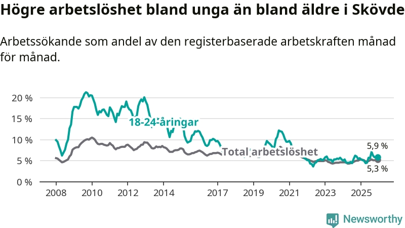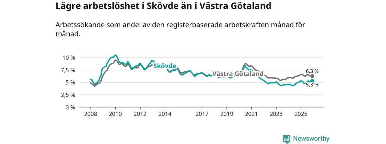 Det är 19:e månaden i följd som arbetslösheten i Skövde är högre än den var under samma tidpunkt året innan. Sedan maj 2024 har arbetslösheten gått upp från 4,3 till 5,3 procent.