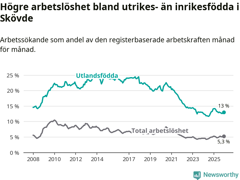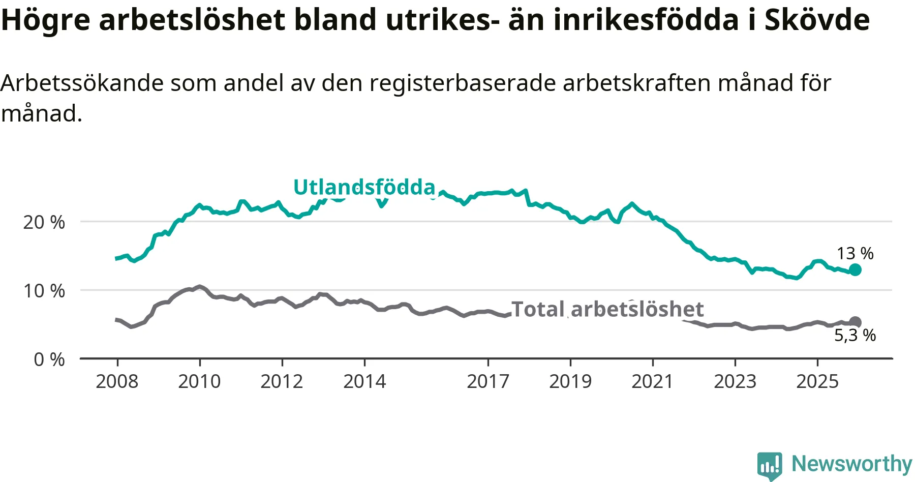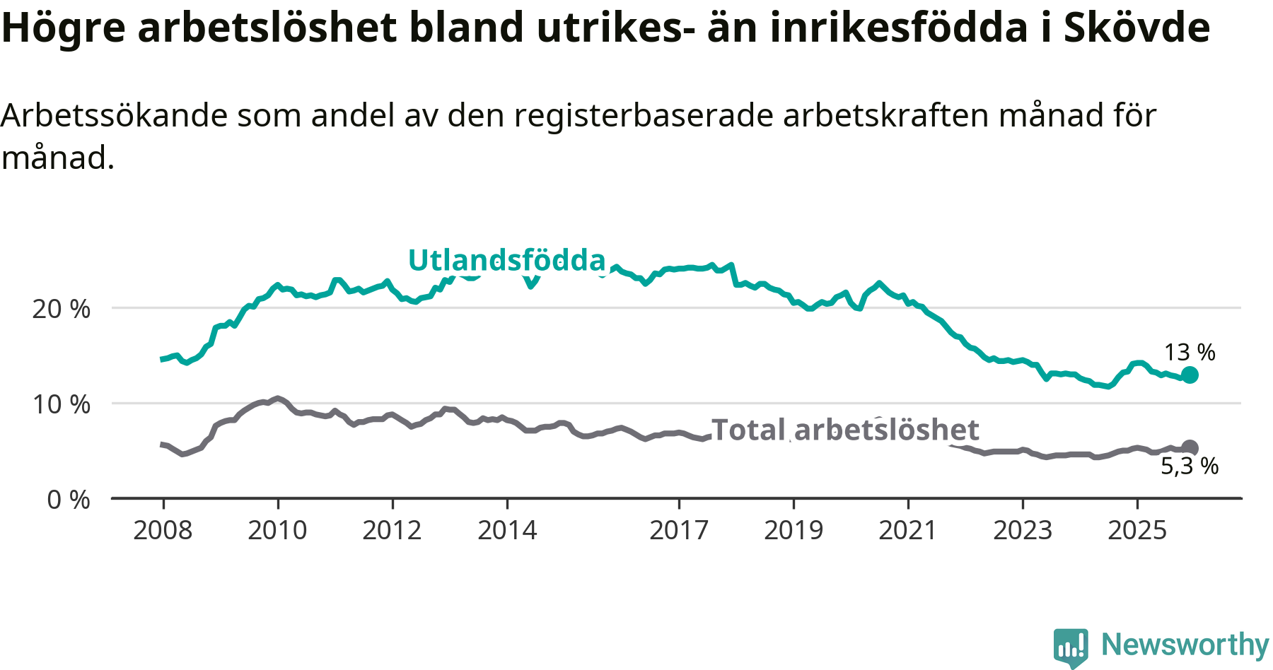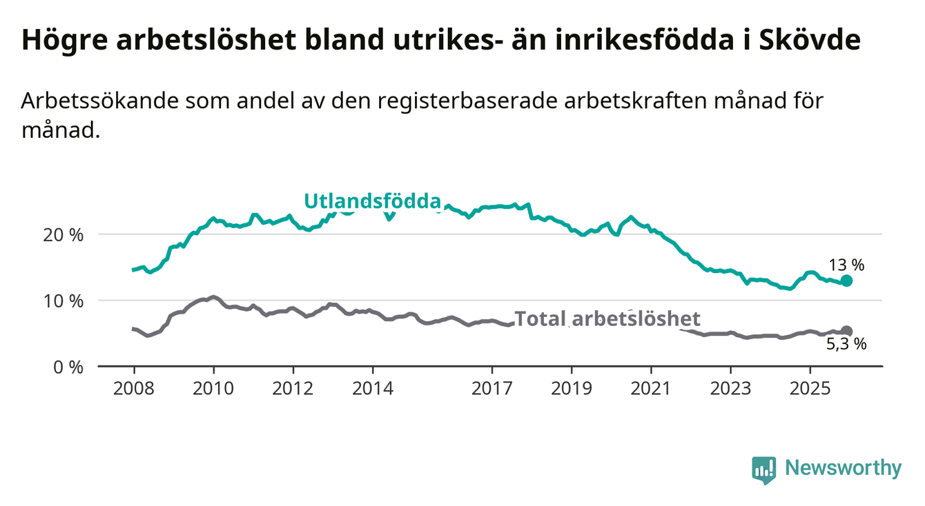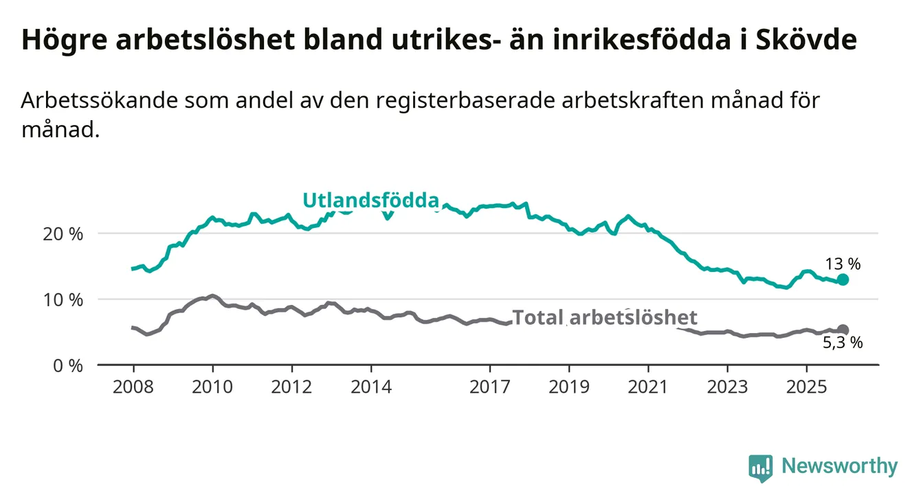 Arbetslösheten bland utlandsfödda var 13,0 procent i Skövde under december månad, motsvarande 766 av 5 892 personer. Det är 1,1 procentenheter färre än vid samma tidpunkt i fjol (−43 om man räknar personer).
