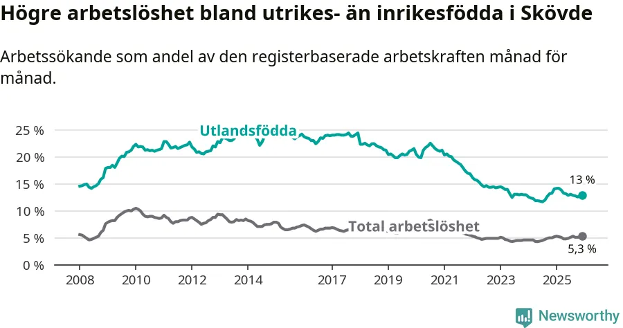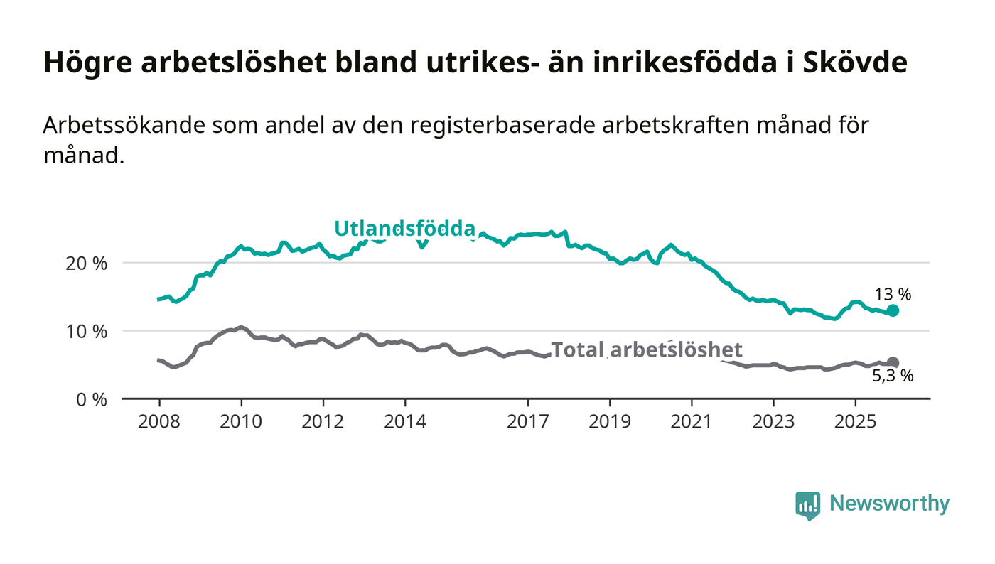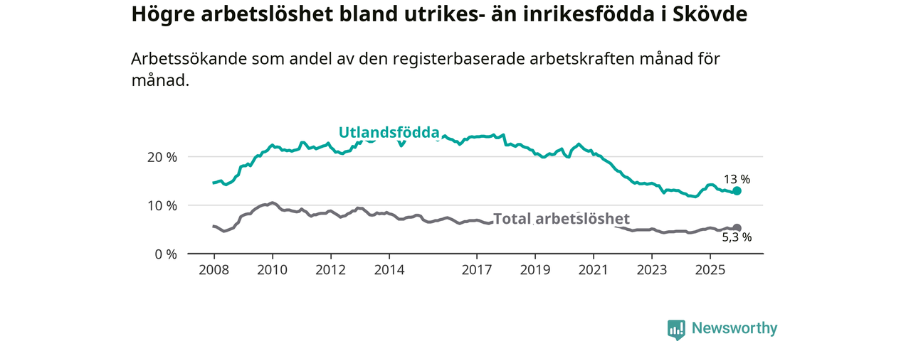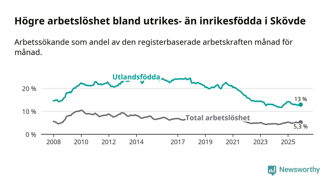 Skillnaden i arbetslöshet mellan utrikesfödda och hela befolkningen är 7,7 procentenheter i Skövde. Det är en mindre skillnad än för ett år sedan (−1,2 procentenheter).