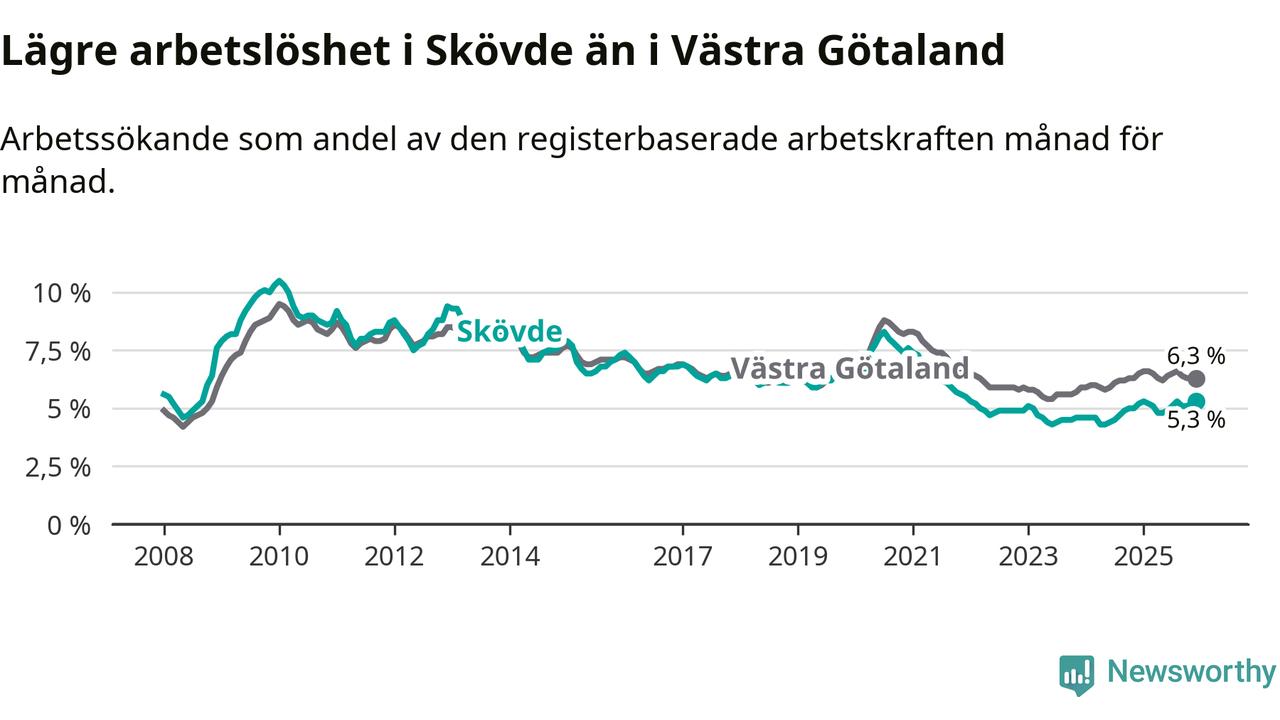 Graf: Arbetslöshet i Skövde kommun och Västra Götalands län