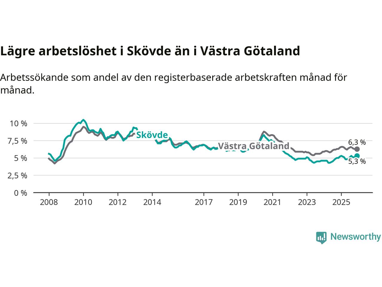 Även om arbetslösheten i Skövde alltså ökar, så ligger den fortfarande under snittet i hela Västra Götalands län (5,3 procent i kommunen, jämfört med 6,3 procent i hela länet). Öckerö har den lägsta arbetslösheten i länet (3,0 procent), medan Gullspång har den högsta (8,8 procent). För att Skövde skulle komma ner i samma arbetslöshetsnivå som Öckerö skulle 687 personer behöva sysselsättas.
