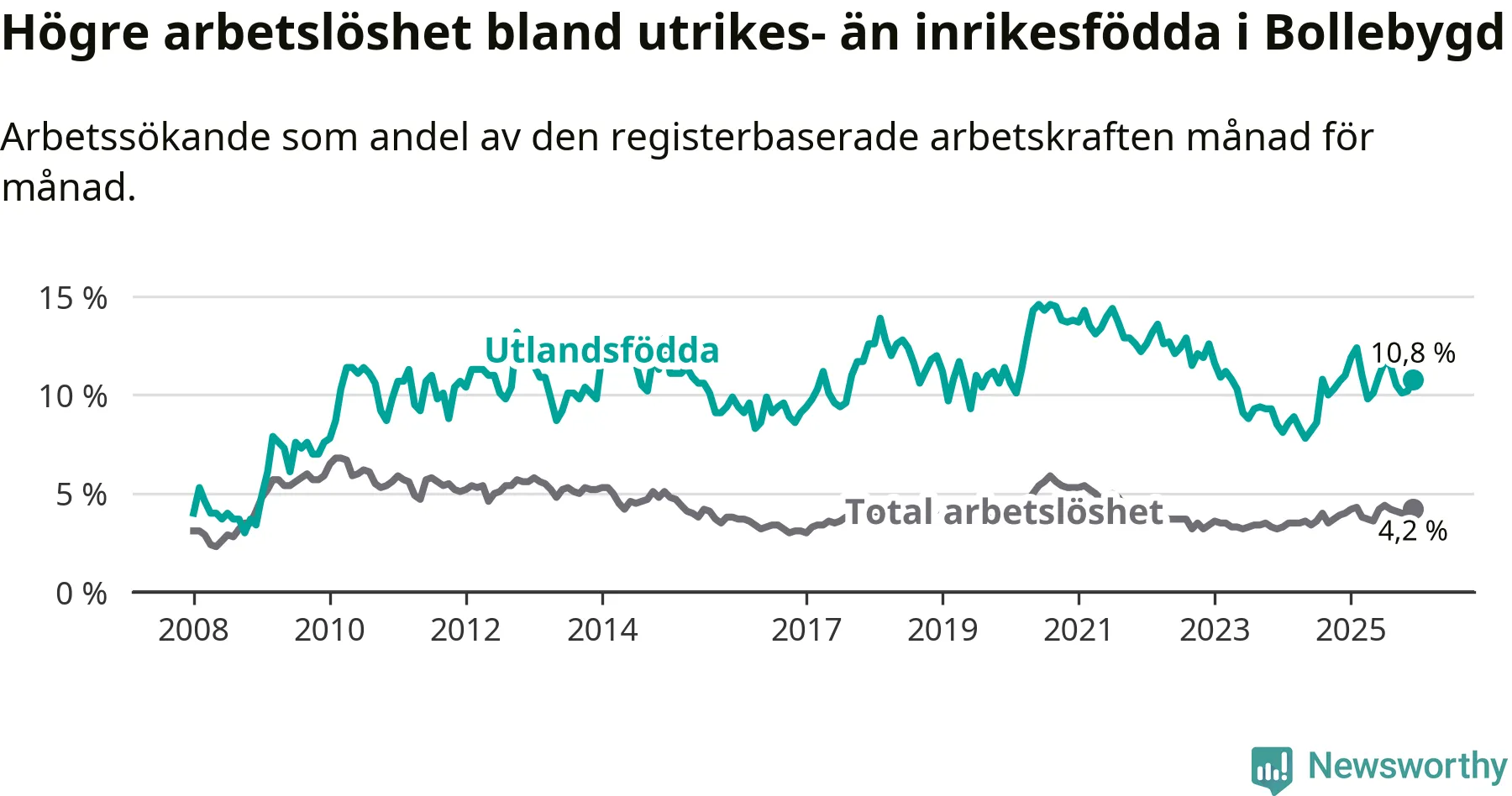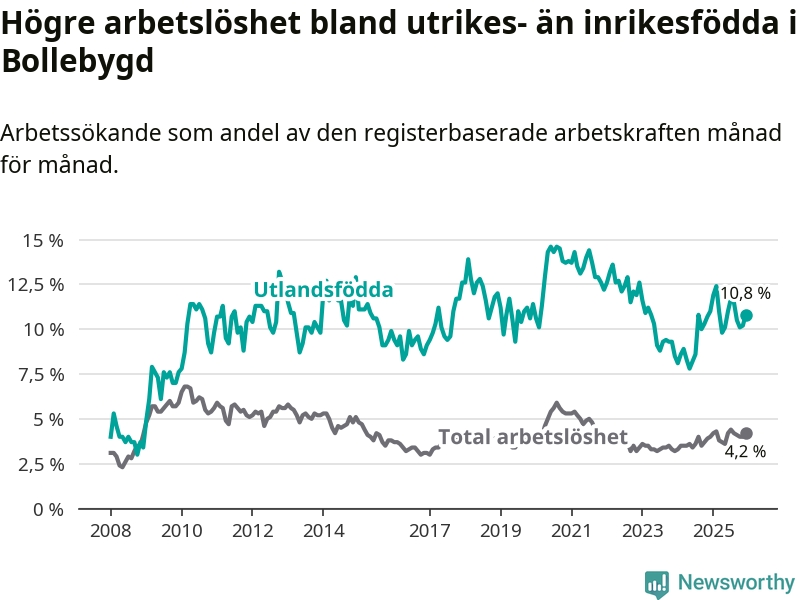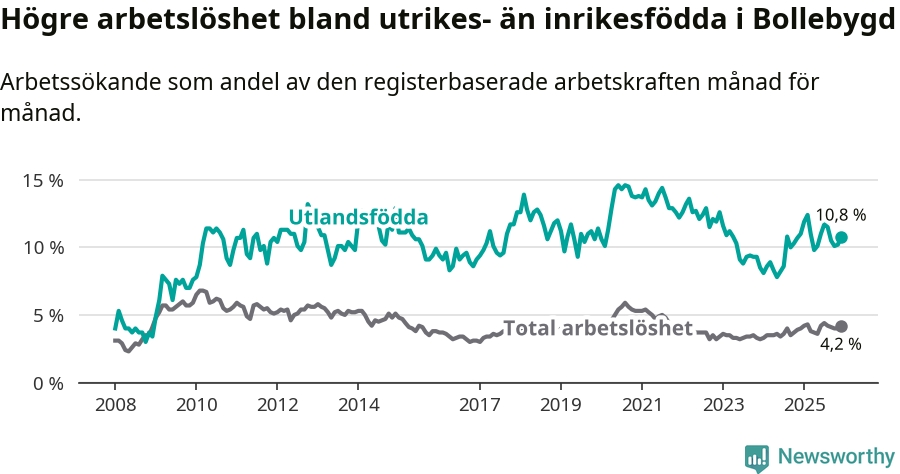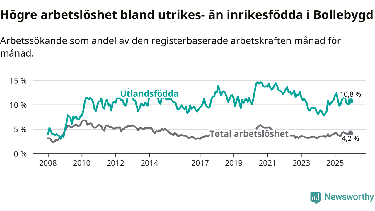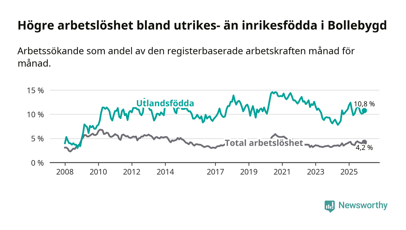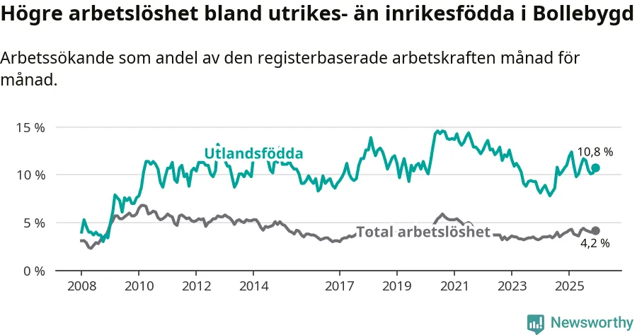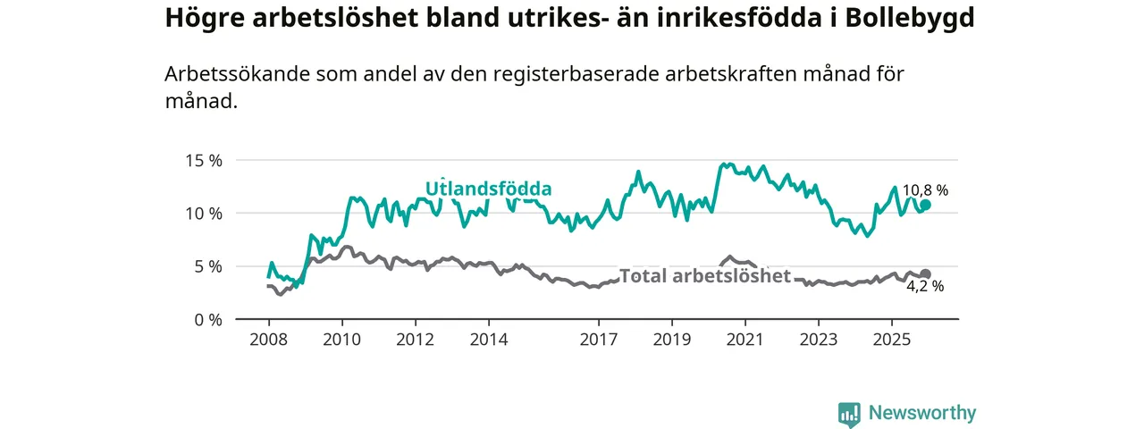 Arbetslösheten bland utlandsfödda var 10,8 procent i Bollebygd under december månad, motsvarande 71 av 657 personer. Det är 0,2 procentenheter färre än vid samma tidpunkt i fjol (+3 om man räknar personer).