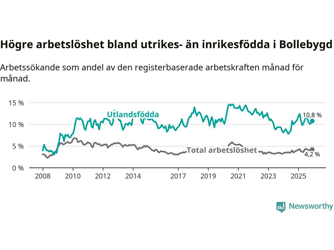 | Bland utlandsfödda | 10,8 % | −0,2 % ▼ | 13,4 % | −1,0 % ▼ | 14,3 % | −1,4 % ▼ |