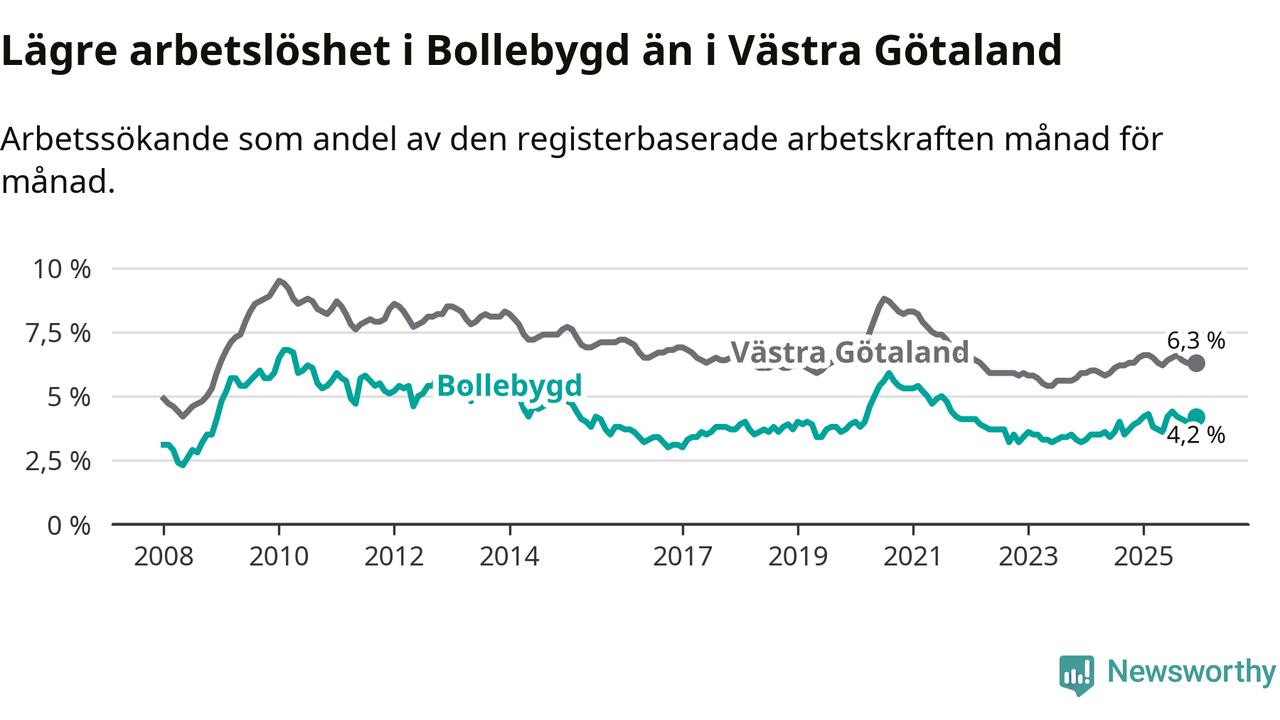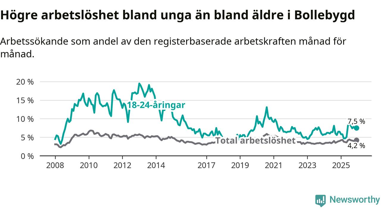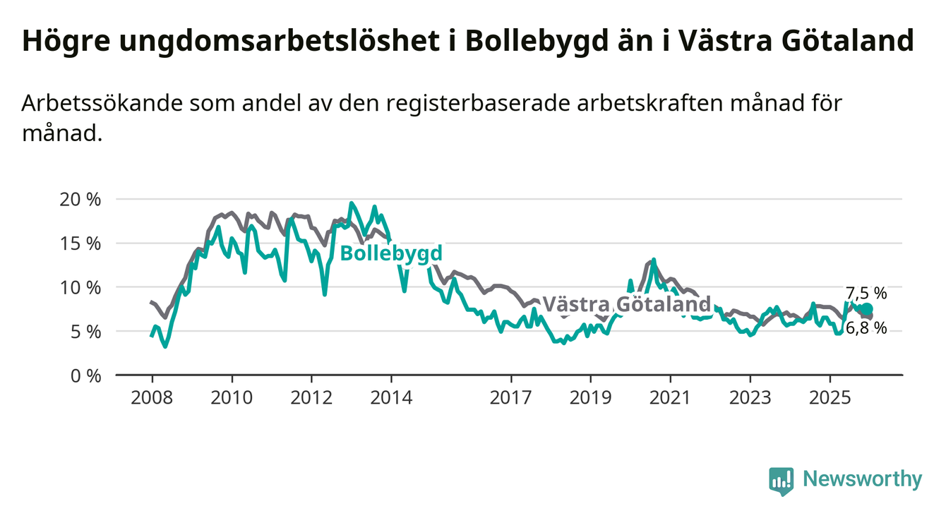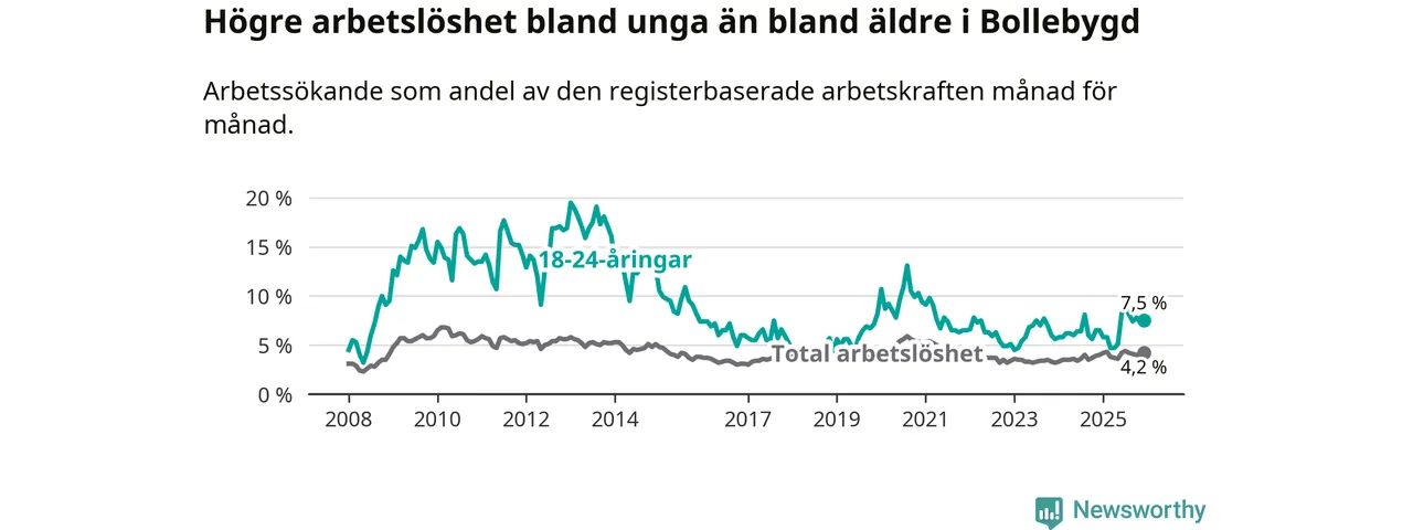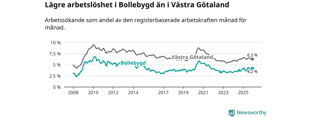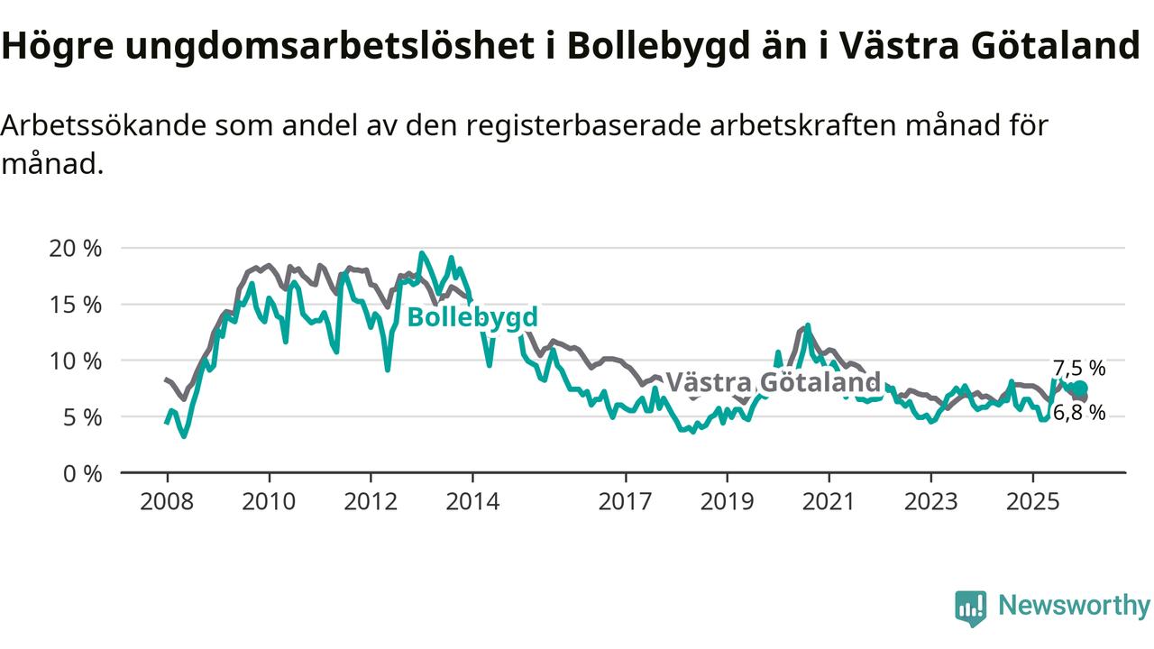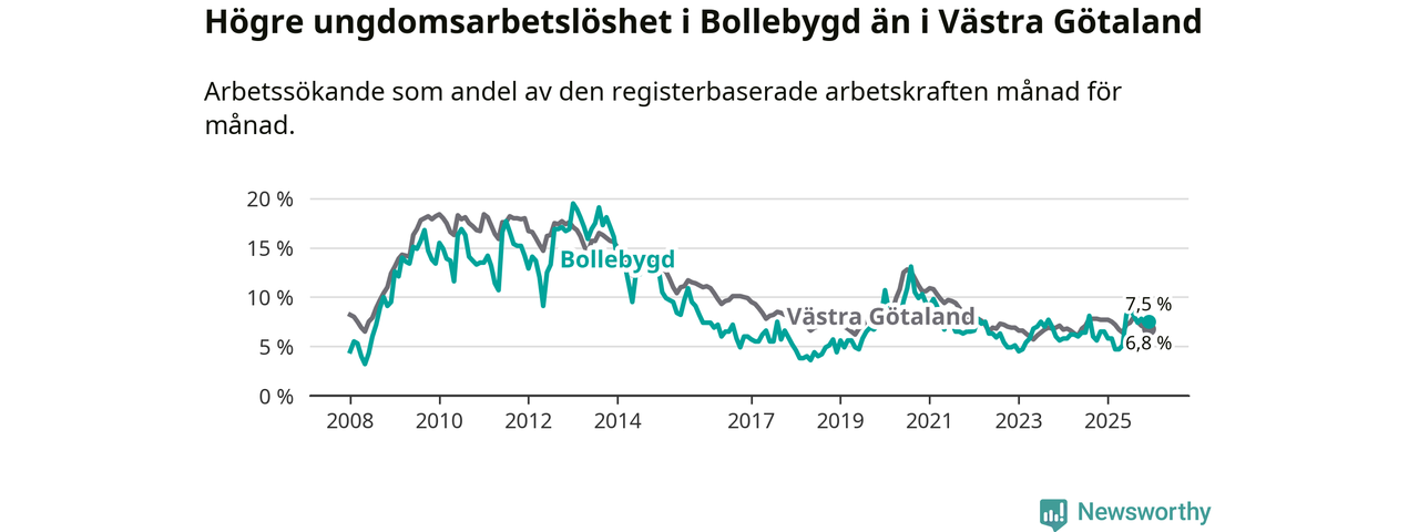 Medan Bollebygd har lägre total arbetslöshet än Västra Götaland, ligger ungdomsarbetslösheten 0,7 procentenheter högre i Bollebygd.