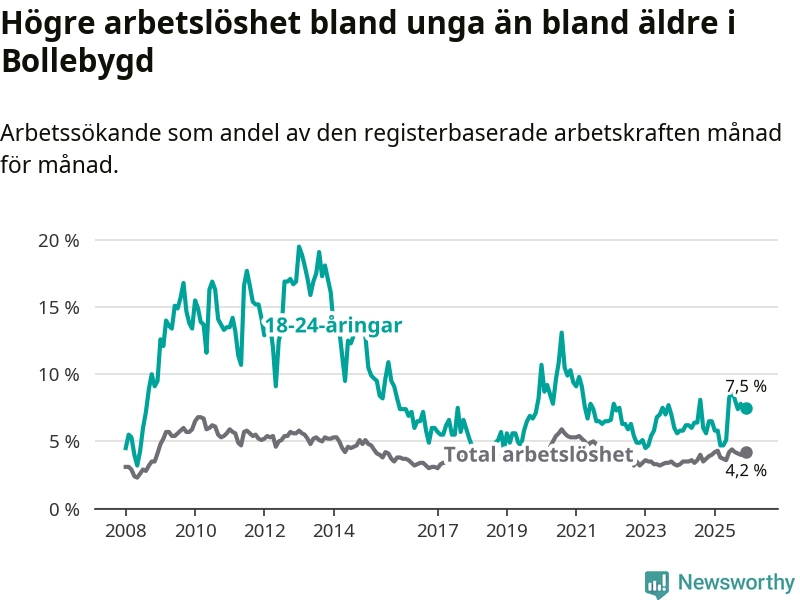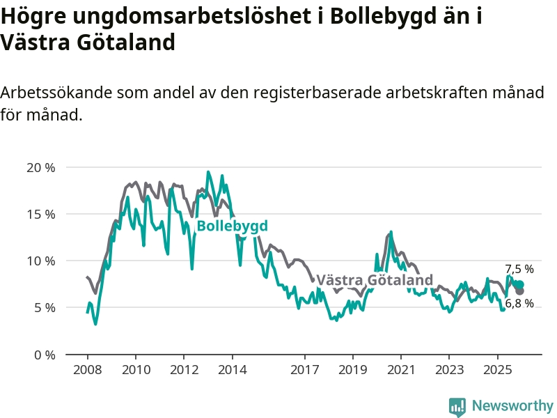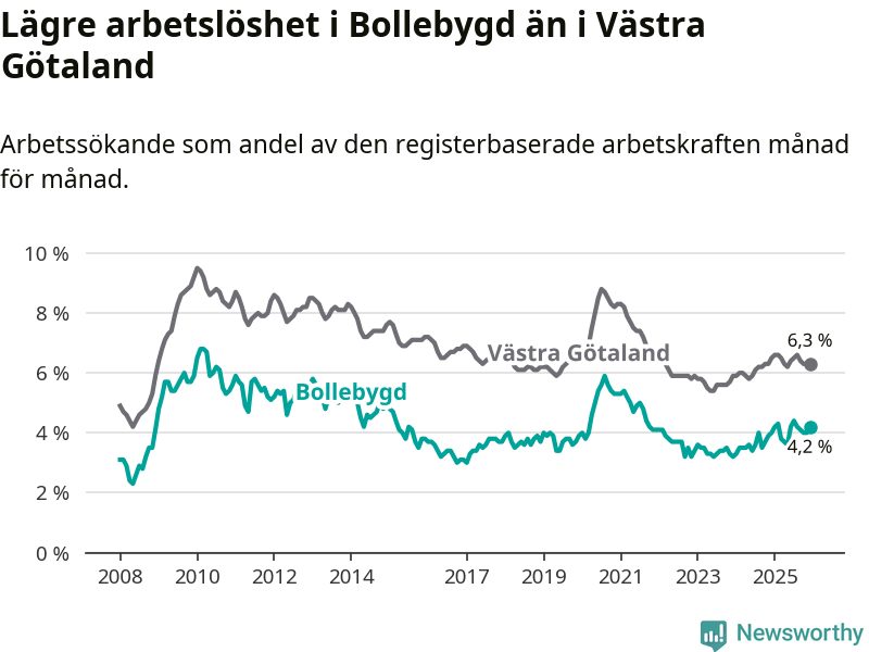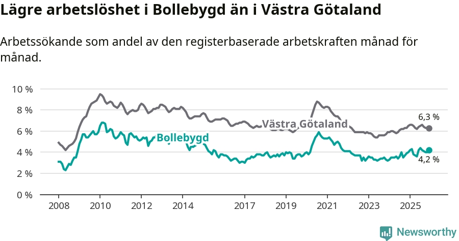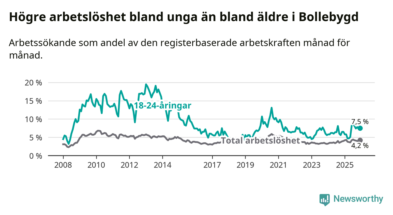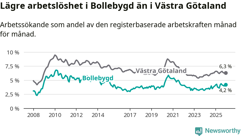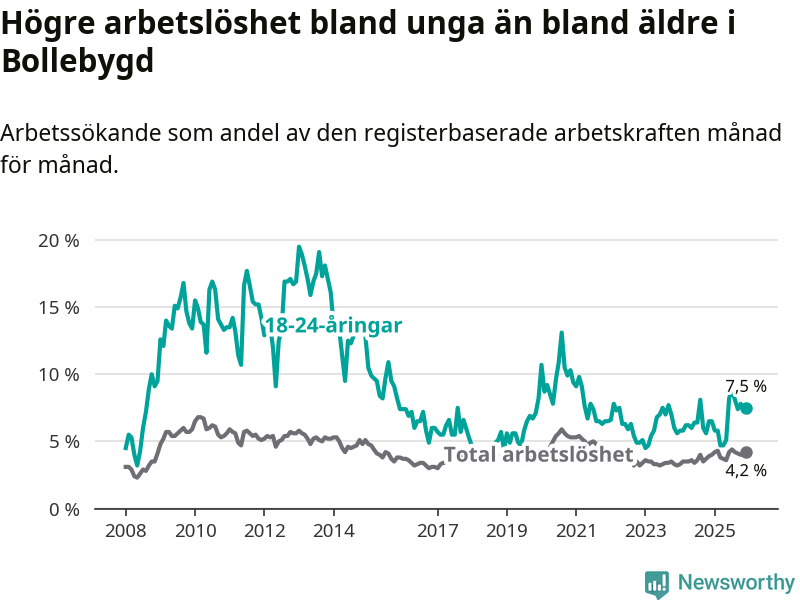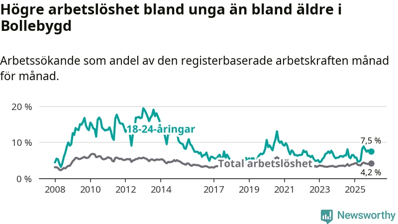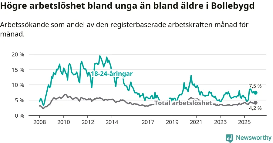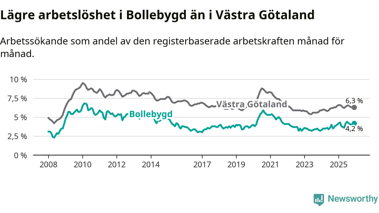 Medan Bollebygd har lägre total arbetslöshet än Västra Götaland, ligger ungdomsarbetslösheten 0,7 procentenheter högre i Bollebygd.