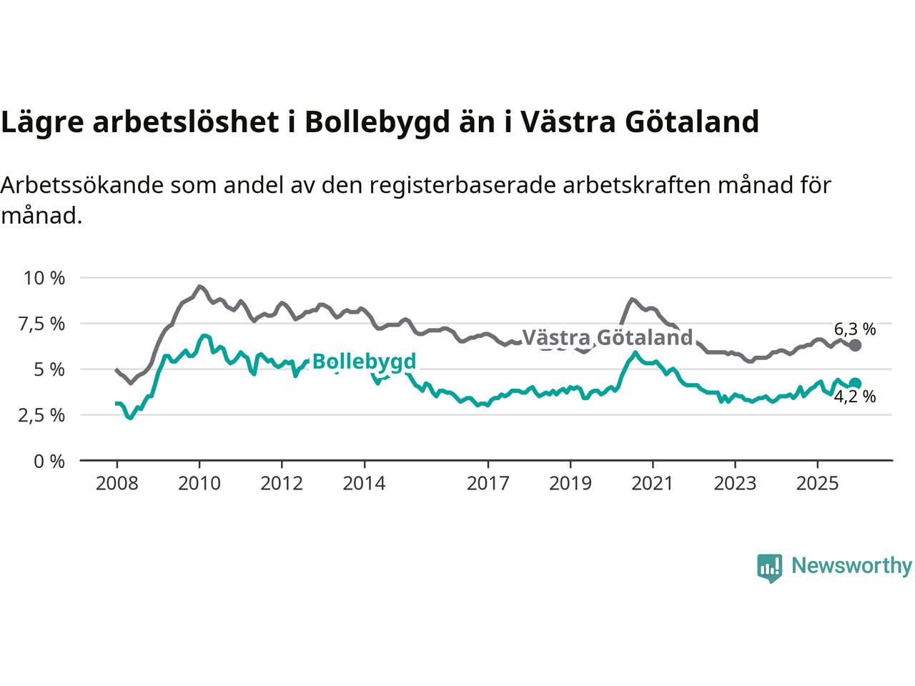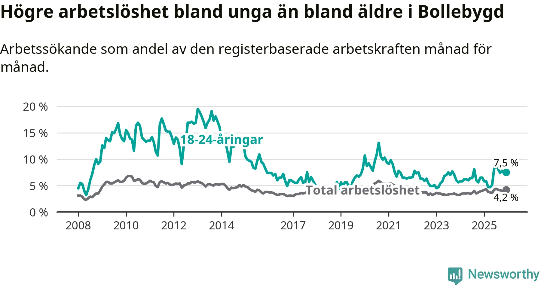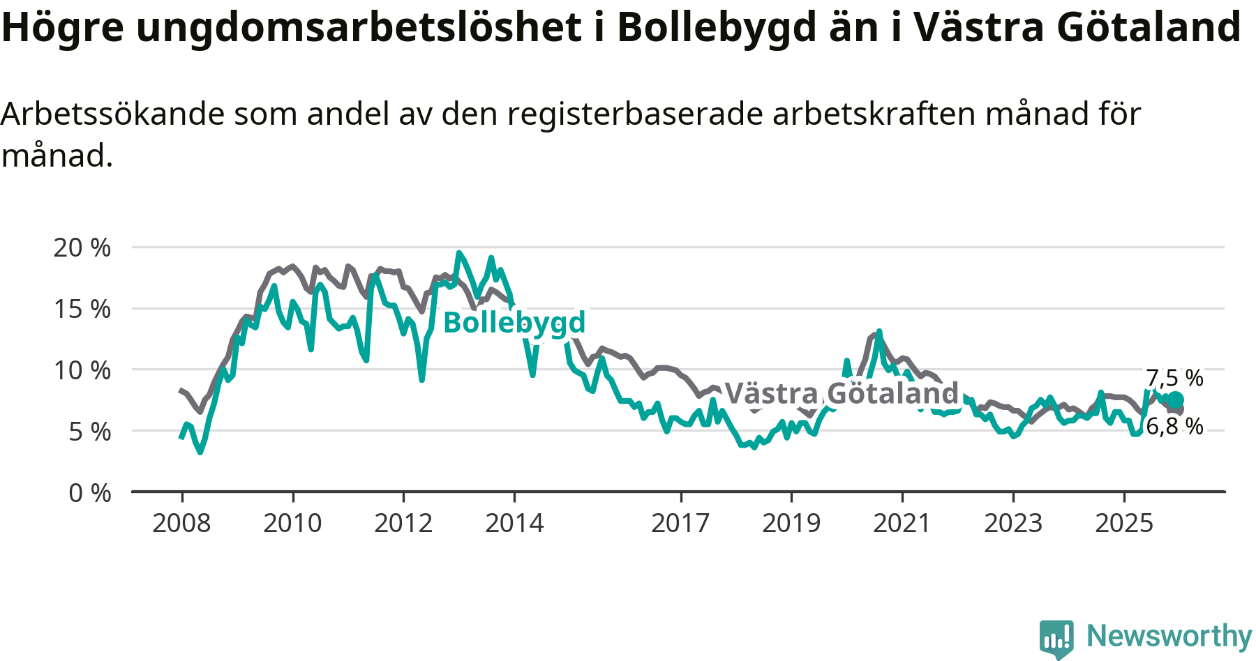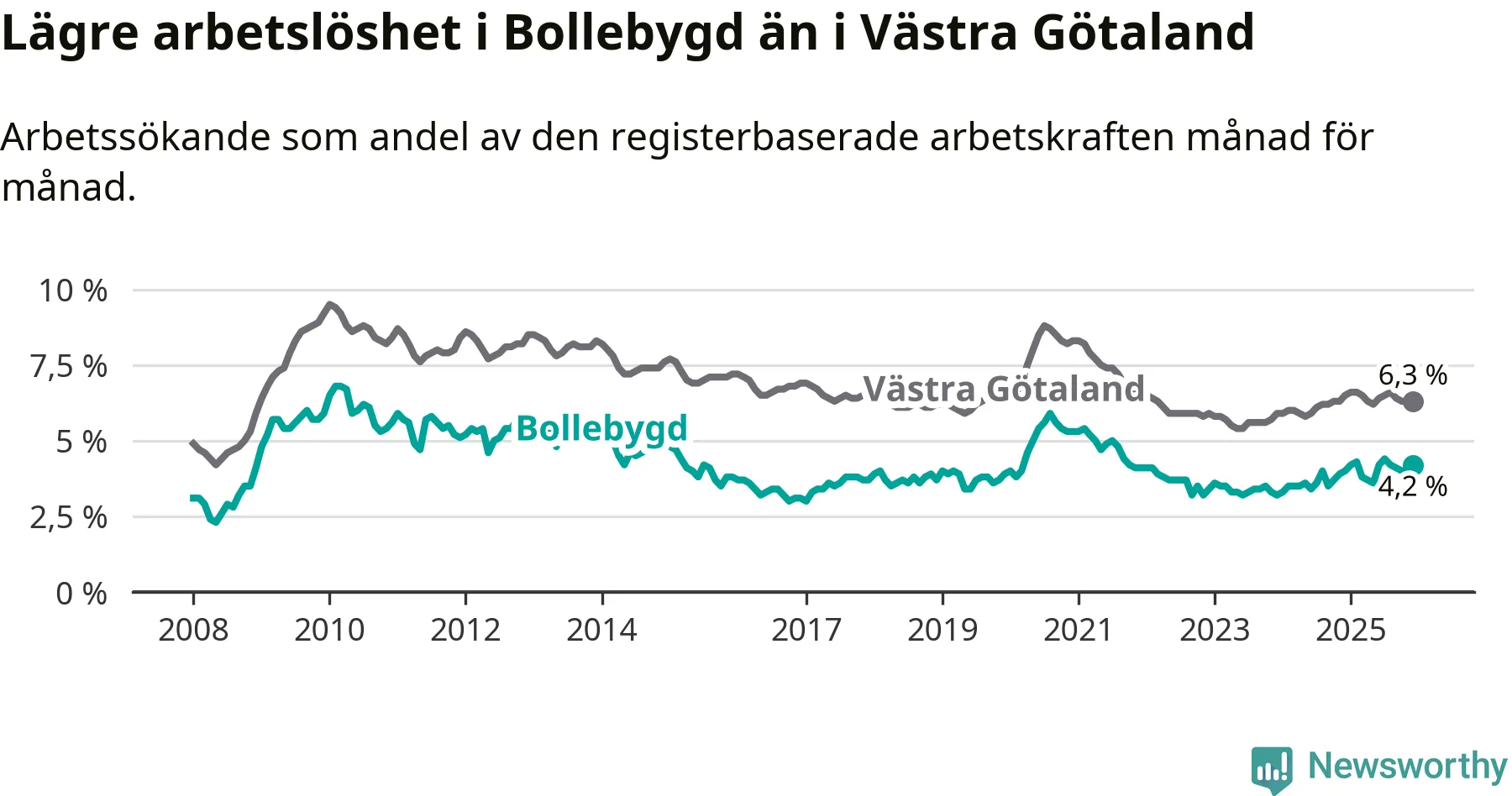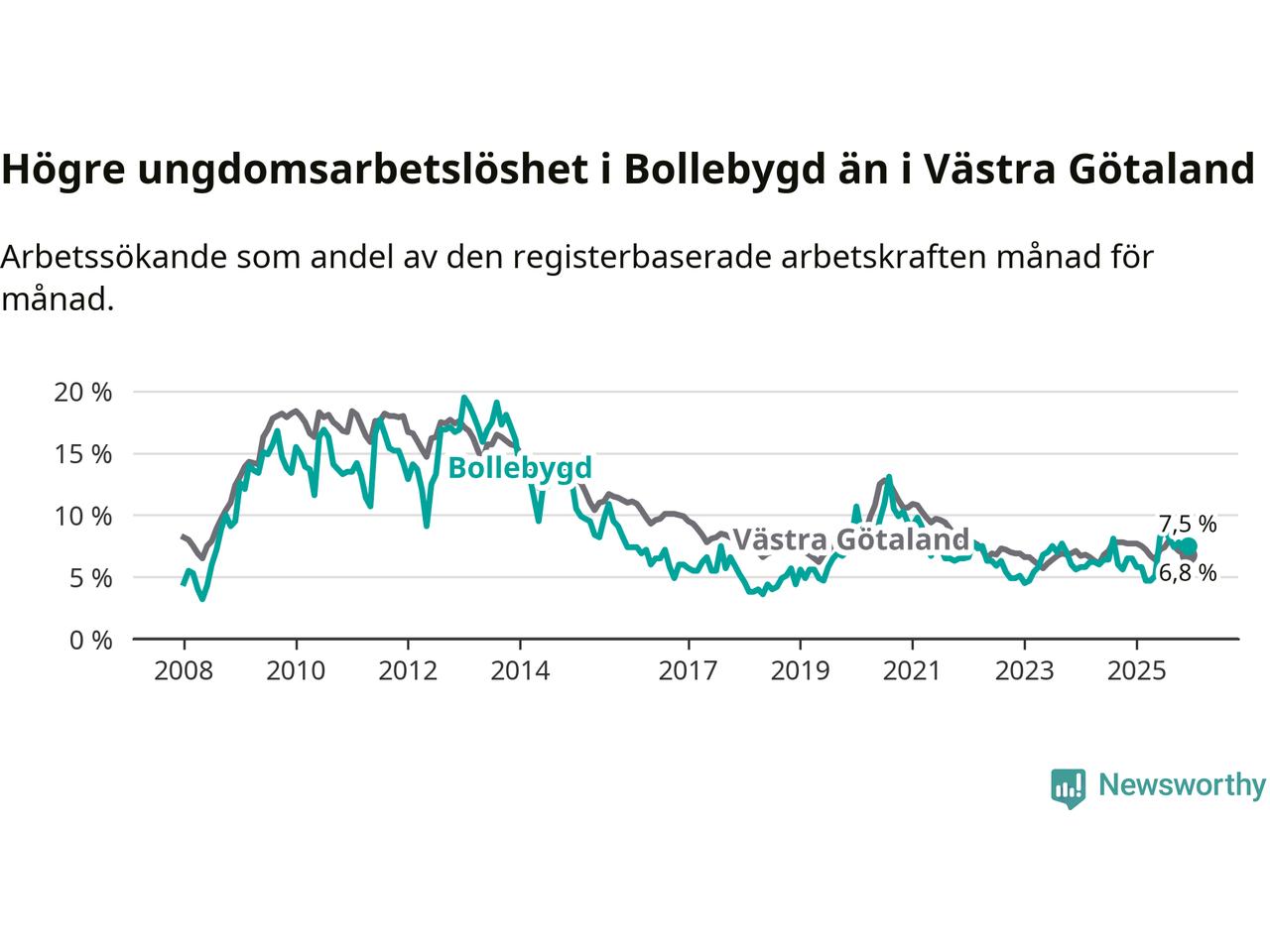 Medan Bollebygd har lägre total arbetslöshet än Västra Götaland, ligger ungdomsarbetslösheten 0,7 procentenheter högre i Bollebygd.