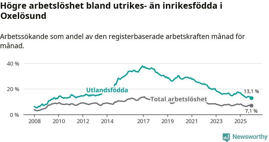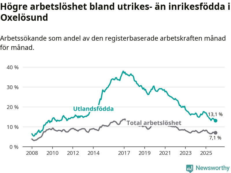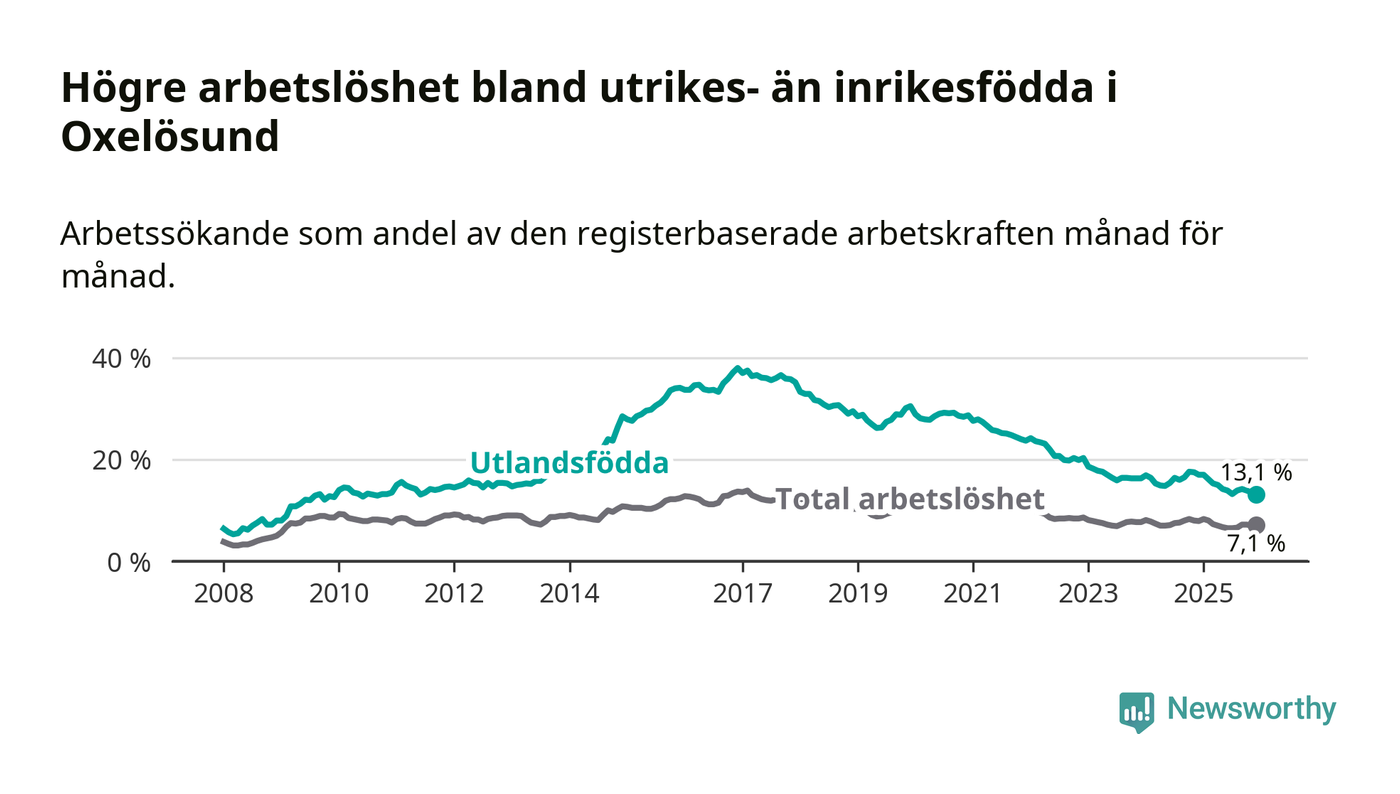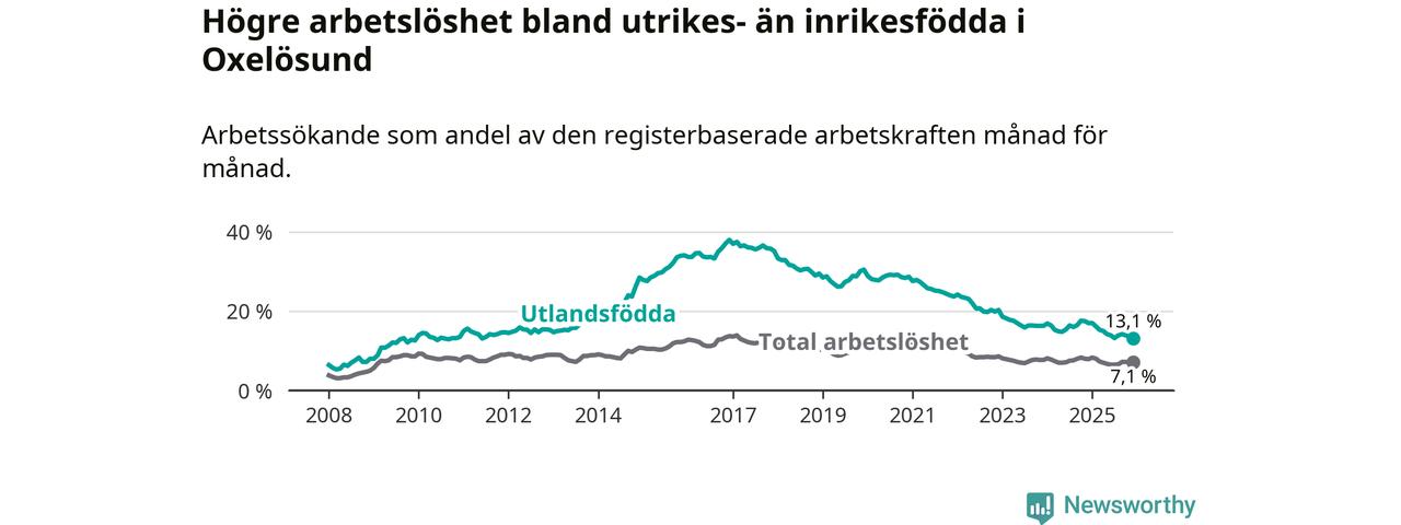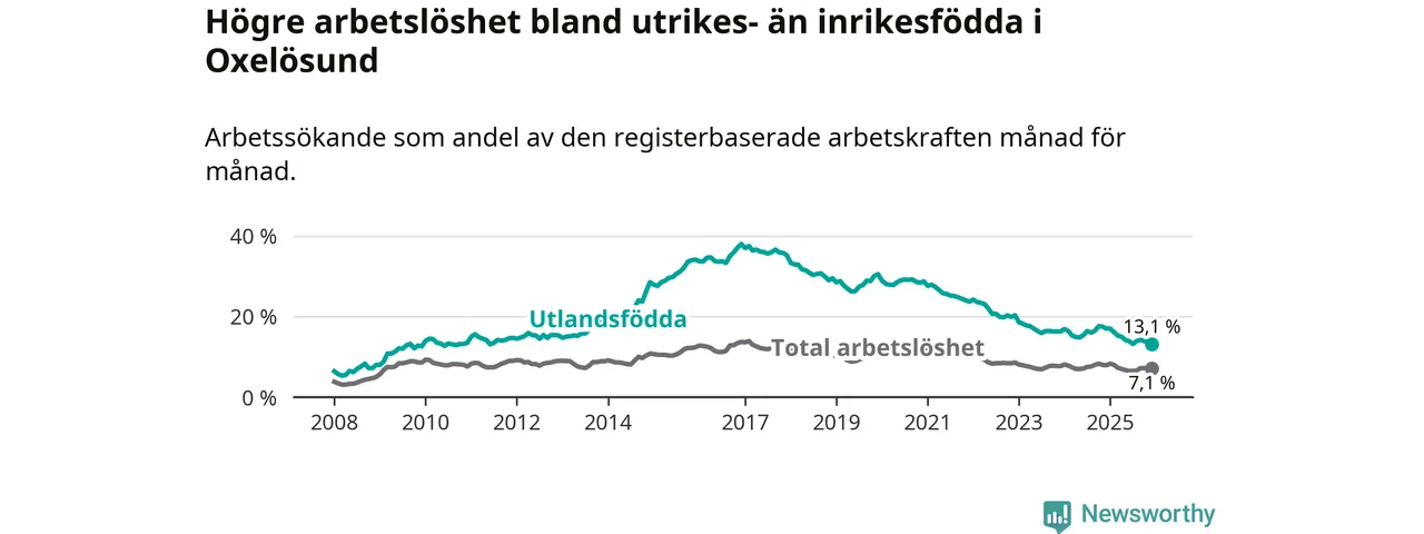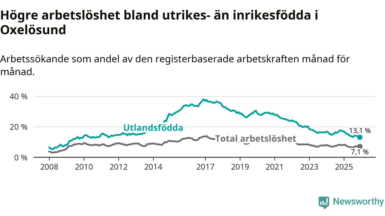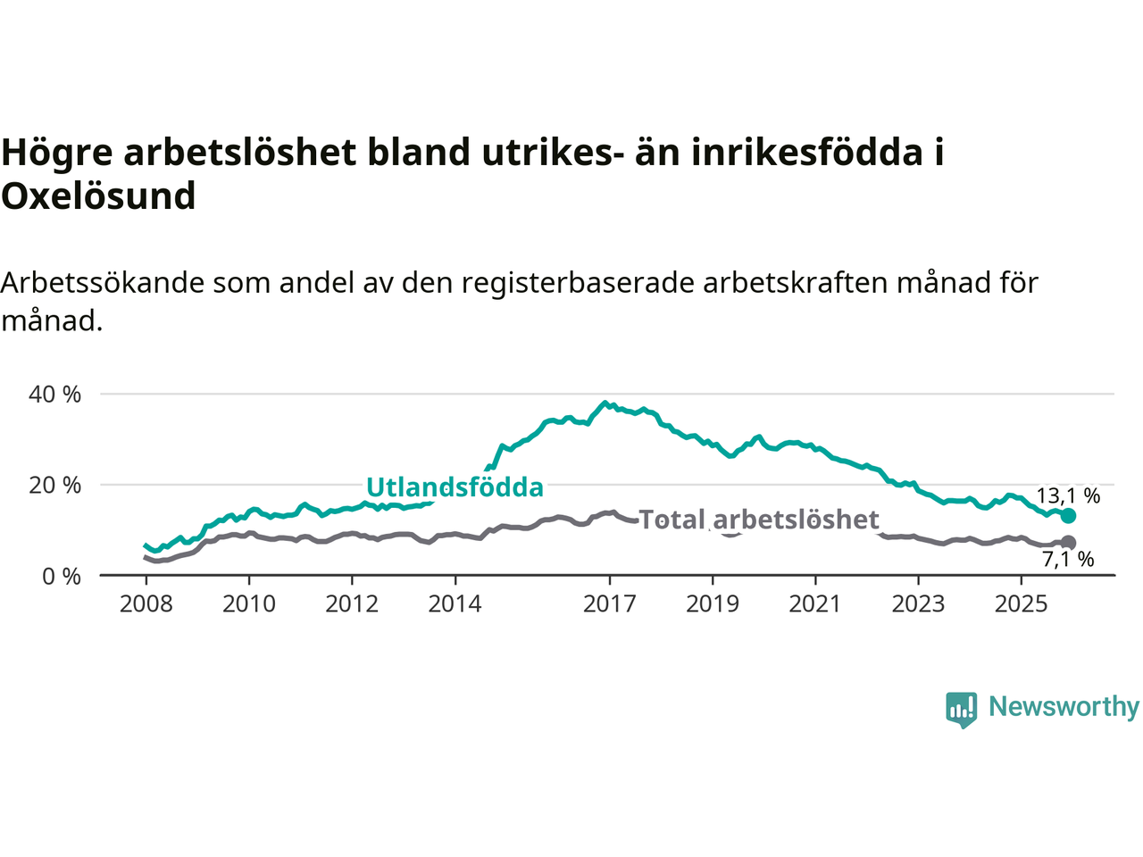 Arbetslösheten bland utlandsfödda var 13,1 procent i Oxelösund under december månad, motsvarande 175 av 1 336 personer. Det är 3,9 procentenheter färre än vid samma tidpunkt i fjol (−53 om man räknar personer). Därmed är de utlandsföddas arbetslöshet lägre än vid samma tidpunkt i fjol för åttonde månaden i följd. Sedan april 2025 har arbetslösheten bland utlandsfödda minskat från 15,0 till 13,1 procent. Den nuvarande arbetslöshetsnivån är den lägsta sedan juni 2011.