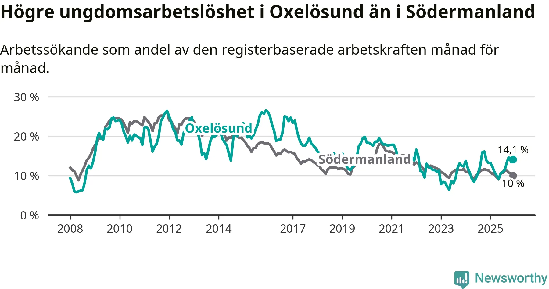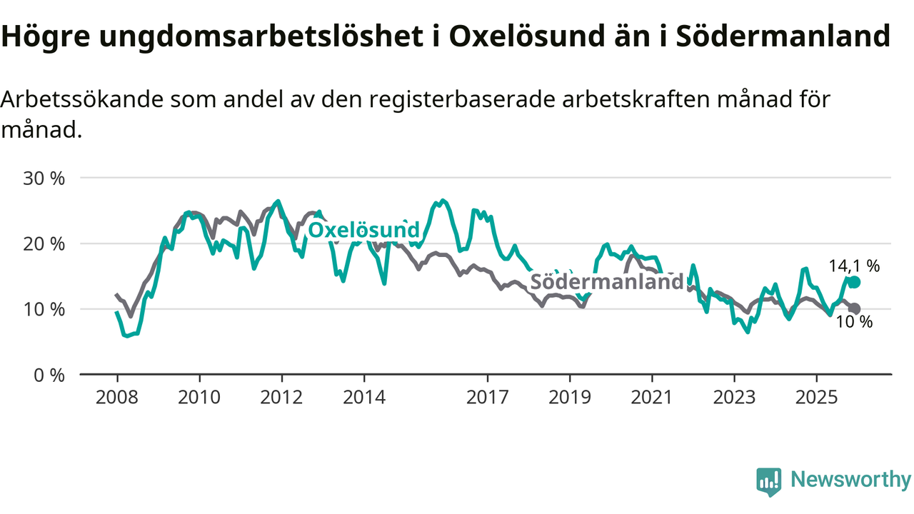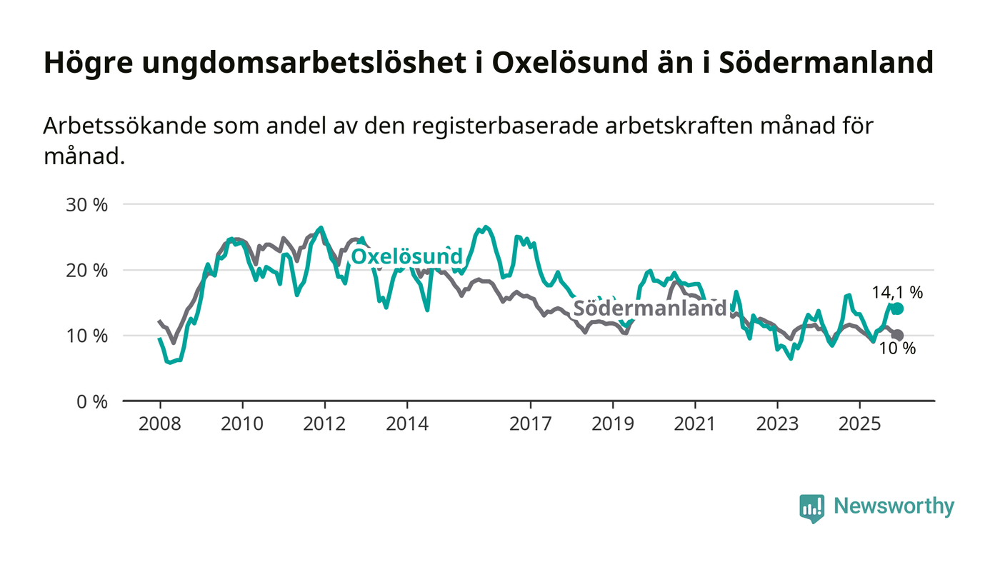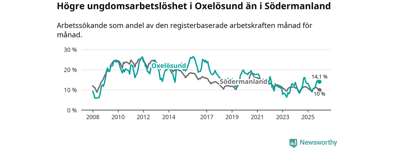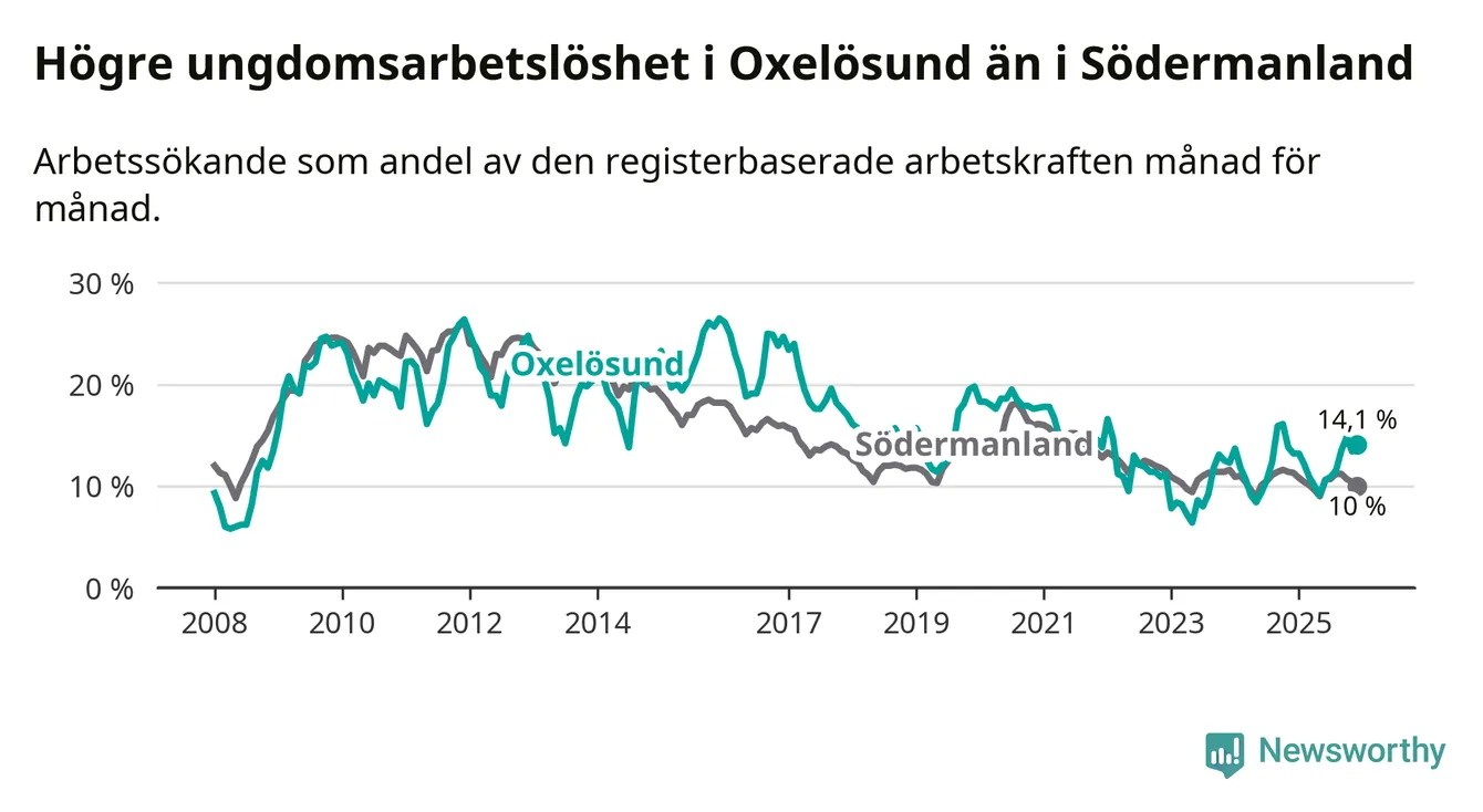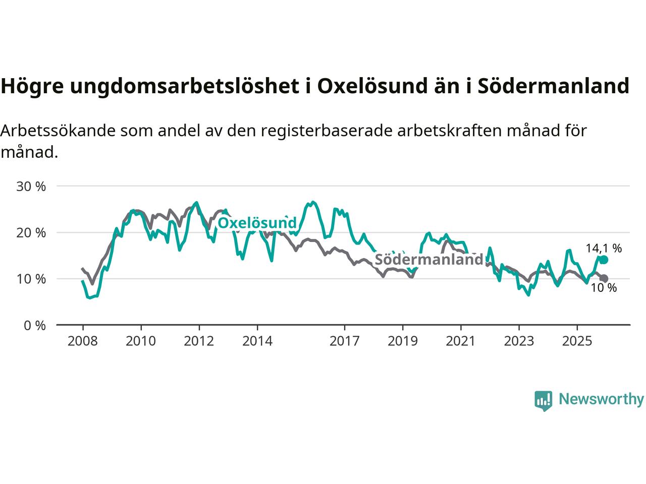Medan Oxelösund har lägre total arbetslöshet än Södermanland, ligger ungdomsarbetslösheten 4,1 procentenheter högre i Oxelösund.