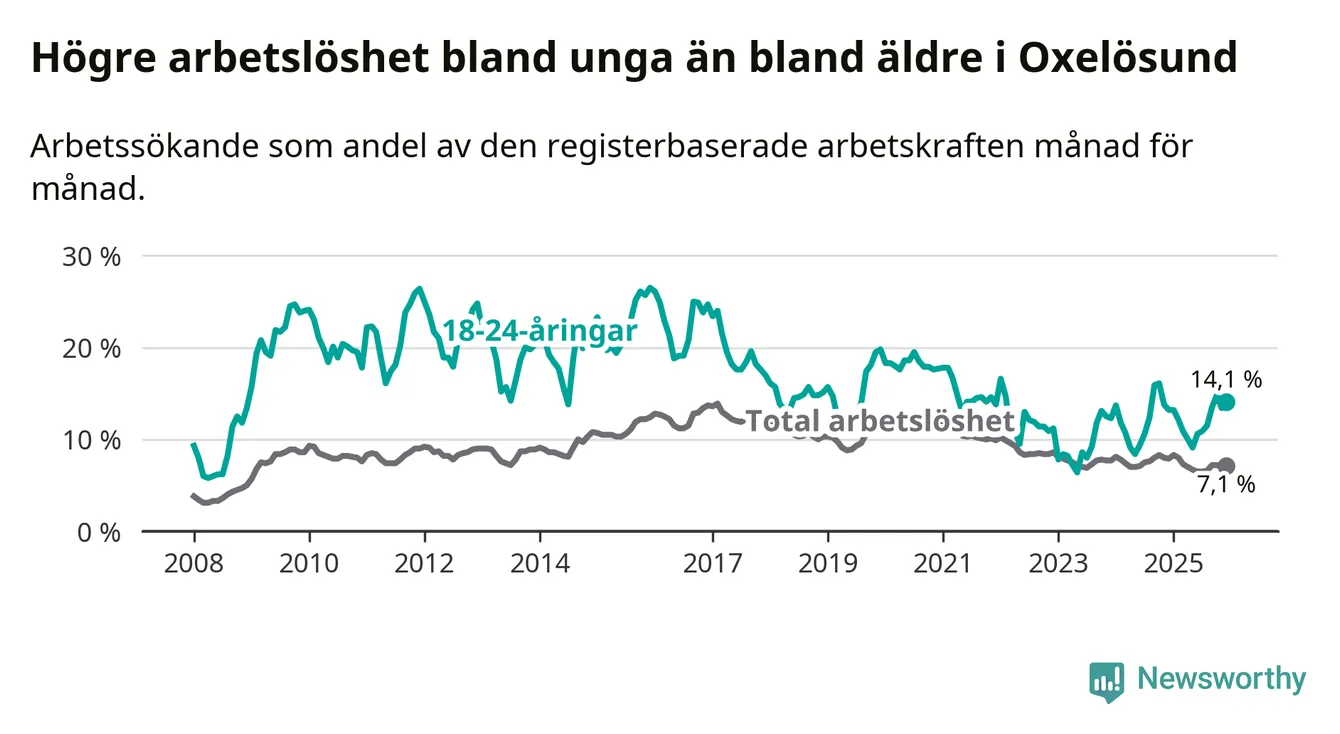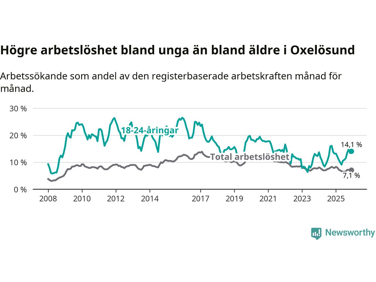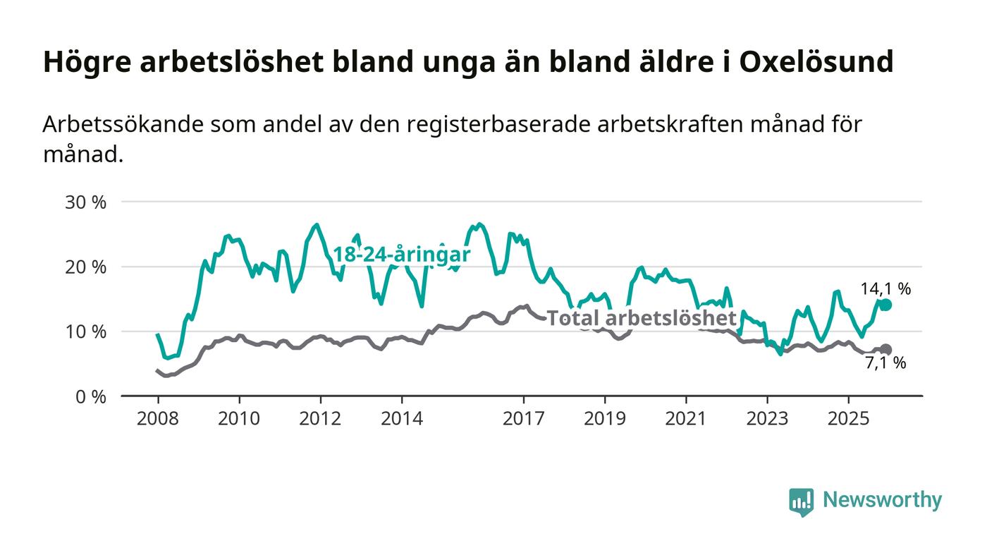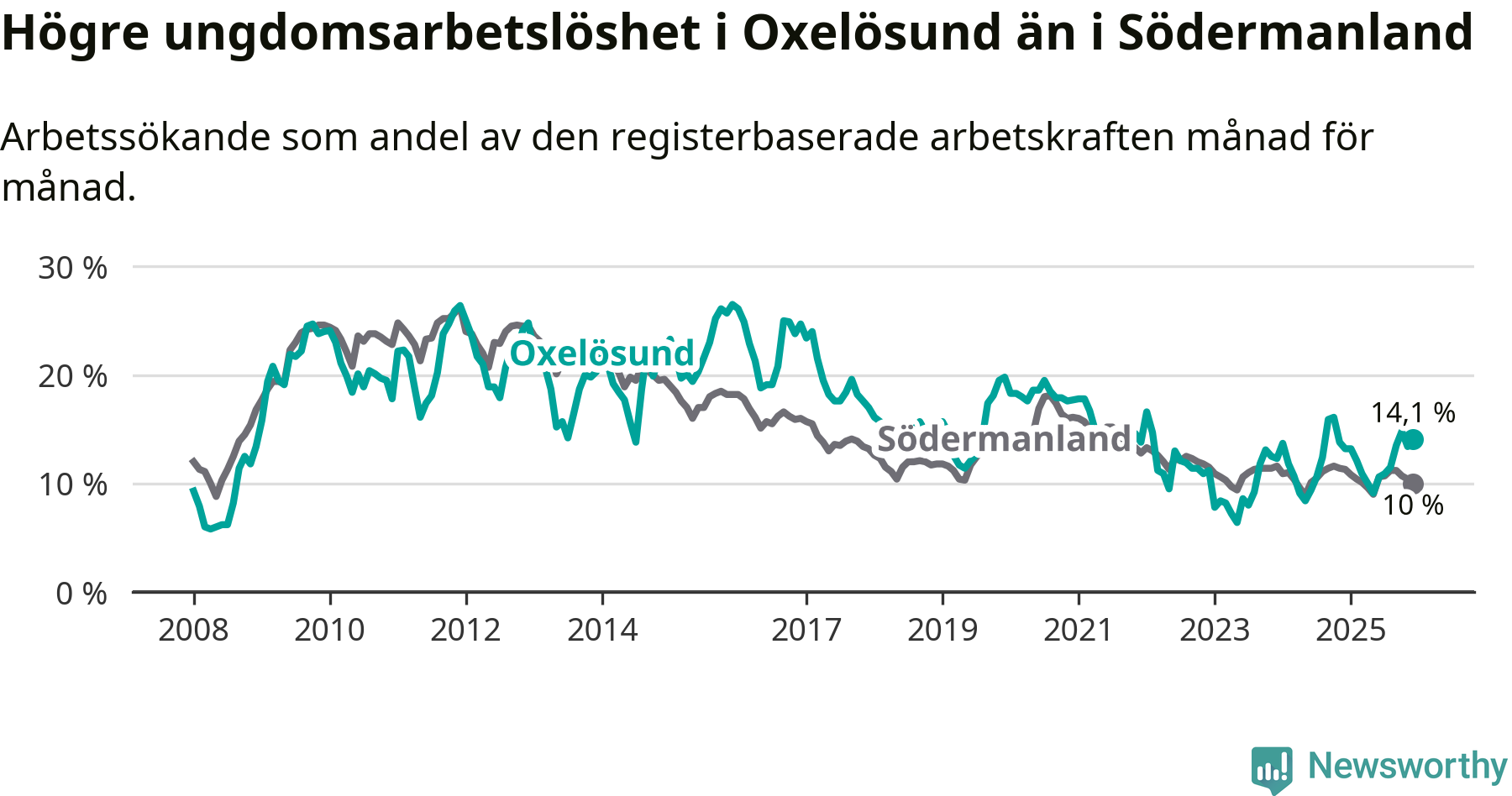 Medan Oxelösund har lägre total arbetslöshet än Södermanland, ligger ungdomsarbetslösheten 4,1 procentenheter högre i Oxelösund.