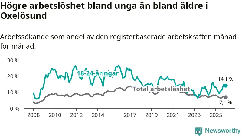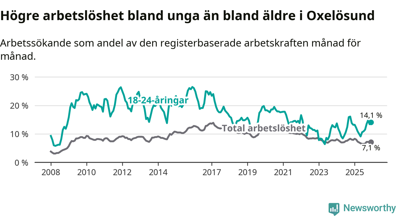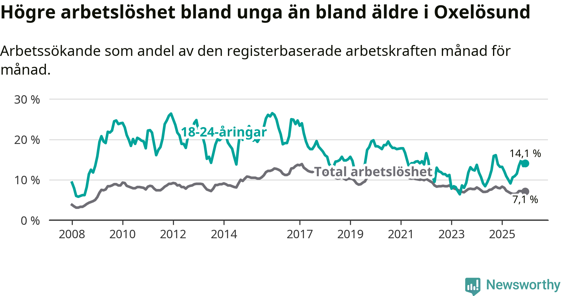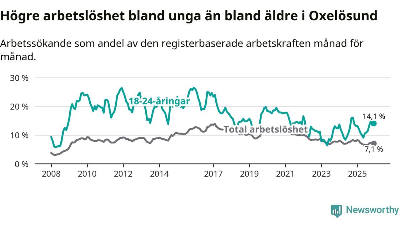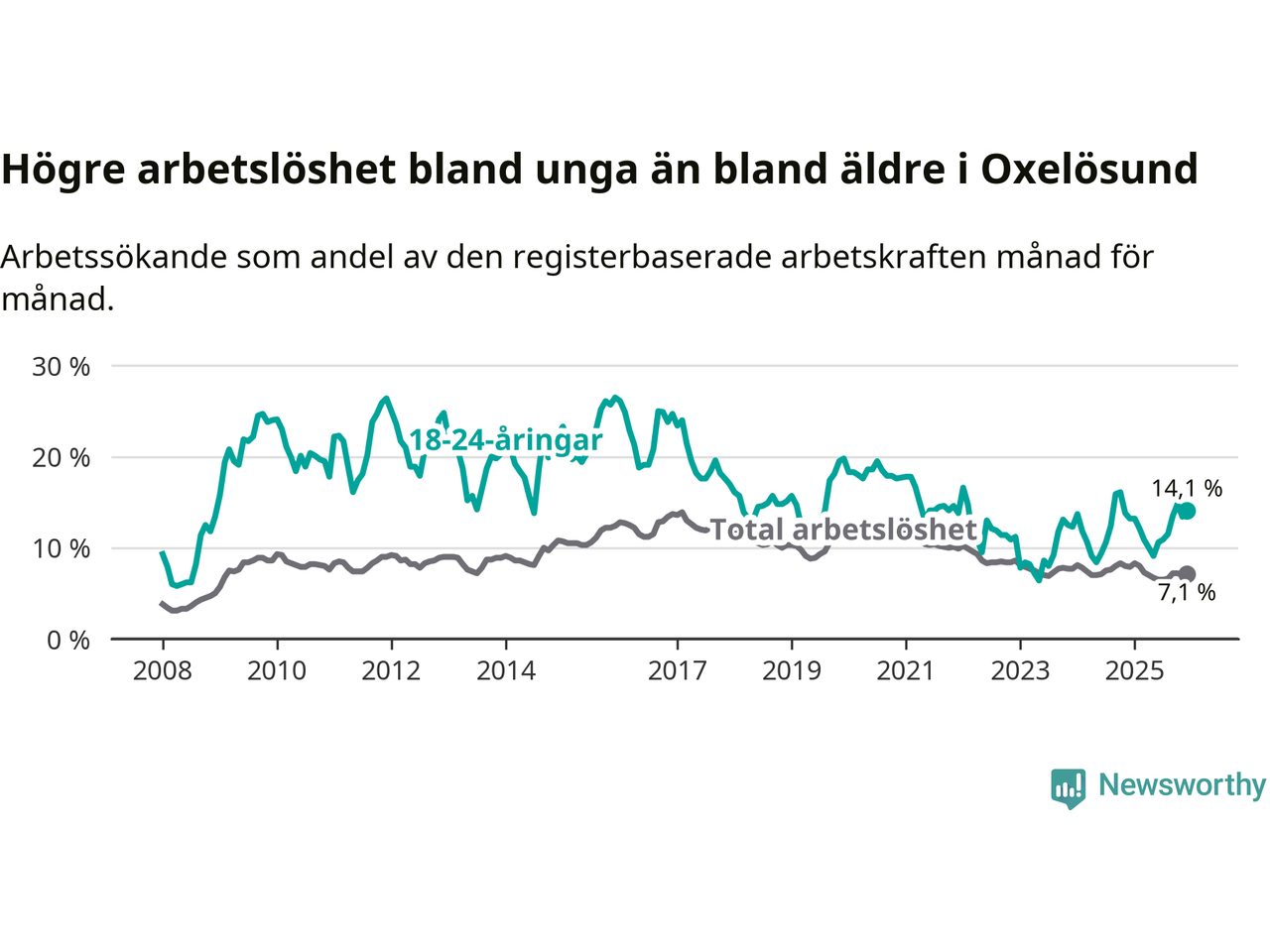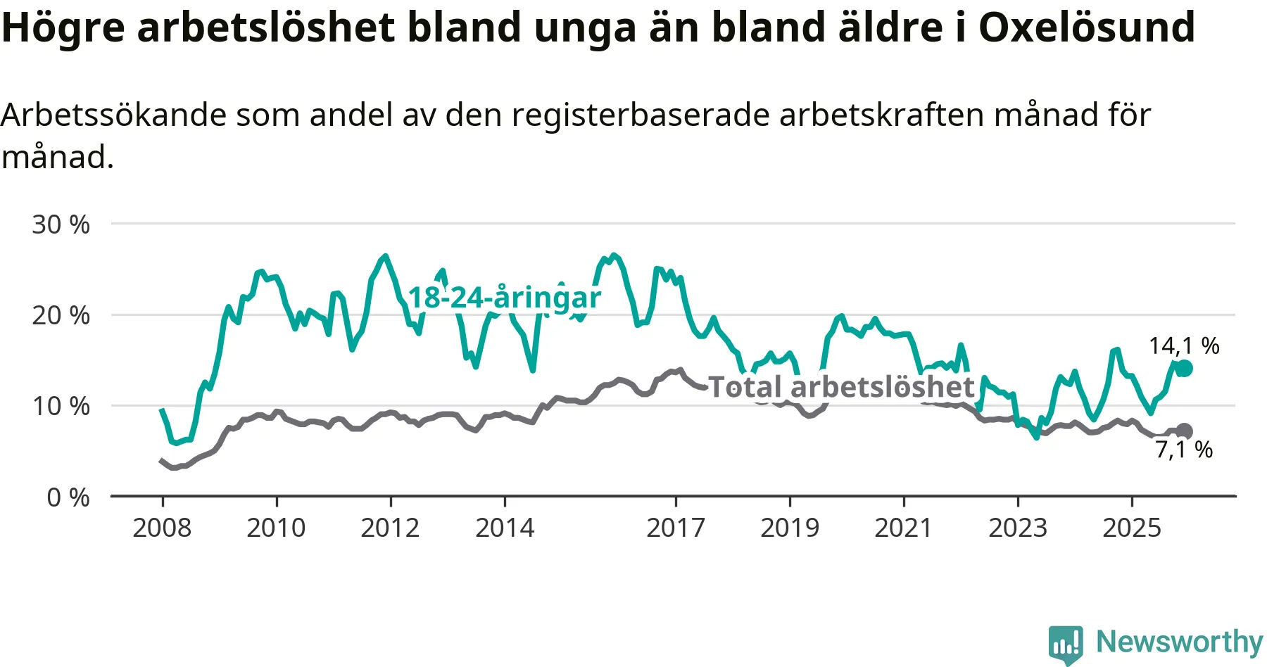 Medan Oxelösund har lägre total arbetslöshet än Södermanland, ligger ungdomsarbetslösheten 4,1 procentenheter högre i Oxelösund.