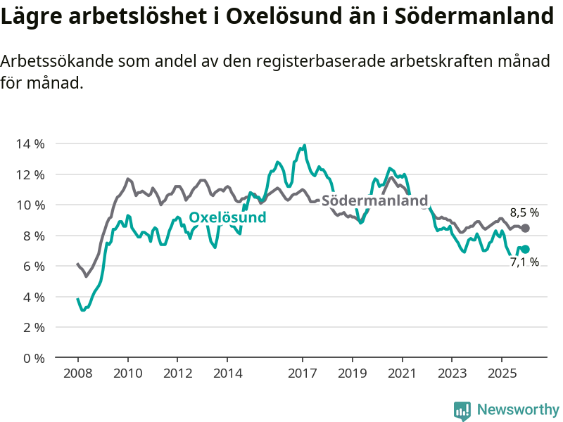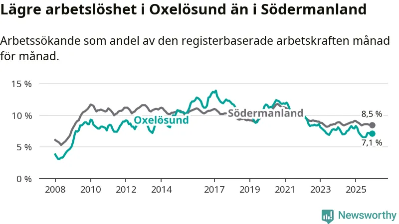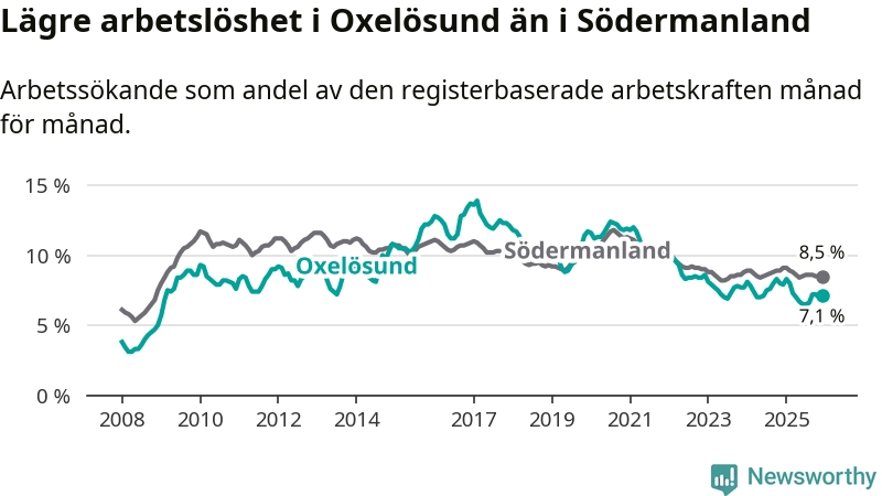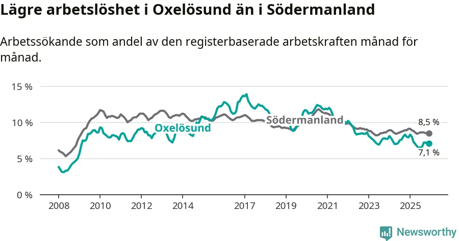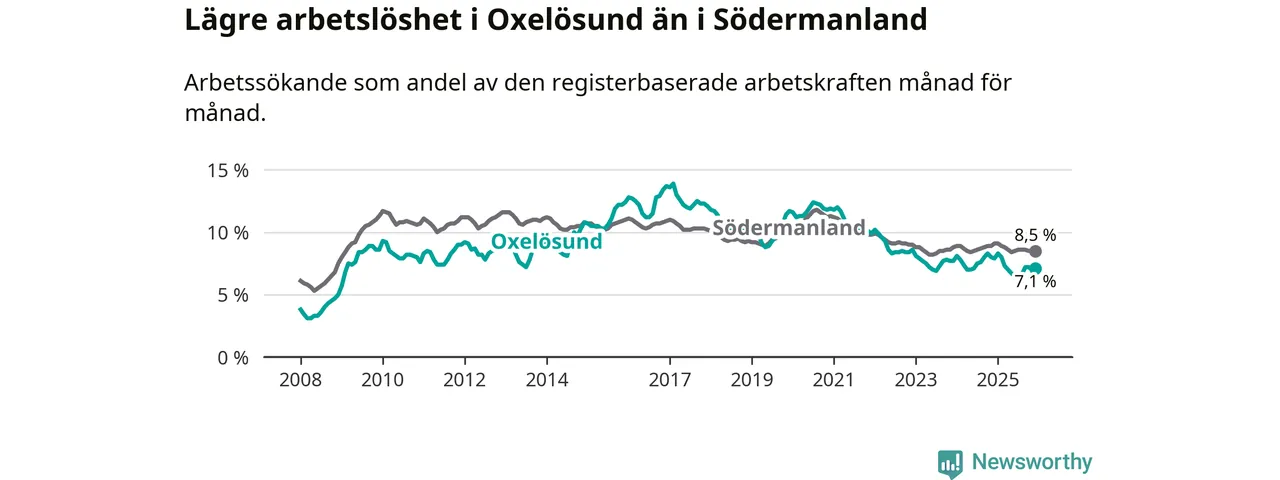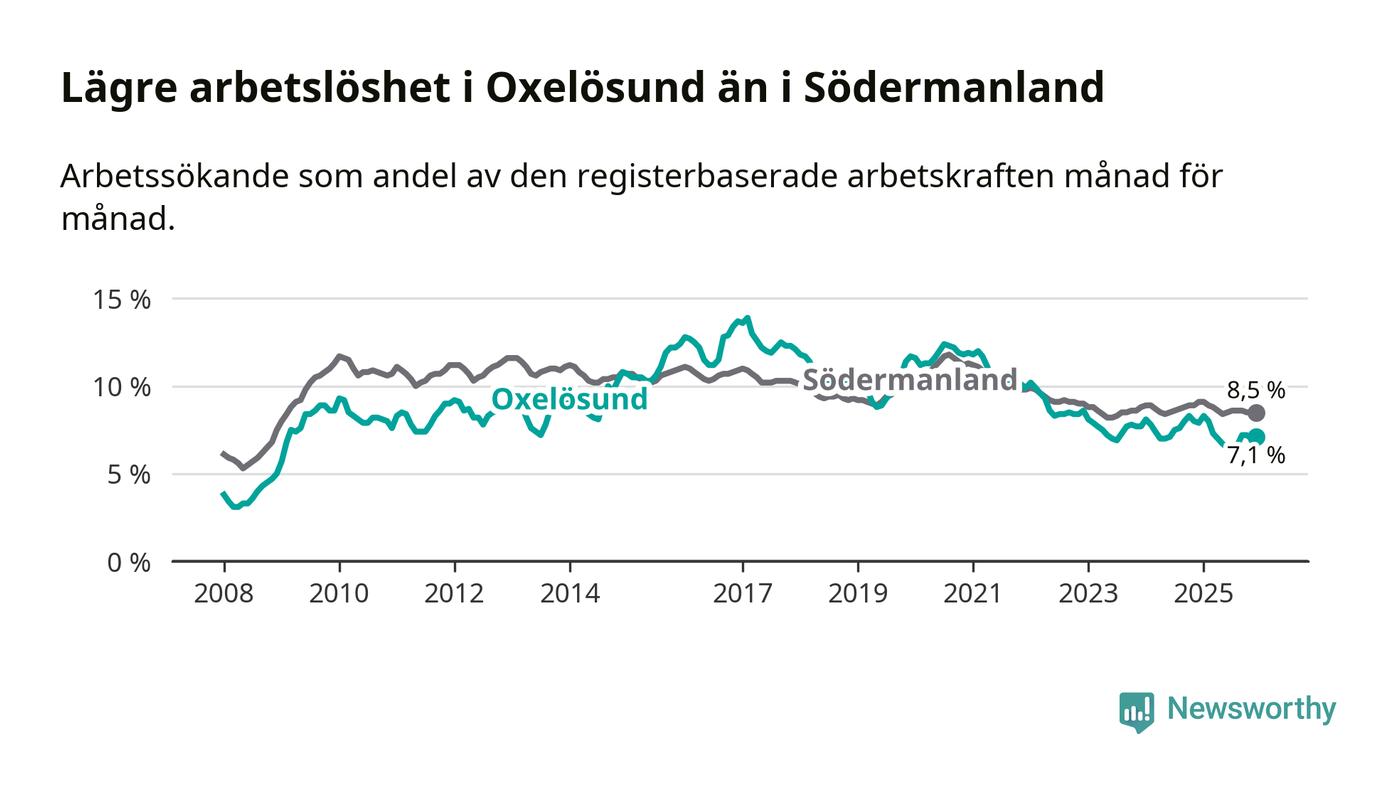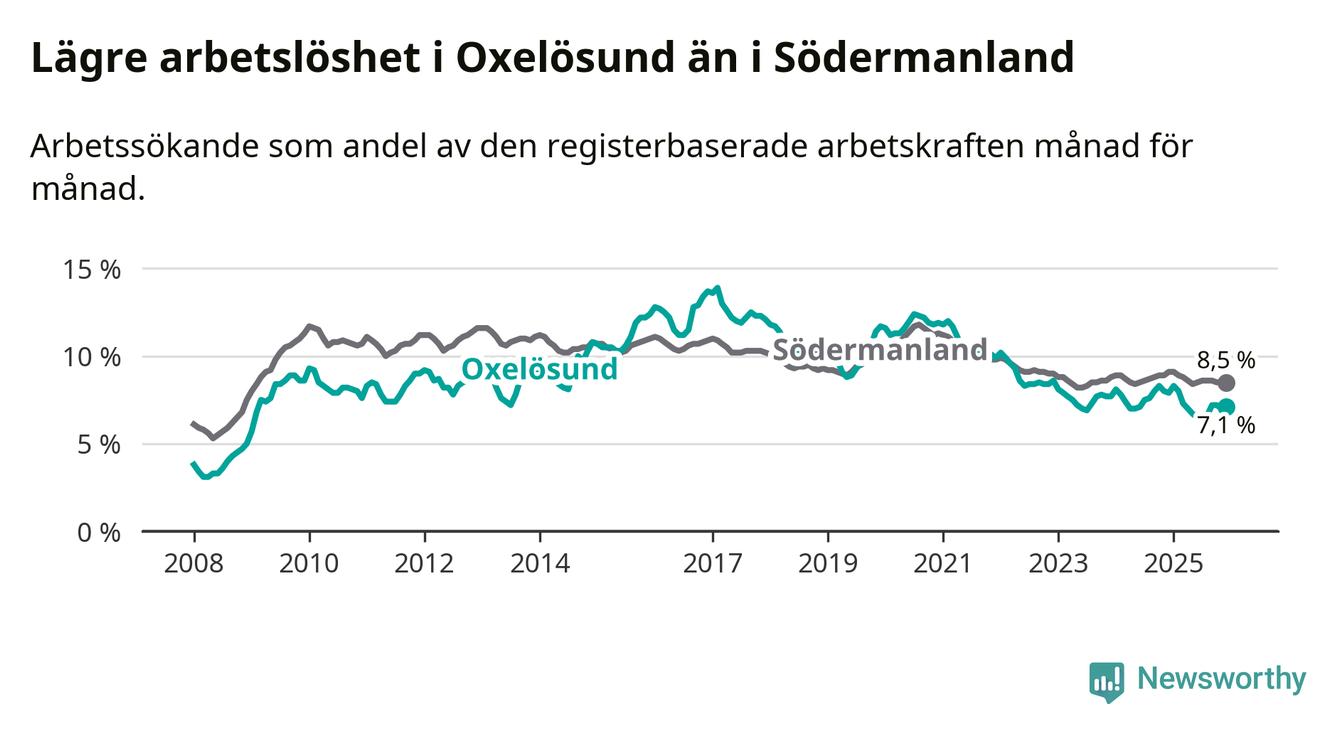 Under december månad rapporterade Oxelösunds kommun en total arbetslöshet på 7,1 procent. Det är en minskning jämfört med samma tidpunkt i fjol (−0,8 procentenheter). Även i Södermanlands län sjunker arbetslösheten .